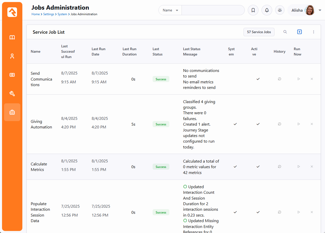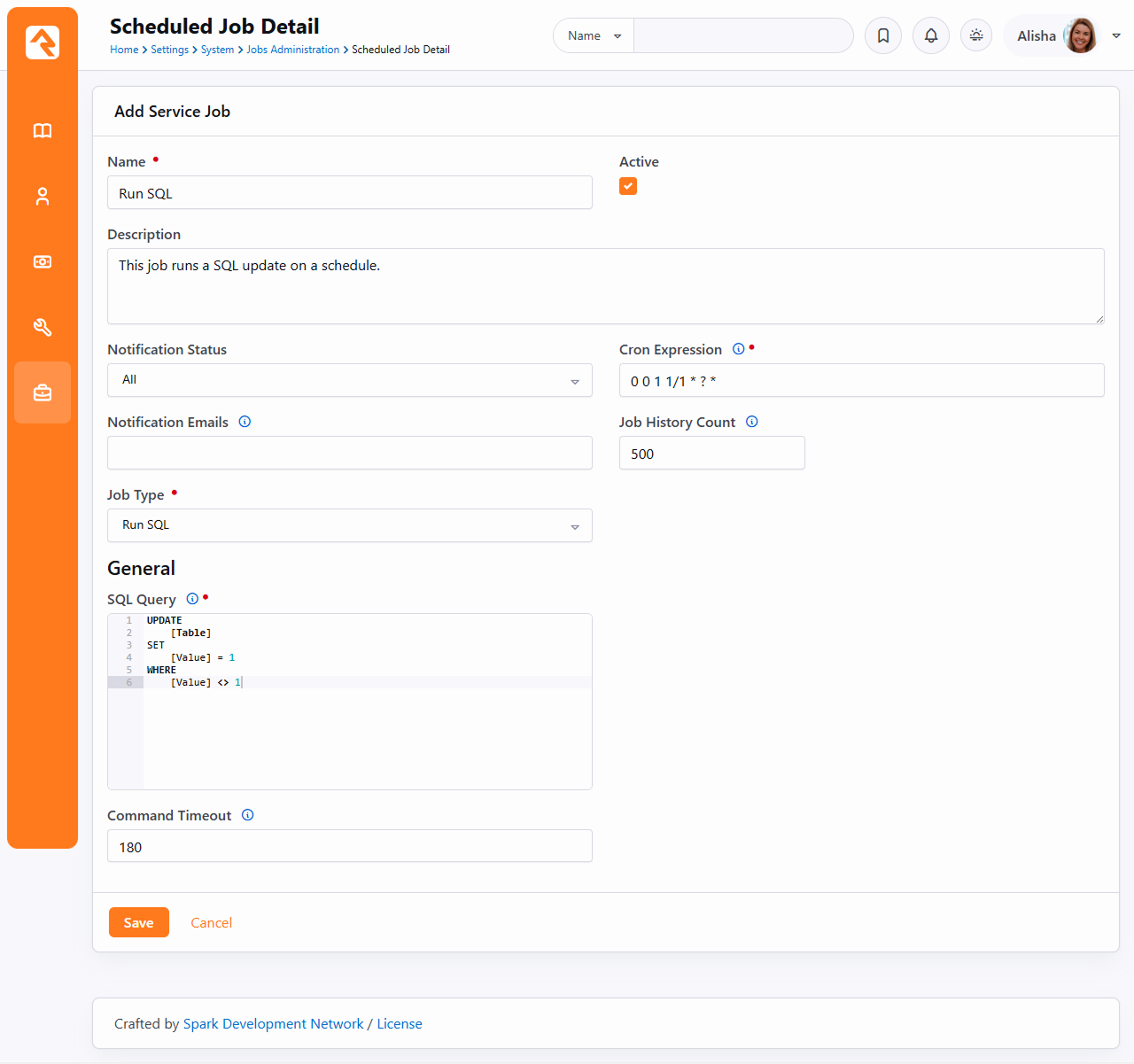 You can maintain current jobs or add new jobs under Admin Tools > Settings > Jobs Administration.There you'll see a list of currently configured jobs. You can click a job to modify the configuration or click the Add button in the grid footer to create a new job. Clicking on an existing job, or adding a new job, will bring you to the page pictured below. Name - Provide a concise description of what the job is doing.Active - Mark the job as active or inactive. Only some of the jobs that ship with Rock are active by default, so it’s a good idea to check these statuses to make sure everything you need is active.Description - Provide details about what the job does and any background criteria that you may want to know in the future.Notification Status - This defines when a notification email should be sent. Options are:Success – when a job finishes successfullyError – when a job encounters an errorAll – for both Success and ErrorNone – never Cron Expression - Cron expressions are a concise schedule pattern that defines when the job is run. They can be difficult to write without help. We recommend using the CronMaker.com website to assist you in creating these expressions.Notification Emails - This is a comma-separated list of emails for the job; used when a notification needs to be sent.Job History Count - On the Jobs Administration page, you can view the history of runs for each job by clicking the ti ti-history icon. By default, this is limited to the last 500 occurrences, but you can adjust how much history to retain here.Job Type - Select the type of job to run.Job Settings - Each job type will have its own set of configuration items. In the example pictured above, the RunSQL job defines the SQL statement that you want to run when the job executes. NoteNo Need to RestartWhen you add or modify a job there's no need to restart your website. Changes will be automatically updated within a few minutes. TipPause JobsThere will be times when you'll need to temporarily stop running a job. Instead of deleting the job and re-creating it later, simply inactivate the job until you’re ready to run it again.