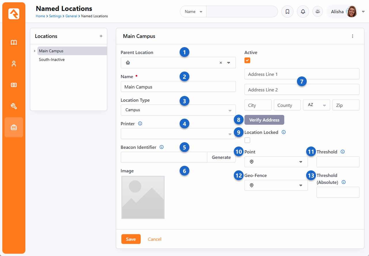 Locations are used in different contexts so there are different ways you might change a location's details. If it's a family's address on the Person Profile page then hover your mouse over the address and click on the ti ti-settings icon that appears to the right. If it's a named location, you can adjust it by navigating to Admin Tools > Settings > Named Locations as described above. Wherever you access a location, you'll generally be able to edit the same common fields (e.g., Address Line 1, City, State). However, there are some configuration options that are specific to the context of the location. For instance, below is an example of a Named Location. Here you can provide a Parent Location, a Location Type or an Image. But you won't see those options when you're editing a family's address or a group's meeting location. Keep this in mind as we cover the location configuration options pictured below. Parent Location - Not all locations will have this option. For Named Locations, this indicates where the location should be in the location tree to the left. Name - A critical element of Named Locations is the name assigned to the location. This identifies the location throughout Rock. Location Type - The Location Type is not only descriptive, but also has some functionality associated with it. For instance, only locations of type 'Campus' can be used when you're configuring a Campus. Printer - Named Locations can have a printer assigned to them. New printers can be added under Admin Tools > Settings > Devices. Beacon Identifier - Identifies the Bluetooth beacon device(s) associated with this location. Must be a value between 1 and 65,535. Used during mobile check-in. For more on this, see the Proximity Attendance documentation. Image - You can optionally add an image for the location, such as a photo of the location itself. This makes it easy to display the location along with its image.Address - Locations don't always need addresses. For locations like buildings or rooms, an address won't always make sense. It's different if you're working with a family's location, which should always use these address fields.Verify Address - With the click of a button you can verify (i.e., standardize and geocode) the location's address.Location Locked - In the prior section above we discussed address standardization and geocoding. If Location Locked is enabled, the address will not automatically be updated by standardization services. Enable this if the address would become incorrect when standardized. Note that enabling this does not prevent someone from manually changing the address. Point - Clicking here will open the Geography Picker where you can pick a specific spot on a map to associate with the location. Threshold - This is similar to a room capacity, and applies to check-in. If this threshold is reached, a manager override is needed to check in additional people.Geo-Fence - Similar to the above item, click here to reveal a map where you can draw a shape that encompasses any area you wish to associate with the location.Absolute Threshold - If this threshold is reached then no additional people can check in to the location. Unlike the above item, there is no way to override this limit.