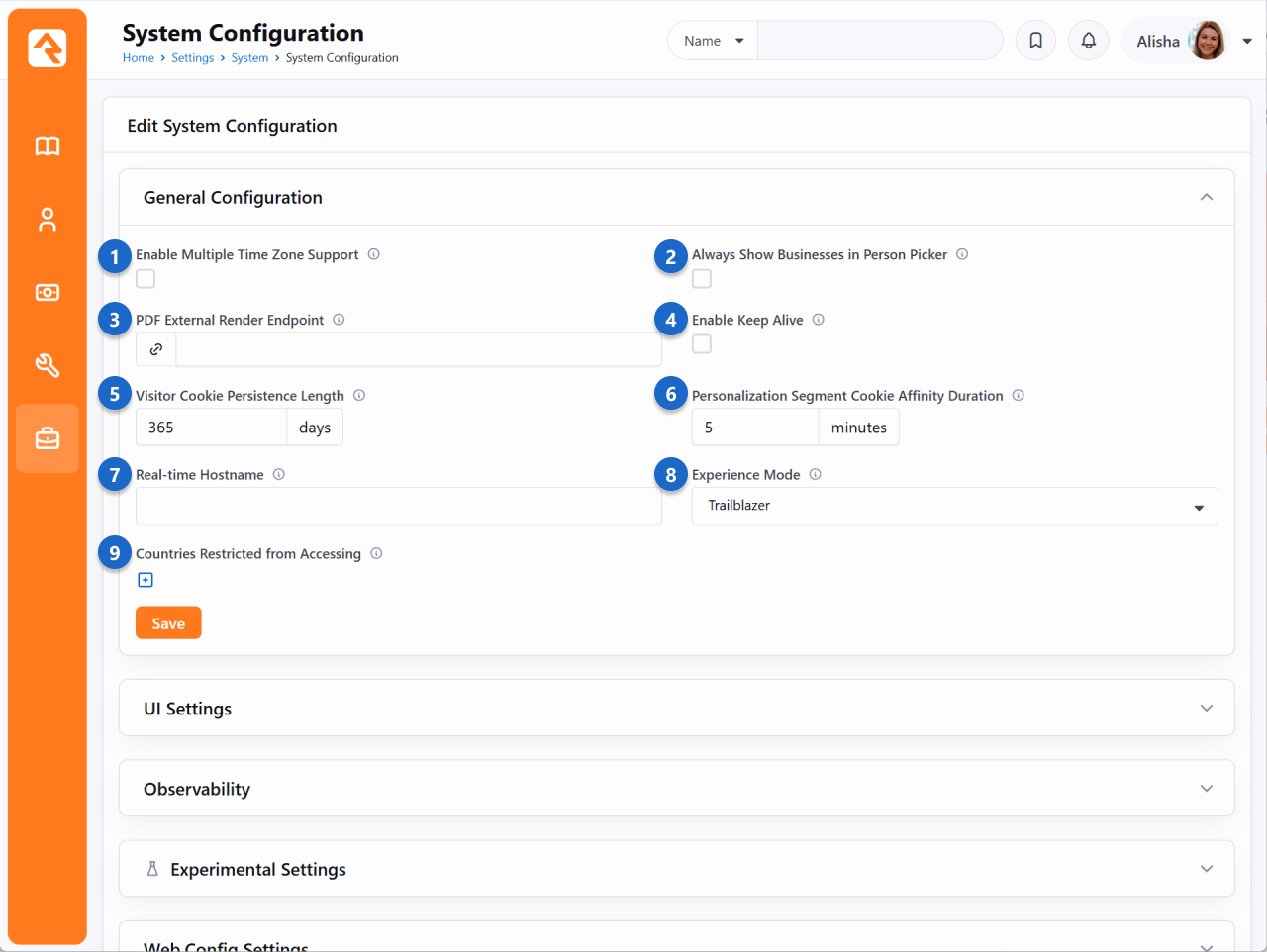 The System Configuration page allows you to change some technical configuration settings in Rock. For the most part you should never need to worry about these settings, but we've provided this page to help you change them if needed. WarningChanging these settings will cause Rock to restart. This means that all sites will be unavailable for a few minutes during the restart. Use caution when changing these settings. Enable Multiple Time Zone Support - Out of the box Rock assumes that all campuses are in the same time zone. There's typically not a big impact when they’re different, except for check-in. Enable this option to ensure check-in works as expected across different time zones.Always Show Businesses in Person Picker - If this is enabled then businesses will appear in the search results when you're using any Person Picker in Rock. That means if you search for 'Decker' you'll see Ted and his family, but you'll also see the 'Decker & Sons Plumbing' business returned.PDF External Render Endpoint - If you're running Web Services on Azure, or if you're running Rock in an environment that does not support running Puppeteer/Chrome on the server, you'll need a third-party service to handle PDF generation. This is where you'll specify the endpoint for this service.Enable Keep Alive - Enable this setting to have Rock poll itself to keep it "alive" during times of inactivity. This setting is not needed if your AppPool's Idle Time-out is set to 0 (Highly Recommended).Visitor Cookie Persistence Length - The number of days a visitor cookie persists. This is used by features like Personalization.Personalization Segment Cookie Affinity Duration - Controls how long the ROCK_SEGMENT_FILTERS cookie can be retained before it must be refreshed from the database. This only impacts Personalization features.Real-time Hostname - Overrides the default hostname used to connect to Rock’s real-time engine. Useful when routing through a proxy or CDN to ensure correct connections.Experience Mode - Choose the path that fits your organization. Essentials Mode simplifies your view to focus on people and giving. When you are ready for the full technical cockpit, switch to Trailblazer Mode. For more see our Essentials vs. Trailblazer article.Countries Restricted from Accessing - Block users attempting to access your site from the selected countries. For more info see IP Address Geocoding. Race Label - Some blocks, like Family Pre-Registration give you the option of collecting race and ethnicity information for a person (off by default). Here you can change the name of "race" to something else.Ethnicity Label - This is the same as the above setting but applies to ethnicity.Captcha Mode - If you're using Captcha, this is where you'll select which method to use for verification. See the Captcha article for details.SMS Opt-In Message - The message you put here will be seen on certain blocks (e.g., Family Pre-Registration) when a person is prompted to provide a mobile phone number if the SMS Opt-in feature is enabled for that block.Enable Default Address State Selection - If enabled, the Organization's state will be automatically selected when adding a new address using the Address controls in Rock. NoteObservabilityConfiguring Observability can be found in the Observability article. Starting Day of Week - By default, a week in Rock starts on Monday and ends on Sunday. It is possible, but not necessarily advised, to choose a day other than Monday to start the week. As noted on the page, this will impact things like SundayDate calculations.Security Grant Token Duration - This is simply the default length of time for which a security grant token is valid. Note that this is not the same as the Person Token Expire Minutes Global Attribute, which gets used with the PersonTokenCreate Lava filter.Revoke Grants - With the click of a single button you can revoke all security grant tokens that have been issued. Time Zone - When you were installing Rock you should have set your time zone. If you need to change it, you can do that here. Enable Run Jobs In IIS Context - By default, Rock’s job engine runs on the webserver. This setting allows you to disable this in order to run jobs as a Windows Agent. See the Jobs article for more information on this topic.Max Upload File Size - For security reasons, webservers limit the maximum file size that can be uploaded. This helps to limit the impact of denial of service attacks. Rock has set the default value to 100 MB. If you need more, you can update the size here.Login Cookie Persistence Length - Use this setting to override the authentication cookie length. The value you set will become the default for things like the REST API. This will impact how frequently a person needs to authenticate, so try to strike a balance between convenience and security.Enable Database Performance Counters - This setting should remain disabled unless you're actively troubleshooting a system performance issue. When enabled, and after the system restarts, Rock will start collecting data about the usage of your database "connection pool". Rock ships with a set of Metrics you can use to see the results of this data collection. These metrics can be accessed in Rock under Tools > Metrics | Hosting Metrics and will provide the information described below:Number Of Active Connections - The number of active connections that are currently in use. This number will naturally jump up and down during the day.Number Of Free Connections - The number of open connections available for use. This number will decrease as the number of active connections increases.Hard Connects Per Second - This is a count of how many connections are being opened explicitly each second. You might expect this number to rise when first starting Rock or when there aren’t enough available connections in the connection pool.Soft Connects Per Second - The number of connections being obtained from the connection pool per second. Note, it's possible 