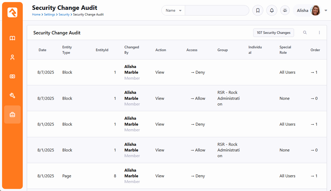 This page was designed to assist when troubleshooting security permission changes. Keep in mind that this tracks changes to item permissions, not changes to an individual's security. For instance, granting the role "RSR - Staff Worker" permission to view a page would appear in the audit log. Adding the role "RSR - Rock Administration" to Ted Decker's account would not appear in the audit log. However, an addition to the log would be made if Ted Decker were granted access as an individual (using Add User instead of Add Role) to the list of an item's permissions.