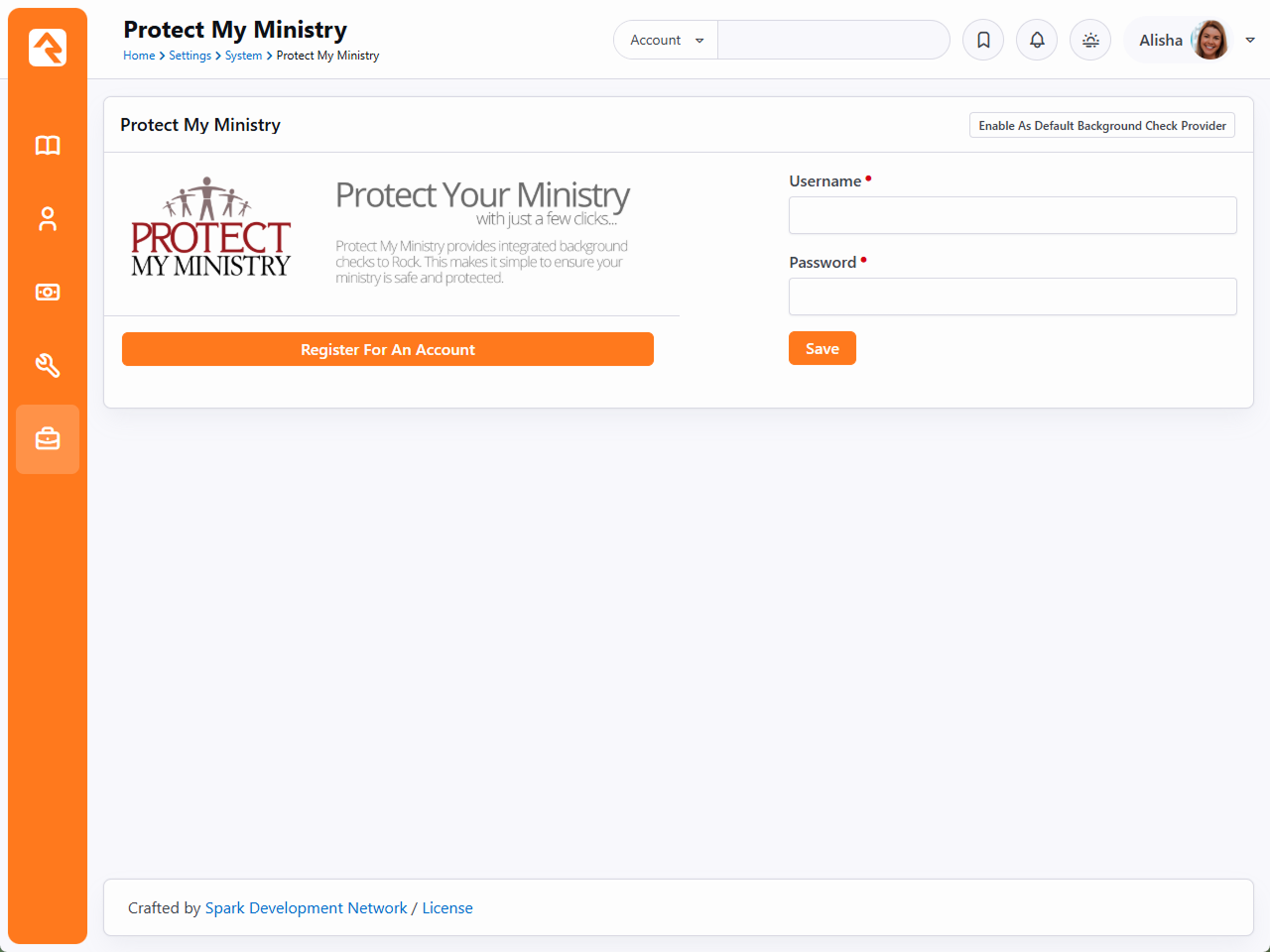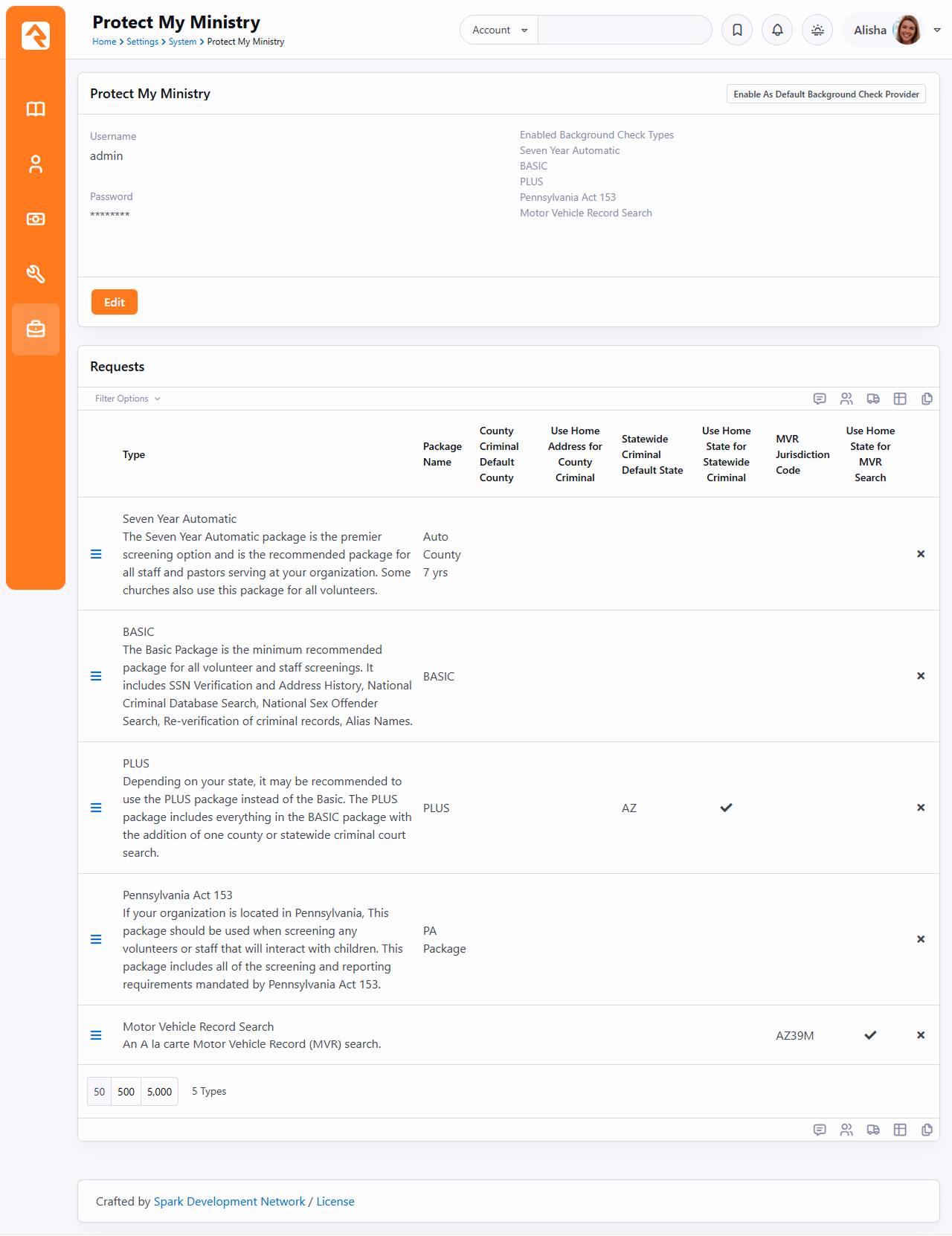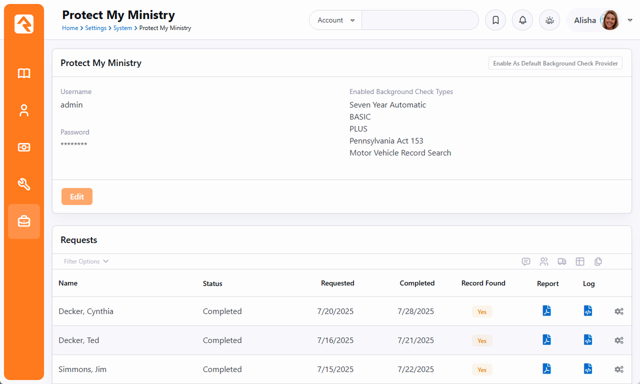 The second option for background checks is Protect My Ministry. Below are the steps for setting up and configuring this provider in Rock. Step 1: Sign-up The first step in the process is to sign up for the Protect My Ministry service. To do this, start at the Protect My Ministry page in Rock under: Admin Tools > Settings > Protect My Ministry. Should you choose to register for a new account, click the Register For An Account button. You'll be taken to the Protect My Ministry website to complete the registration. After completing the registration, come back to the Rock Protect My Ministry page and enter in the username and password you created. You'll then be taken to the Protect My Ministry Detail Page. Step 2: Configuration Once you've entered your account information in Rock, you’ll see the details of your account on the Protect My Ministry page. NoteThe Result Webhook setting will be populated automatically using your Rock Public Application Root Global Variable. However, this can be changed here if needed by clicking the Edit button. This address must be secured using SSL/TLS (must start with https://).Know that you can't simply change the http:// to https:// here, though, without having a valid SSL/TLS certificate installed and your web server configured properly. Google is your friend if you need help obtaining and installing a certificate. You'll now want to configure the packages that are tied to your account. The most popular packages have already been made available to you through the integration. Each package has a brief description that outlines its specific merits. There are several configuration settings for each package. Let's look at each setting and what it means. Package Name This is the PMM name for the package. It must be an exact match to what's in their system, so please don't change it unless instructed to.County Criminal Default County Depending on your state it may be recommended that you provide a county on your request. If so, this will be the default county to use if one isn't present on the address of the person you're checking. You can check your state’s requirements using Use Home Address for County Criminal This too will depend on the state in which you live. If your state is recommended for the county search, you'll want to enable this option.State Criminal Default State This is the default state to use when doing a state criminal request. This option is defaulted to the state that's most common in your database, but feel free to change it.Use Home State for Statewide Criminal This setting determines if the state from the address should be sent.MVR Jurisdiction Code This setting determines jurisdiction to use for MVR (Motor Vehicle Records) searches. You can select your area from the list provided. This is only needed for MVR type searches.Use Home State for MVR Search This determines if the state from the home address should be sent for the MVR search. This is only needed for MVR type searches. While you can add new packages using the settings above, the packages provided should meet all your needs. You may need to edit some of the configurations to meet the recommendations for your state. This decision centers around whether you should be doing a state or county search. Viewing Protect My Ministry Requests From the Protect My Ministry page you can also view requests that have been processed. This list allows you to see what's being processed from a high-level perspective. However, it's much easier to see the results of a specific background check request from the Workflow and Person Profile pages. We'll talk about that next.