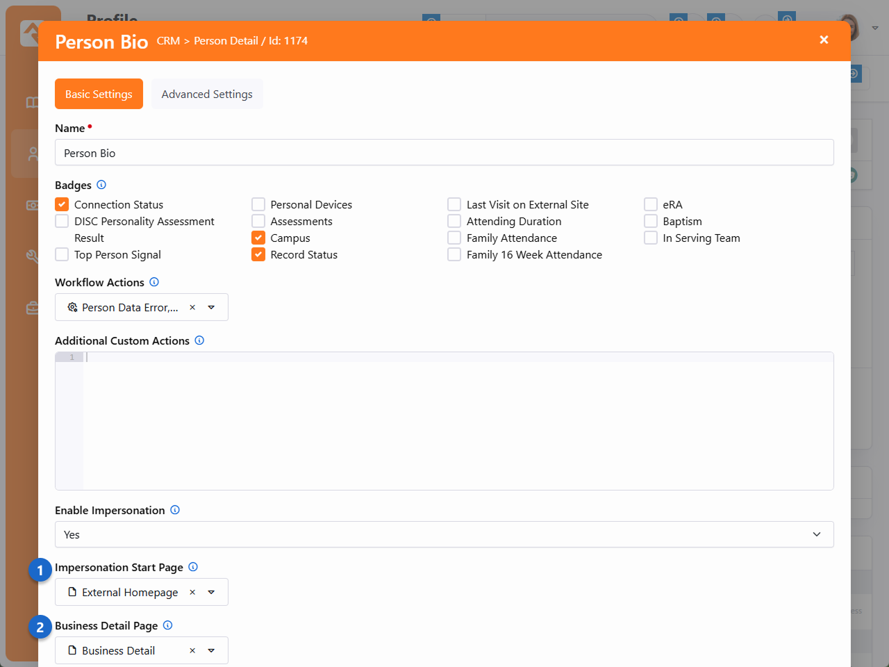 Impersonation is enabled in the Bio block settings of the Person Profile page. Enable Impersonation - To enable impersonation, select Yes in the Impersonation Start Page - You can configure Rock to automatically take you to a different page when you impersonate someone. Typically, you would want to set this to your public Rock site (see note below), but it can be any Rock site/page you desire. Once you’ve saved your block settings, you’re ready to impersonate another person. To do this, search for the profile page of the person you want to impersonate, click the Actions button in the upper right corner of the screen, and select Impersonate from the menu options. Rock will take you to the page specified as the Impersonation Start Page, and you’ll now view the site as that person. Keep in mind this means you’ll only be able to see what that person can see based on their security roles and permissions. Keep in mind that not every person can be impersonated. People with certain Account Protection Profile levels can't be impersonated, based on your Security Settings. Impersonation remains in effect until the browser session ends, you log out of Rock, or you click the Restore button in the admin toolbar at the bottom of the screen as pictured above. NoteIt's recommended that you set the Impersonation Start Page on the block to point at your public-facing Rock site if your primary use of this feature will be to impersonate attendees interacting with your public Rock pages. Failure to set a start page will cause Rock to remain on the internal site when you impersonate someone, which can lead to "access denied" errors necessitating a browser restart, because the person you're impersonating (most likely) doesn't have rights to the internal Rock site.