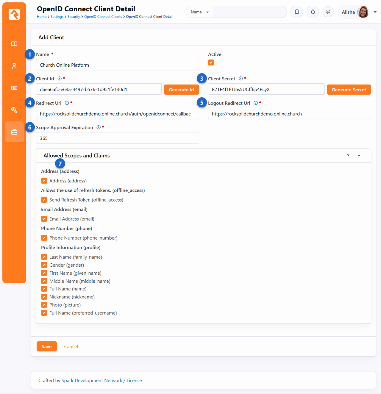 Let's see how to configure Rock as the authentication server for an outside system. You'll probably want to set up Rock at the same time you're setting up the client system. There's information Rock will need about the client, and the client will need some things from Rock, so it makes sense to have both up at once if you can. Adding OIDC Clients in Rock Each external system you're working with will need their own OIDC Client configuration in Rock. In the below example, we'll be setting up Rock to interact with Church Online Platform (ChOP). A little later in the next section we'll show you how things look in ChOP so you can see how everything connects. To start, navigate to Admin Tools > Settings > OpenID Connect Clients. From here you can view the clients you already have set up or add new ones to the list. In this example we'll be adding a new client for ChOP. Name - Be sure to provide a descriptive name, so you can easily distinguish between clients.Client ID - The Client ID is a critical part of what connects Rock and the client. It must be exactly the same for both systems or the process won't work. The Client ID should be created in Rock using the Generate Id button, and then copied from Rock to the client system.Client Secret - If you think of the Client ID as a username, then the Client Secret would be like a password. Like the Client ID, the Secret must match exactly between both systems and can initially be generated by clicking the Generate Secret button in Rock. You only get one chance to see the Client Secret when you first generate it, so if you lose track of it, you’ll need to generate a new one.Redirect Uri - After the person has provided their credentials, they will be redirected back to the client via the path indicated here. As you'll see in the next section below, this URI is provided by the client system.Logout Redirect Uri - When the person logs out of the client system, they can be taken to the URI listed here. In this case, we're using the "Church Online Platform Origin" provided by ChOP, but you can choose a different path. Just keep in mind that the client system chooses whether or not to use this URI. If you log out of the client system and aren't taken to the path provided here don't worry, it just means the client system isn't using it.Scope Approval Expiration - This is basically the amount of time, in days, that we're allowed to send someone's information. After this time period elapses, permission from the person (scope approval) needs to be obtained again.Allowed Scopes and Claims - This is where you can choose what information the client system can get from Rock. Keep in mind the client must specifically request this information. For instance, checking the ‘Address’ box doesn’t mean a person’s address will be sent to the client every time they log in. By checking the box, you’re saying that the external system is allowed to have that informationifthey request it. TipChanging Scopes and ClaimsIf you want to get really advanced, Rock lets you change the list of Scopes and Claims. You can access the OpenID Connect Scopes configuration from the OpenID Connect Clients page at Admin Tools > Settings > OpenID Connect Clients. Just remember that this requires coordination with (and possible changes to) the client system, to support the updates you make. Example Client System Setup Each client will be a little different, so it’s challenging to provide specific instructions that apply to any system that’s out there. In this section we’ll use Church Online Platform (ChOP) as an example client, but the same key points will apply to any system that supports OpenID Connect. First, you’ll need to log in to ChOP. If you don’t have a login, you can create one here. When you’re logged in, you'll need to access the Admin menu. If you're not already there, there's a button near the top-left where you can "Go to Admin". From the Admin menu, click "Integrations" on the left, then select "OpenID Connect” and click the “Set Up” button. You’ll then be brought to the page pictured below. This page has fields for information you’ll need to get from Rock, and it also provides information you’ll need to add to Rock. As we mentioned earlier, this is why it's a good idea to set up both systems at the same time. Callback URLIn this example we need to use the Callback URL from ChOP as the Redirect Uri discussed in the prior section. This will always be pointed to the client site.Church Online Platform OriginThe Platform Origin is sort of like a homepage. In this case, ChOP has provided us with the public URL that Rock Solid Church uses for our online services. This is a logical place to bring people when they log out of ChOP, so we've used this as our Logout Redirect Uri in Rock as shown in the prior section above.Issuer URIThis will be your organization's website. Specifically, this needs to be the Public Application Root in Rock's Global Attributes. If you're having trouble connecting with a client, try using https instead of http for your Public Application Root and make sure it exactly matches what's in the client system, including the /at the end.Client IDYou'll populate this with the Client Id that was generated from Rock, as described in the prior section above. It is critical to the process that the Client ID is exactly the same between both systems, so this is one of the first things you should check if things aren't working.Client SecretJust like the Client ID, this will be generated in Rock and then copied over to the client system. Also like the Client ID, the Client Secret needs to be exactly the same between both systems. Remember, Rock won't show you the Client Secret after it's been saved, so if you need it and can't access it, you'll have to generate a new one and copy it over to the client.Test ConfigurationChurch Online Platform gives you a handyTest Configurationbutton to make sure both systems can communicate with each other. If 