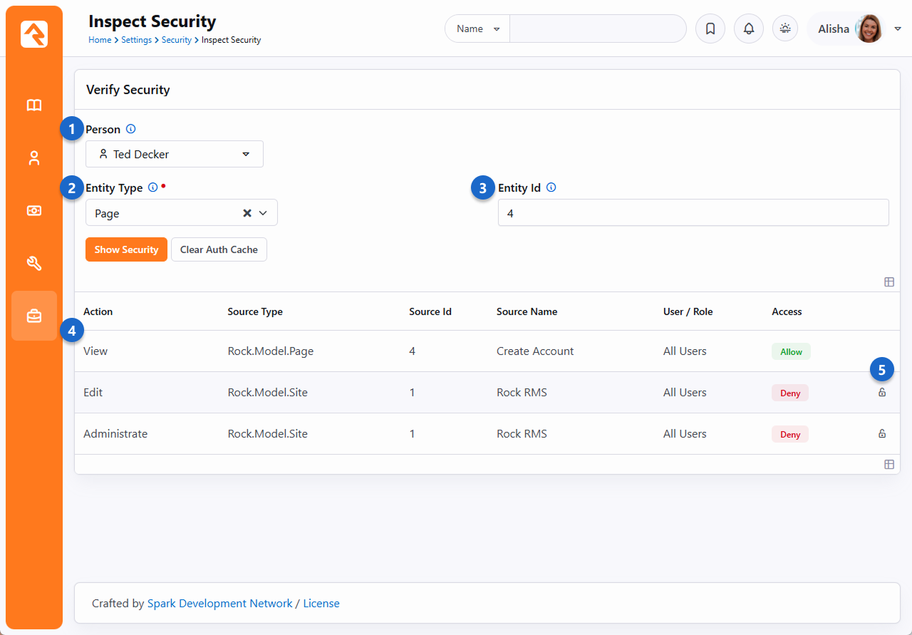 Wherever you see the ti ti-lock icon you can manage the security of the item being displayed. Clicking the icon will bring up the Security Editor shown below. Actions - The first thing you’ll see is a tabbed list of the security actions available for the item. Typically, these will be View, Edit and Administrate. You'll set permissions for each of these actions.Item Permissions - The Item Permissions area is a list of the specific permissions defined for the item. If there are no specific permissions set for this particular item, the list will be empty. In these cases, security is being inherited from its parent. But now we’re jumping ahead...Inherited Permissions - Most items don’t have permissions of their own. They inherit their permissions from their parents. For the most part, you’ll only add Item Permissions when you want to increase the security of the item. This is a very powerful concept. It keeps you from having to constantly and consistently tweak the security of each item. It also allows you to change the security of an item and let the change trickle down to all of its children. NoteThe Inherited Permissions list tells you which parent item has set the security. This allows you to easily find the parent and fix any incorrect security. Setting Permissions When setting permissions, you'll add either an individual or, more commonly, a security role to the permissions list with either Allow or Deny access. The order of these permissions is very important. The way the system works is that it starts at the top and works its way down the list looking for a matching rule. The first rule that matches the logged in individual will be implemented, either granting or denying access. Crafting the order of these permissions is important. Let’s look at an example. First, we’ll look at a case where a page should only be viewed by staff members (and not volunteers or other individuals accessing Rock). Incorrect Permissions: NameAllow / Deny All UsersDeny All StaffAllow The above setup might look correct at first because both roles exist with the proper access. It’s true that staff should have access and other non-staff users should be denied. However, remember that Rock works through security from the top down. Because Staff are also Users, the system will stop at the “All Users | Deny” level and won’t allow access. Correct Permissions: NameAllow / Deny All StaffAllow All UsersDeny Now the logged in staff person will match on the first rule and be granted access. Processing of the subsequent rule won't occur for this person, so even though the staff person is also in All Users, they will still be granted access. An individual without the All Staff role will cause the system to keep checking down the list, where it will find a match at the All Users level and deny access accordingly. Verifying Permissions There may be times when you want to view a quick snapshot of a person's security permissions. You can do this in the Verify Security block, found in Admin Tools > Settings > Inspect Security. PersonSearch for the person whose security permissions you want to view.Entity TypeSelect the entity type you want to verify. For example, if you want to view the security on a page, select 'Page'.Entity IDThis field is where you enter the Integer ID or Guid of the entity you want to view. For example, if you want to view the security of the external homepage (which has an Id of '1'), type "1" in this field.Security PermissionsThis is the list of security permissions for the person based on the search criteria.Unlock SecurityThis button allows you to quickly unlock security permissions. This snapshot view allows you to do a couple of handy things. First, it allows you to view the source of a person's effective security permissions. If, for example, someone should have access to a particular page or function but doesn't, the Verify Security block allows you to quickly view where the Deny rule is coming from. Keep in mind that the security permissions of particular entities (e.g., pages, groups, etc.) not listed here may cause additional limits to the person's access. Second, and perhaps more importantly, it allows you to restore your own permissions when you accidentally lock yourself out. Don't be embarrassed; it happens to everyone. The Verify Security block allows you to quickly unlock your access without having to go into the database. Simply click the ti ti-lock button.