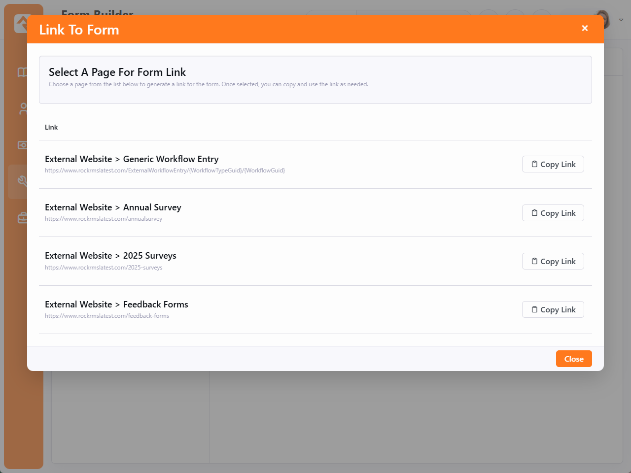 Each form has settings that are broken down into five areas. These areas can be accessed by clicking the corresponding tab near the top of the page when editing a form, or by clicking on an area when viewing the list of forms under Tools > Form Builder. So far, we've only been focusing on one of those areas, the Form Builder itself. Now let's take a look at some of the other features and functions that are available in the other areas. Submissions This is where you'll find a filterable list of the form's submissions. Clicking on one of the rows will bring you to the Workflow Detail page for that submission. The grid actions let you do powerful things, like launch a workflow for each submission. Communications After a form has been submitted you have two options for sending automatic emails. You can send a Confirmation Email to the person who submitted the form, and you can send a Notification Email to recipients of your choosing. In either case you have the option of using a pre-configured Email Template or a custom email that you create on the page. When you're working with an Email Template, you can choose from any of your System Communications assigned to the Form Builder category. To create a new template, or use one you've already set up, go to Admin Tools > Settings > System Communications. Be sure to assign the Form Builder category when creating the communication so it appears as an option for confirmation or notification emails. The Notification Email is a little unique. Here you have the option of sending the email to a Campus Topic Address. Campus Topics and the associated email addresses are configured for each campus under Admin Tools > General Settings > Campuses. Settings The settings area is divided into two parts, General Settings and Completion Settings. You won't make changes here very often, but you should be familiar with some of the options available to you. Name/Description - Here you can edit the name and description of your form. These are initially set when the form is first created. Don't skimp on these fields, as a clear name and description can help you and others identify exactly what this form is for.Template - If you built your form from a template, then the name of the template will appear here. You can apply a template to a form that was created without one, but best practice is to initially create the form using the template. You may need to refresh the form for changes to the template to apply. For more details see the Form Builder Templates section.Slug - Unique identifier for this workflow type, often used in links.Category - You can change the category for this form by selecting one from this field. By default, it will be the category that was selected when the form was initially created.Is Login Required - Enable this if the person must be logged in to complete the form.Form Entry Starts/Ends - People will not be able to access the form outside of the date range provided here. The start date is inclusive, so setting this to January 1st would allow people to access the form on January 1st. The end date is not inclusive, so providing an end date of December 31st means people won't be able to access it after December 30th.Completion Settings - When the person submits the form, you have two options for what happens next. You can provide a message that will be shown to the person on the screen, or you can redirect the person to the URL provided. Analytics The Analytics page lets you see, for a selected timeframe, how many times the form has been viewed and how many times it has been submitted. There is also a Conversion Rate indicator, showing the percentage of people who viewed the form and then proceeded to complete it. As noted near the top of the block, these statistics are only collected if the Workflow Entry block hosting the form is configured a certain way. Within the Workflow Entry block's settings, you'll need to enable Log Interaction when Form is Viewed and Log Interaction when Form is Completed to gather these statistics. Form Links Forms are only effective if people can find them—and Rock makes that simple. You can quickly share a form by clicking the icon and selecting Copy Link. You even have the option to choose which page to share from. NoteEnable Form SharingIf you don’t see a link to the page where you placed a Workflow Entry block, the block might not be set up for sharing. To generate a shareable link, make sure Enable for Form Sharing is turned on in the Workflow Entry block settings.