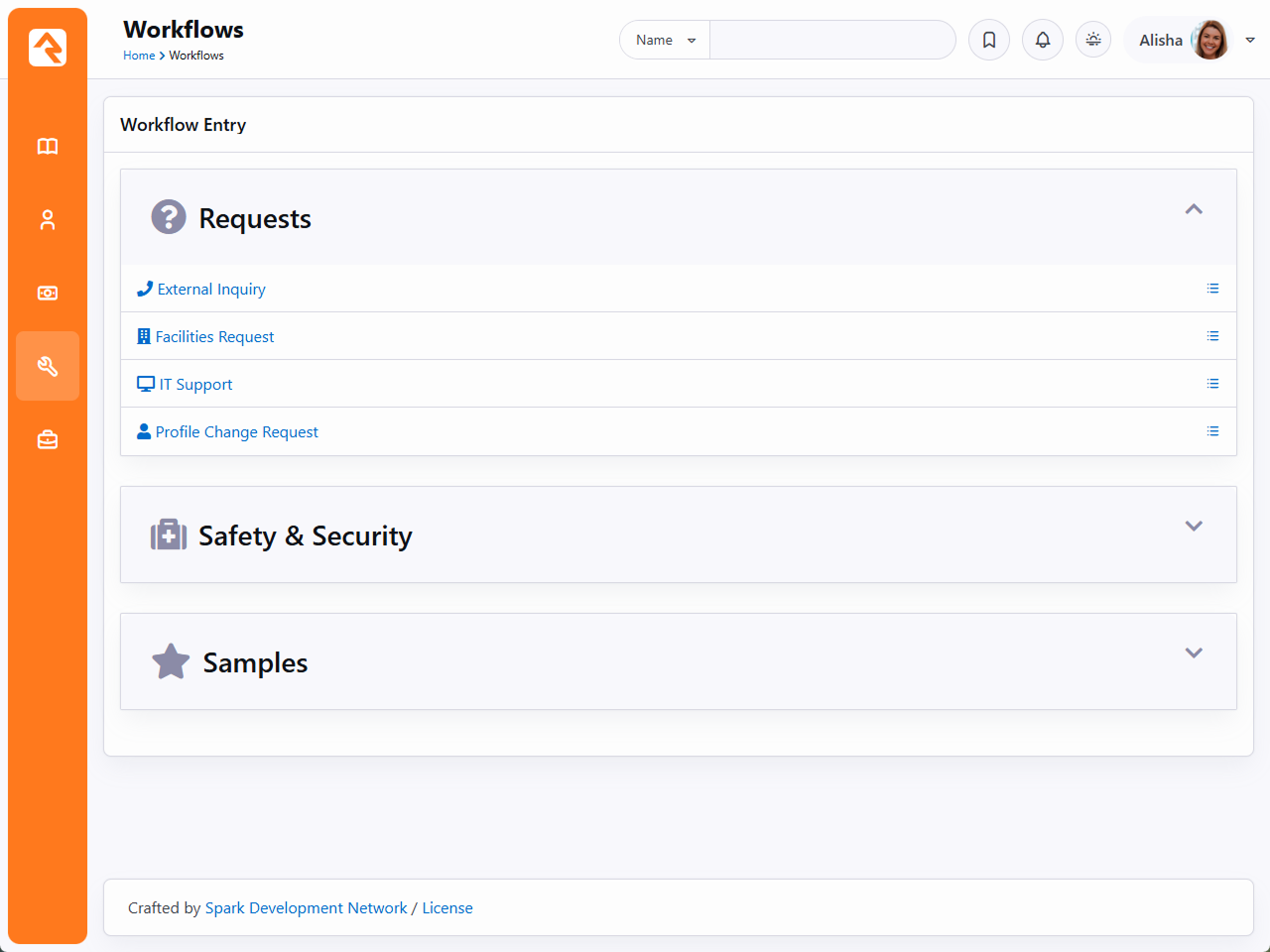 Workflow Entry Block Many workflows will start with a person filling out a form. This is certainly the case with workflows like IT requests, facility operations requests, HR approvals, etc. There are a couple of ways you can launch these types of workflows. Workflow Category Browser Rock ships with a workflow entry page under Tools > Workflows. This page displays a list of workflow categories with the ability to expand the category to view its workflows. Clicking on a workflow will launch it and show its first entry screen. You can configure which categories are displayed by modifying the block's settings. Category and workflow security will also be used to personalize the display to the specific rights of the person viewing the page. Direct Workflow Entry There may be times when you'd like to place a specific page in the navigation that takes you directly to a workflow entry screen. An example of this is the Contact Us page on the external website. This page has been configured with the Workflow Entry block. One of the block settings of this block type allows you to define a specific workflow type to launch when the page loads. This is a great way to include links to important workflows into your internal and external sites. The magic of this technique is that the person doesn’t even know that they are interacting with a workflow. Workflow Entry Block Settings Above we noted that you can configure the Workflow Entry block's settings to set a specific workflow to launch when the block is accessed. Let's take a closer look at that setting as well as the other block settings available for Workflow Entry. Name - This is simply the name of the block, which you can customize if you wish.Workflow Type - Here is where you can specify a workflow type for the block. Whenever the block is accessed, the workflow type you select will automatically launch and you'll be brought to an entry form. This is how the Contact Us example described above is configured.Show Summary View - Most of the time you'll want to keep this set to "No". Enabling this will display a summary of the workflow, showing who initiated it and when, instead of the messages that typically display after the workflow has been submitted/completed.Block Title Template - You can customize the title of the block using the power of Lava. By default, the Work Term configured for the workflow type is displayed.Block Title Icon CSS Class - If you want to display a specific icon at the top of the block you can add it here. Otherwise by default the icon associated with the workflow type will be used.Disable Passing WorkflowId - By default, a WorkflowId in the URL can be used to select the workflow that should appear in this block. However, you can disable this, allowing only a workflow GUID to be passed.Disable Passing WorkflowTypeId - This is similar to the above setting, but applies to Workflow Type Id. By default, a WorkflowTypeId in the URL can be used to select the type of workflow being launched from this block. You can disable this, allowing only a workflow type GUID to be passed.Log Interactions - You can log an interaction when the person first views a workflow form, and when the last form is completed. Logging interactions for both can give you insight into how long a form takes to fill out, or how many people start the form but don't finish.