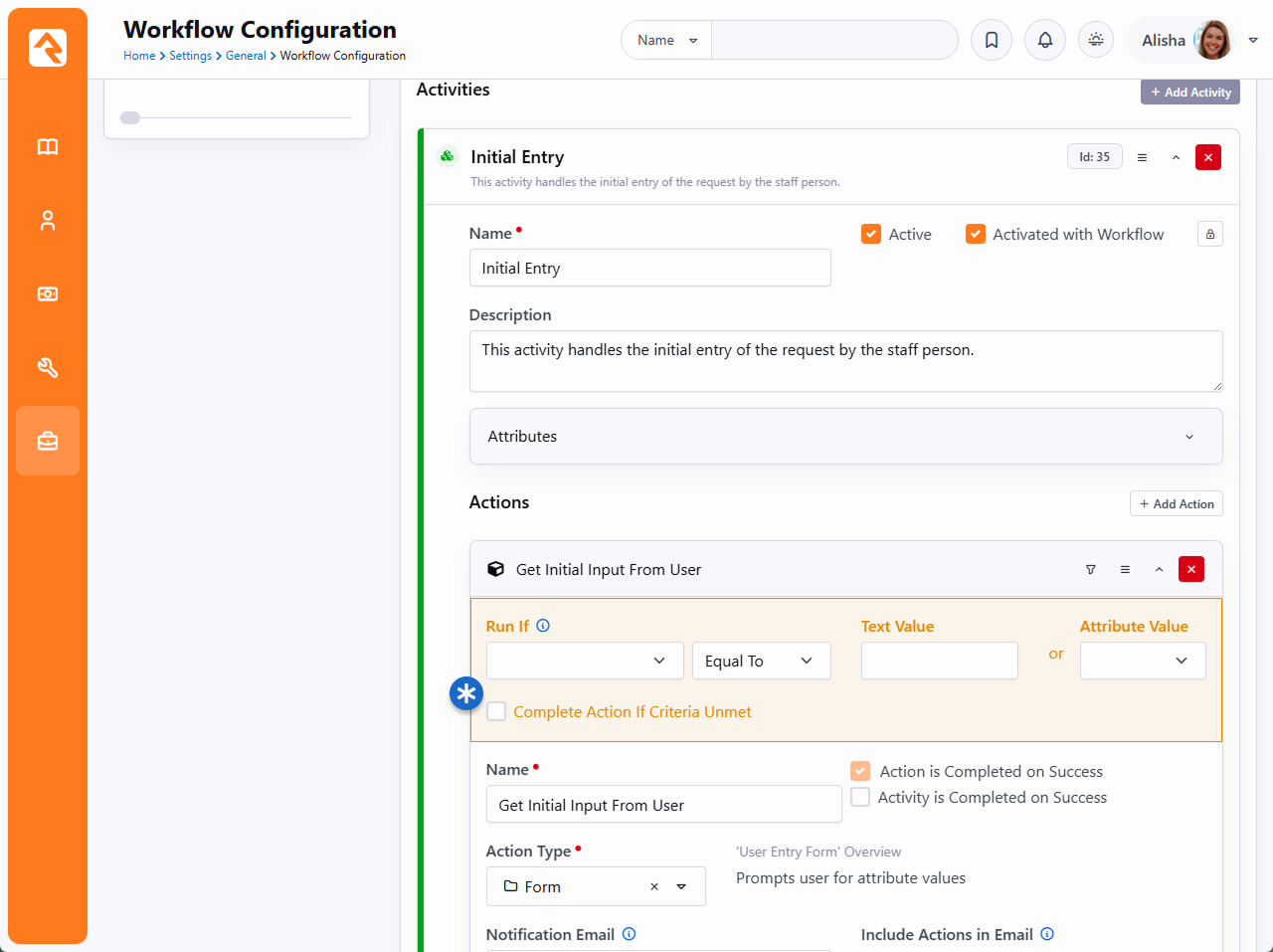 Activities are made up of Actions. Actions are the smallest unit of work in a workflow. Don't let their size fool you though. Like ants, they may be small, but they can move large objects by working together. Some examples of what actions can do are: Send an email.Set the value of an attribute.Present the person with a form to enter data.Run a SQL query.Activate a new activity. TipAction Order Is ImportantBe careful to define your actions in the right order because that's the order in which they'll execute. Configure Actions While each action type will have configuration settings unique to its purpose, all actions do share some similar configuration settings. Let's look at these common settings. They can be found by clicking on an activity in a workflow configuration. Name - The name is used to help describe the task the action is performing within the activity.Action Is Completed On Success - This tells the workflow engine if the action should be marked as completed when it runs successfully. For most actions you'll want to be sure this is set to 'True'. But there may be times when you want an action to be performed every time the workflow is processed.Activity Is Completed On Success - This setting tells the workflow engine to mark the entire activity as complete if the action successfully runs. This has the effect of keeping all following actions from running. If you are familiar with programming logic, this is similar to a break statement.Action Type - This is where you configure what type of action you want to perform. There are many different types of actions, each with their own function. We have each type of action documented for you in the Workflow Actions Documentation.Assign Message - The message that is displayed based on the Action Type selected.Person Picker - The person picker is here because of the selected action type. Different fields will appear in this area depending on the type of action that's been chosen. Use Action Filters We learned about ways we can control the flow of actions inside an activity in the previous section. Action Filters provide us with another powerful way of controlling the flow logic of a workflow. They allow you to only run an action if the value of an attribute meets a criterion you define. When an action has a filter configured, the filter icon will display in yellow to help you know that a filter is present. Although most of the filter match criteria are self-explanatory, the Regular Expression is possibly unfamiliar to you. Simply put, a regular expression is a sequence of characters that define a search pattern and using them you can achieve powerful text matching. For example, if you wanted to match a prayer request text for the phrases "suicide", "SUICIDE", "kill himself", "kill herself", or "kill myself" you could use a regular expression value of (?i)(suicide|kill (h|m)(\S+)(\s*)self). You can find a Microsoft Regular Expression Quick Reference online and use a tool like https://www.debuggex.com/ for testing your new creations. NoteKnowing the text value of an attribute is key when setting up filters. For text attributes this is pretty straight forward. For other types of attributes, you need to know more about their internals. For instance, a 'Boolean' attribute's text value would be 'True' or 'False' while a person attribute would be the GUID of the person alias. The full list of different attribute field types can be found here. Sometimes, a workflow action might not be able to finish its job. This could happen because the "Run If" conditions needed to run the action aren't met. To help your workflow run smoother in this case, you may consider enabling the Complete Action If Criteria Unmet option. When you turn this on for a specific action, Rock will automatically mark the action as "Completed" even if the conditions aren't met. This way, you won't have to worry about unfinished business. Note, when an action is completed this way, Rock will keep a record of it in the workflow log. The log will show that the action couldn't be finished but was marked as complete. Default Action Types For a listing of Rock's workflow actions, see the Workflow Actions Documentation. There we outline a number of actions that come with Rock, providing tips on when and how to use them. Screenshots of the settings are also provided. NoteA Note About Check-in ActionsMany of Rock's workflow actions are specifically used for check-in workflows. We won't be covering them in this manual since very few people will be using them.