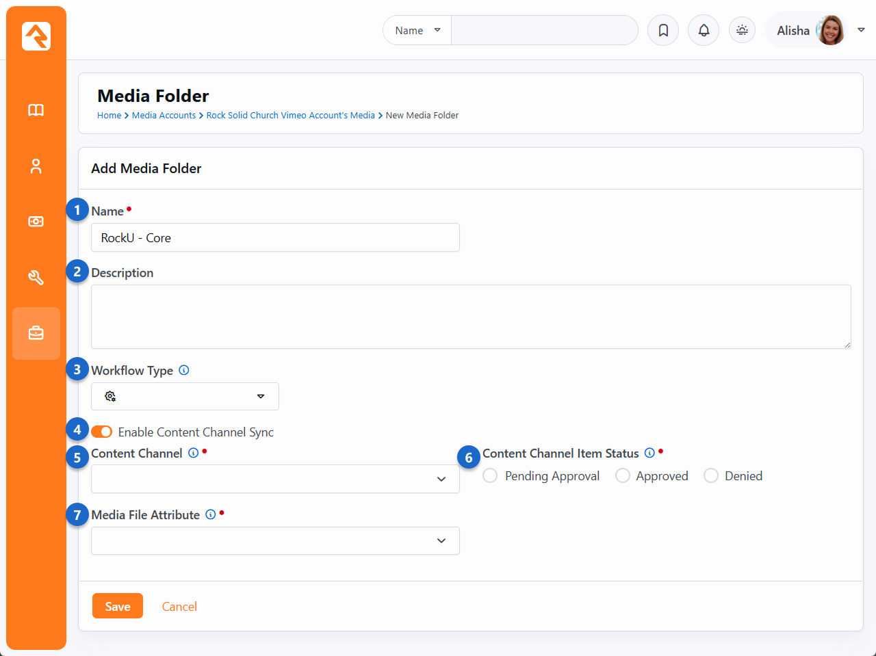 It all starts with the Media Account. If you have media coming from different sources, like YouTube or Vimeo, then you’ll need a separate Media Account for each. Typically, your first step will be a visit to the Rock Shop. There you'll find the plugins you'll need to sync Rock with your external video hosting provider. Our examples in this guide use the Vimeo plugin, but you could also use the YouTube plugin. More may be added in the future by plugin developers. To add or manage accounts, navigate to Admin Tools > Settings > Media Accounts. Click the ti ti-plus button to add a new account. Refer to the plugin documentation for details on initially setting up your Media Account, typically requiring getting an API key. Out of the box Rock ships with a Local Media Account Account Type that you can use to manually set up video and audio assets. To add this account simply give it a name and select Local Media Account as the Account Type. Keep in mind that if you're using the Local Media Account it will be a very manual process. You'll need to create the folders and meta data yourself, which is all automated if you're using a video provider plugin. Media Folders and Media Elements Rock uses Media Folders to group and organize individual Media Elements. For instance, the screenshot below shows the "RockU - Core" folder, which contains several videos (i.e., Media Elements) like the one for Campuses described at the start of this chapter. The video service provider plugin that you're using will automatically create and manage your folders and elements for you. This is done through Rock's Sync Media job. This job will go out to your external video provider account and update Rock with additions or changes you've made. That means when a new folder or video gets uploaded to your account you don't need to do anything to get it added to Rock. For each Media Folder you can choose what happens when new videos are added. For instance, you can have Rock automatically create a new Content Channel Item for the new video. You can also launch a workflow to perhaps alert someone that the new Content Channel Item needs their review. Let's take a closer look at these options. Name - The folder name will be automatically synced over from your video service provider. In these cases, you won't be able to edit it from within Rock. If you're using a Local Media Account this would need to be created manually.Description - Like the folder's name, the description (if one exists) will automatically be synced over to Rock, where it can't be edited. A detailed description helps ensure the purpose of the folder is clear.Workflow Type - A workflow can automatically be launched whenever new media is added to this folder. This is a great way to alert people in your organization that a new video has been added. The Media Element entity is passed as the workflow's entity.Enable Content Channel Sync - If this is enabled, then you’ll see the next three settings described below. Syncing with a content channel means that a new Content Channel Item will automatically be created for new media elements that get added to this folder.Content Channel - This is where you’ll select which Content Channel to add new Content Channel Items to when new media files are added to the folder.Content Channel Item Status - You can select which Status the Content Channel Item should be when it is created. Typically, you'll want this set to "Pending Approval" to make sure someone can review and edit the item before it gets published to your website.Media File Attribute - The Content Channel you use must have an Item Attribute of type "Media Element". This is how the new media element will be stored on the new Content Channel Item that gets created.