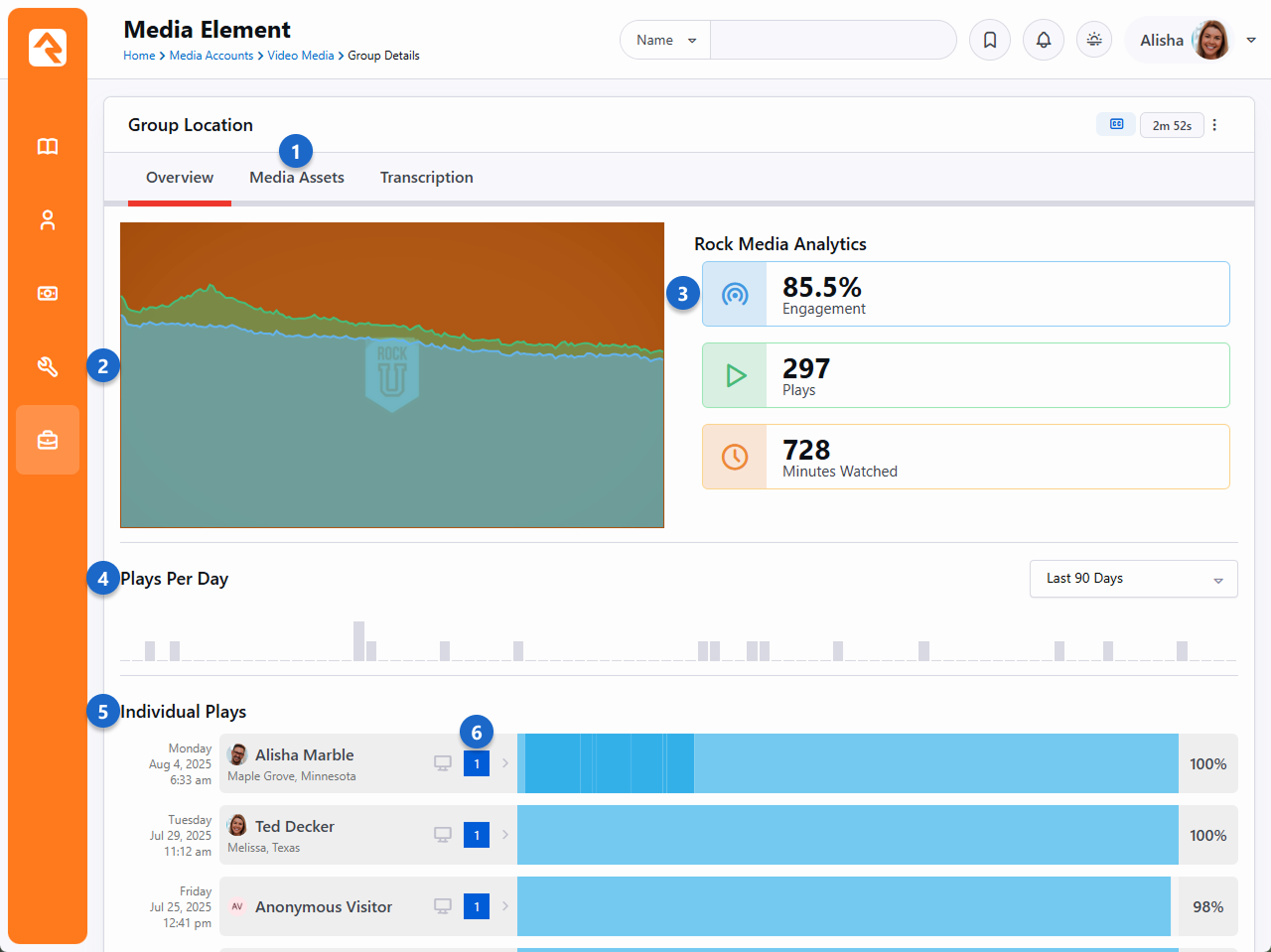 Let's start by taking a look at the wealth of information available at your fingertips from the Media Element analytics page. From here you can see who engaged with a video. As you learn about this page, you'll find it quickly becoming a critical part of your digital strategy. You can navigate to this page by going to Admin Tools > Settings > Media Accounts > [Your Account] > [Your Folder] > [Your Media Element]. For instance, in the screenshot below you can see engagement on a sample training video. The graphs overlayed on top of the video show us a spike in engagement and rewatches near the beginning of the video, telling us something important happened there (that's where the navigation to the Campus configuration is provided). Pretty insightful, right? Imagine how your digital strategy could be informed by the knowledge you gain about what people are actually watching in each of your videos. What's more, you can move your mouse over the video to view the thumbnail at any given point in the video, telling you exactly what content people are engaging with. We can also see overall engagement, a play count, and the total minutes watched. The Plays Per Day graph is a great tool for easily monitoring engagement with your video over time. Down below we can also see Ted Decker watched 100% of the video and, shown in dark blue, rewatched certain portions near the end. On the other hand, an unknown person watched 88% of the video, having skipped over the first part. Having this level of detail for each individual is something you won't find with other digital media services. View Media Assets - Click this button to view the files associated with this Media Element. This is where you can see details about the different types of files (e.g., HD, SD, HLS) and thumbnail images for your media.Video Engagement - In this area you can see the video itself, with two timeline charts overlayed on top of it. The green line represents rewatches, which counts how many times a portion of the video has been watched more than once. The blue line represents engagement, showing what percentage of people who engaged with the video have viewed a particular portion. Hovering your mouse over either of the lines will show the engagement percentage or rewatch count for that point in time in the video.Rock Media Analytics - At a glance you can see vital statistics for the video. Engagement is a measure of how much of the video is watched on average. You can also see the total number of times the video was played, and how many cumulative minutes have been watched.Plays Per Day - This bar chart shows how many times per day this video has been played. This makes it easy to identify viewing patterns and gauge the overall popularity of your video over time.Individual Plays - At the bottom of the page is a listing of everyone who has watched the video. More than that, you can see when they watched it and how much of it they watched. You can even tell if the person skipped around in the video and only watched certain portions. The areas in darker blue show points in the video that were rewatched by the same person.Session Information - In this area of the individual plays, you can see an icon indicating whether the media was viewed from a desktop or a mobile device. In the blue circle you can see a count of the number of interactions that the person logged. Hovering your mouse over the ti ti-chevron-right icon will expand the info pane to also show information about the Internet Service Provider (ISP), operating system and browser the person used. Bringing this all together, simply looking at the analytics and engagement patterns brings you insight into why some videos are more popular than others. It could be that certain speakers or specific topics garner more engagement than others. With all of this data provided for you, you can easily find where to refine your digital strategy to increase engagement. There's another feature we should mention here that you can't actually see but is very important (and pretty cool). Rock's Media features work across platforms. That means someone can start watching a video on mobile, then switch over to web and pick up right where they left off, even days later. You can choose to have those separate watches combined into a single watch or multiple watches on the analytics page by a simple update to the Media Player shortcode Lava, which we'll discuss later.