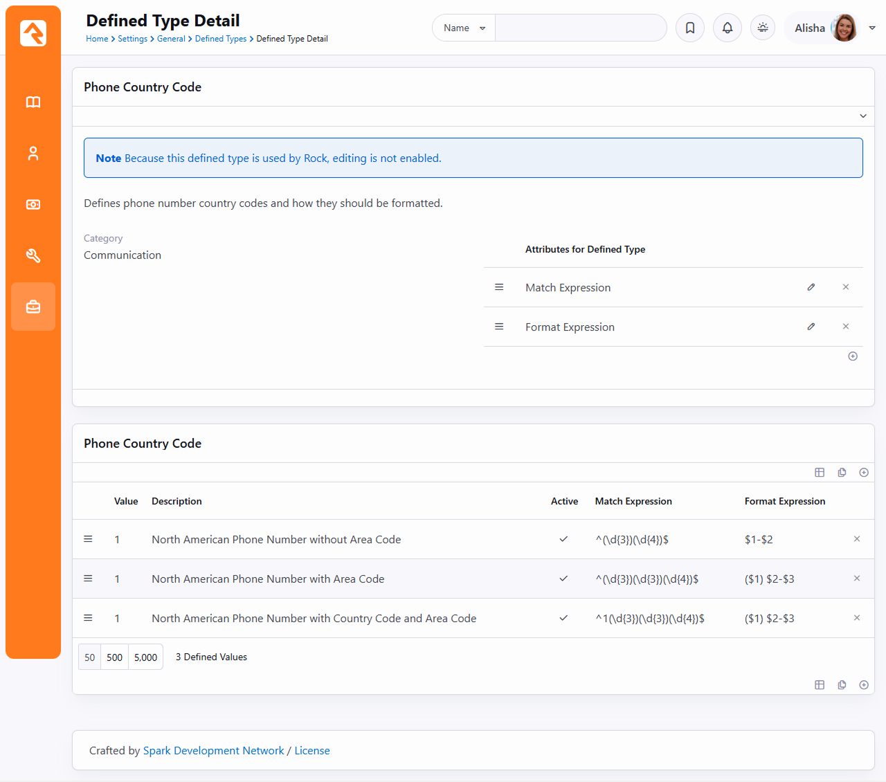 Post-install, Rock is configured to support only US-formatted phone numbers. When only one country is configured, the phone entry field looks like the example below. This field can easily be adjusted to support other countries. Simply add country specific formatting fields to the Admin Tools > Settings > Defined Types > Phone Country Code defined type. Each new entry should have the following values. Value: This is the country code that's used when dialing the number.Description: A short description of the phone formatting pattern.Match Expression: This is a regular expression that's used to match the value you entered and apply the correct formatting to it. For instance, a seven-digit number in the US would match the formatting rule 555-5555 while a 10 digit number would match to (555) 555-5555. Formatting Expression: This string is used to apply the formatting to the matched number. Each grouping of numbers is represented by a $#. TipYou can find more information on the formatting of phone numbers for specific countries on Wikipedia. We've also started a short list of best practices that have been shared by other Rock community members. You can check them out at http://www.rockrms.com/InternationalPhones. Once you add a second country, the phone number field will change a bit in look. You'll notice the addition of a country code selection at the beginning of the input. The phone country code listed at the top of the defined type list will become the default country code, so in the screen shown above grab the hamburger grips to the left of each entry and drag them up and down the list as you desire. NoteFormatting Phone Numbers on the Person Profile PageThere's a setting on the Bio block used on the Person Profile page that enables the country code to be prepended to all phone numbers. Enabling this setting may help the formatting for many international organizations.