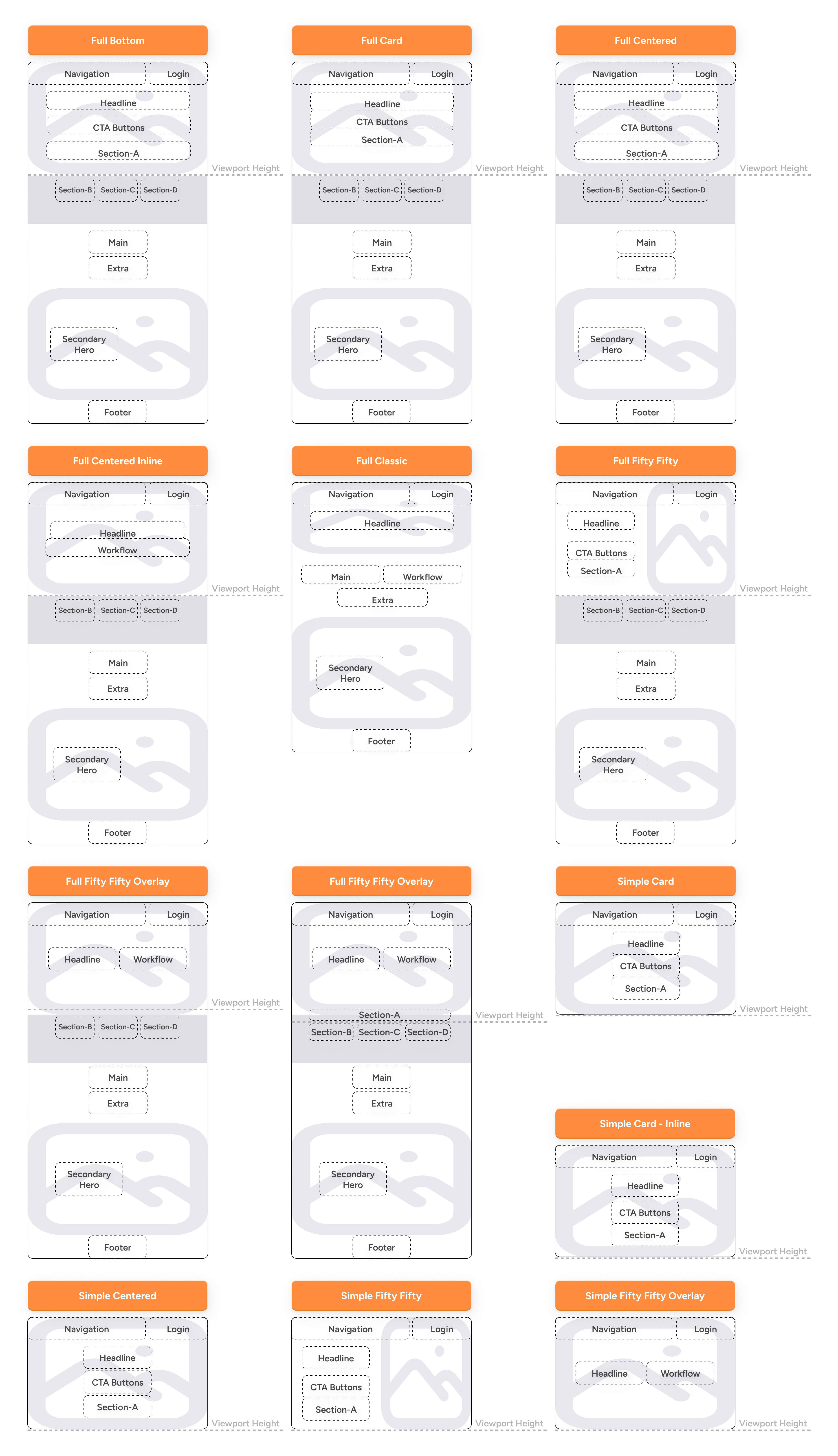 As we mentioned in the last article, Landing Pages have a few more layouts than other site templates. Here are some thumbnails of the layouts available to you along with the available zones, so you can decide which layout to use for your new page. Notice that some pages are designed not to scroll (those called "Simple") and will adjust to the height of the browser they're loaded on whenever possible. Most of the "Full" layouts have hero image sections based on the height of the browser (which is labeled "Viewport Height" on these thumbnails). You don't have to have content in all of the zones shown; they're simply available to you to make sure you can easily add any blocks to the page where you want them to lay out. Any of the layouts with two image placeholders will use both the Header Image and the Secondary Image you specify in the Page Attributes.