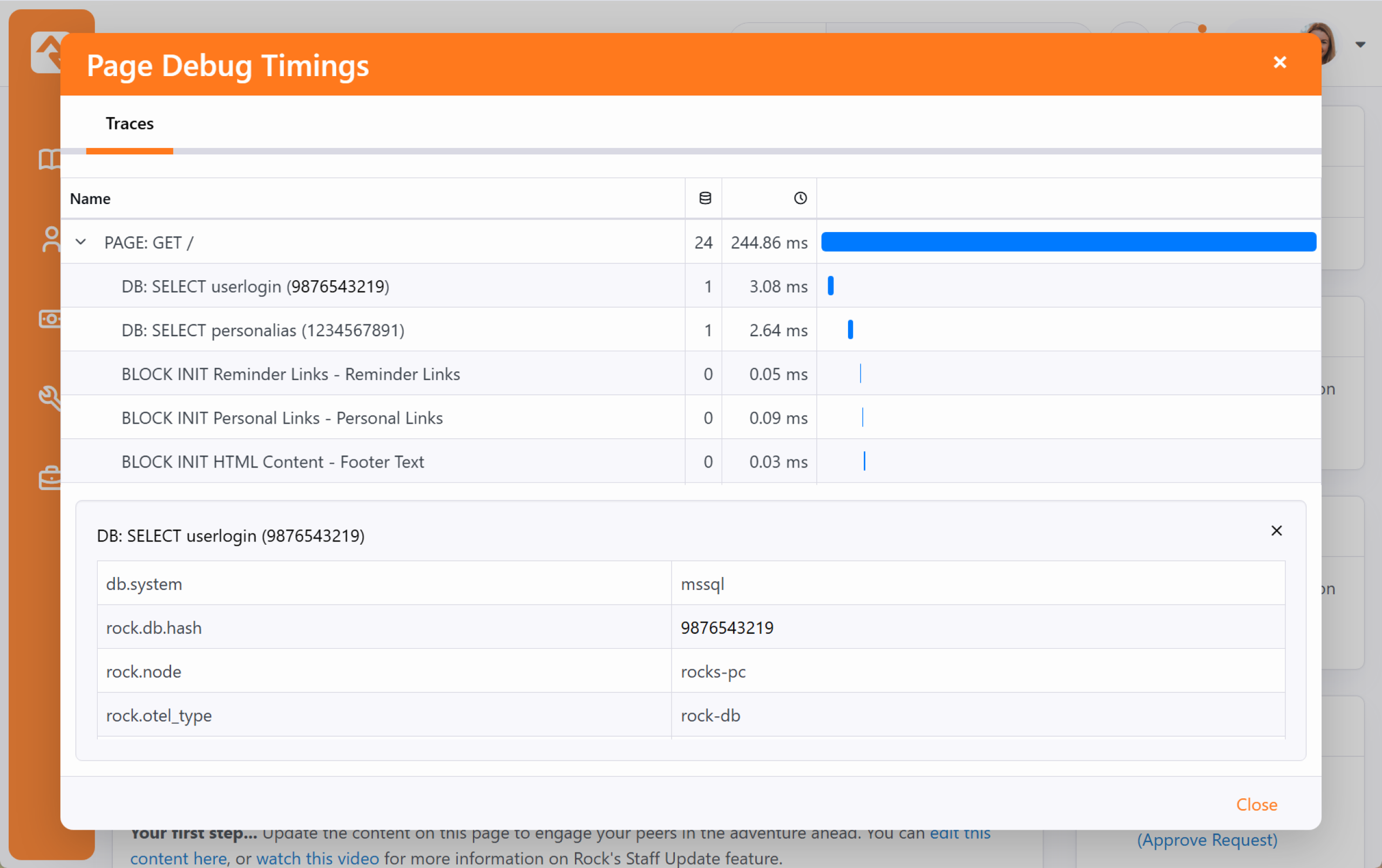 When we started to plan for Rock, we listed out our high-level goals for the project. One of these was "Speed as a Feature." For us that was more than just words, we wanted it to be real and measurable. One of the first features we added was the page load time in the admin bar. From that moment on speed was put in front of us on every page we loaded. We kept it there, not only as our contract with you, but also so you could measure your custom modifications. Think of the Page Load Time tag as a window into how your site is performing. When you click it, the Page Debug Timings show you a map of everything the server did to build that page. Page Debug Timings When you click the Page Load Time tag, the page will reload to gather the latest data. The Page Debug Timings window then opens, showing you a map of everything the server did to build the page. If a page feels slow, this list helps you find the exact block or database query that is causing the delay. It turns the "invisible" work of your system into a clear trail you can use to make your site faster for everyone. This feature uses the same data gathering system that powers the Observability tools in Rock. It is like having a simplified version of those tools without any of the configuration. The top-level items you see, like PAGE: GET /, are network requests. These represent the initial communication between the person's browser and your server to start loading the page. Each row below those requests is a task trace. This is a list of every specific task the server performed, such as looking up a person or calculating a total. When you click on a trace, the system shows even more detail, like the exact database query or piece of code that ran. If a page feels slow, look for the rows with the largest numbers. These are your bottlenecks. A single task, like BLOCK INIT Reminder Links, might be doing a lot of work behind the scenes (like checking cache) to keep things moving. By finding the specific block taking the most time, you can make changes instead of guessing. When your site is fast, the technology stays out of the way so your team can focus on their work. Now that you know how to find the heavy parts of your pages, you are ready to start tuning.