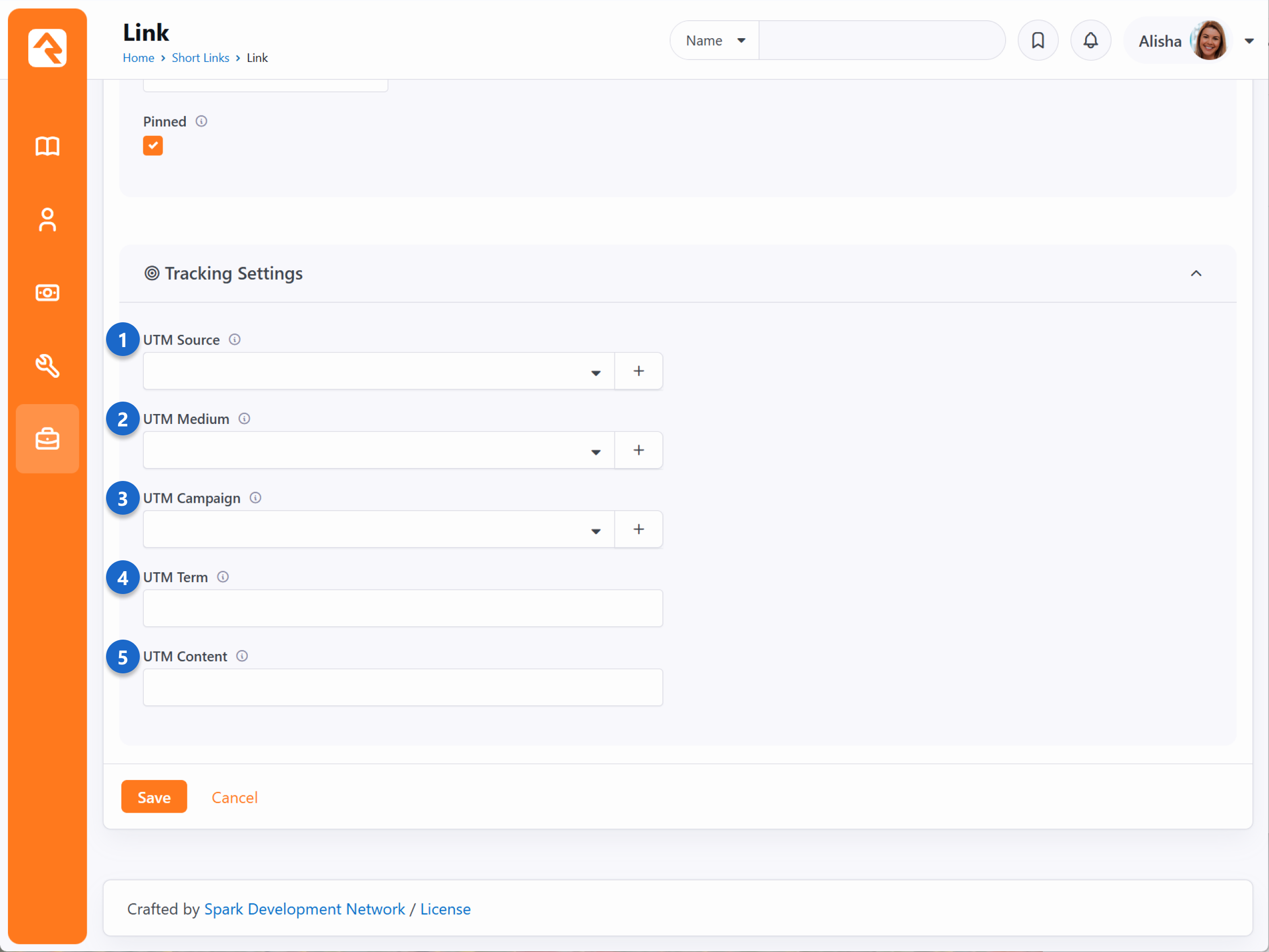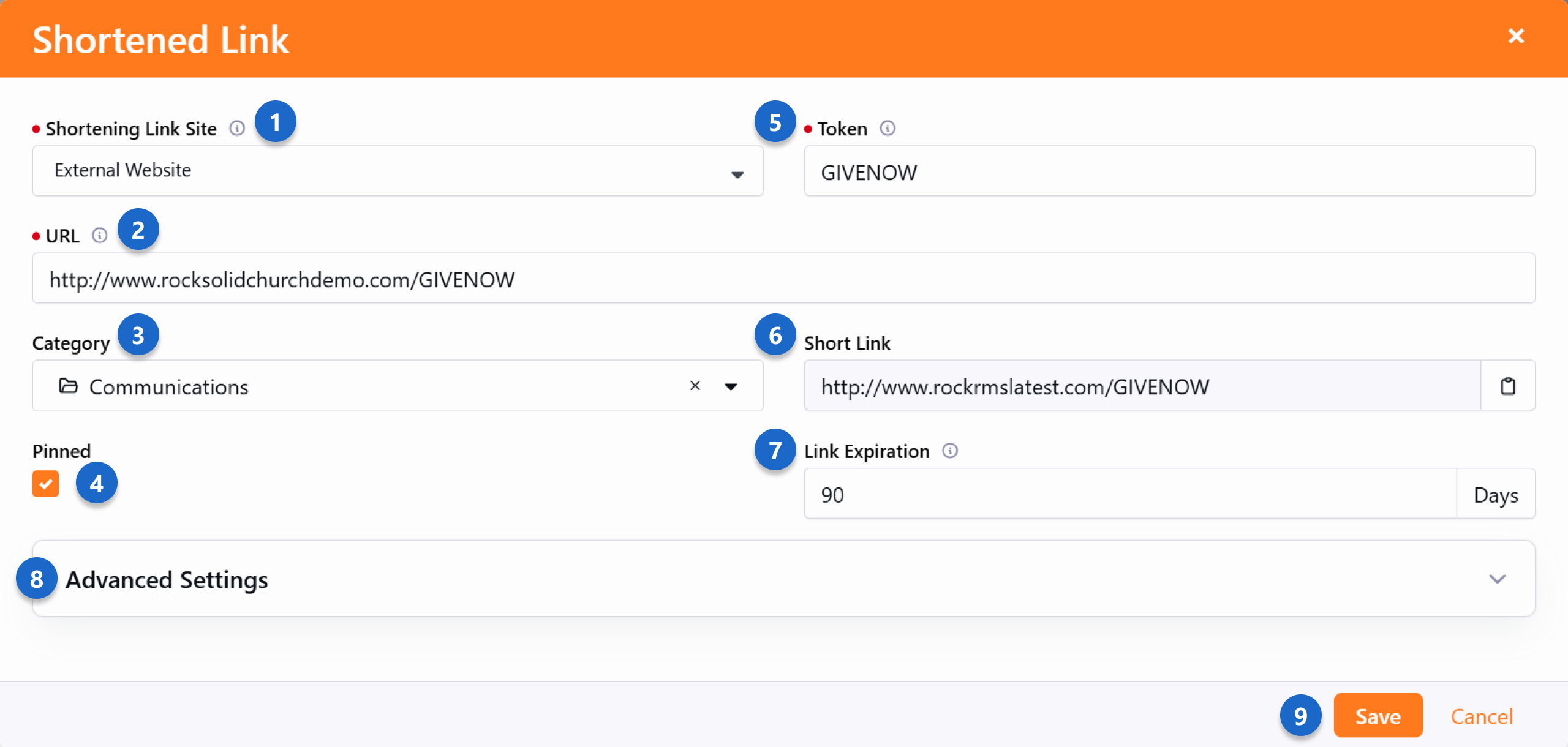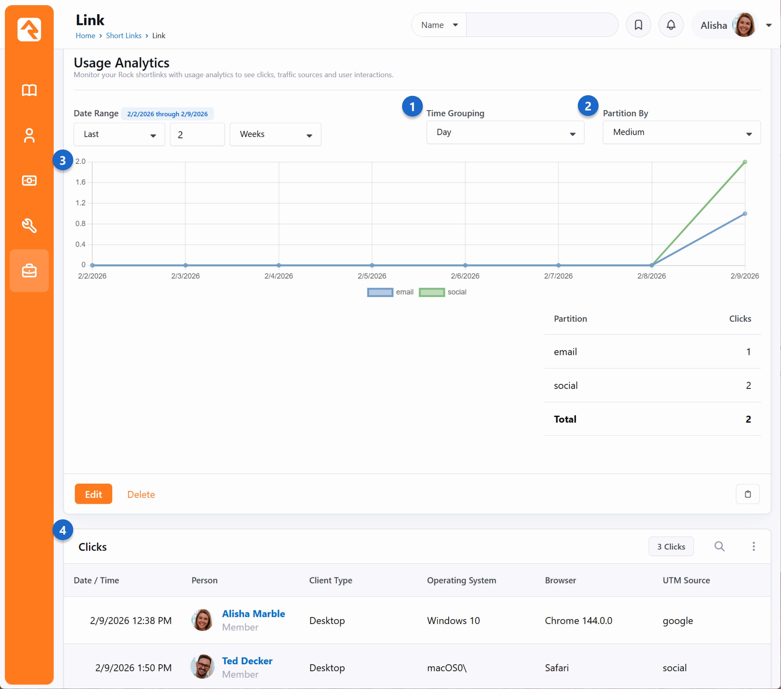Short links (ti ti-link) are exactly what they sound like: simple, user‑friendly links that replace long, messy URLs. But don’t let their size fool you. These links handle a lot behind the scenes, from tracking engagement with analytics and capturing helpful marketing data. You can even schedule these links to redirect automatically when you need to update or change their destination.To start, click the ti ti-link button in the Admin Toolbar to display the Shortened Link window. Site - This is where you choose which site you want to use for the short link. Only sites that have the Enabled for Shortening option checked will appear in the options. The Enabled for Shortening option is located in the site's Site Detail screen. See Creating A New Site for more information. URL - This is the URL to which the short link will redirect individuals. The default is the URL of the current page, but you can change it to any valid URL.Category - Pick the category that best fits your Short Link to organize it by use. For details on creating categories, see below.Pinned - Select this for your most important Short Links, those you will use often. Links you pin will be displayed at the top of your Short Links list. Token - The token is a unique, random value at least seven characters long that is used to identify the page in a short link. Rock generates a default token for you, but you can also provide your own. Remember, the token must be unique and at least seven characters long.Short Link Preview - This is the generated Short Link, based on the Site, URL and Token fields. It updates automatically as those values change. Use the ti ti-clipboard button to copy it.Link Expiration - Once your Short Link has been active for the number of days specified, it will no longer be accessible. Upon expiration, the link and its tracking data will be permanently deleted. Leave blank for no expiration.Advanced Settings - Advanced configuration such as setting an Urchin Tracking Module (UTM) for your link. More on this below.Save - The short link will not work until you click Save. Clicking Save will also automatically copy the short link to your clipboard. TipManaging Your Short Links:It's wise to start organizing your links early by pinning or categorizing them. Someday you may have thousands of Short Links, especially if they're automatically created through workflows or integrations. Good organization makes it much easier to quickly check analytics and maintain clarity as your list grows. ImportantDomain OrderBe sure the domain you want to use for your Short Link appears first in your site's Domains list. Rock uses the first domain to build the short link.If localhost or a test domain is listed first, the Short Link might not work.Go to Admin Tools > Websites, edit your site and reorder the domains so your desired domain appears first. To add a new category, make sure it uses the EntityType of PageShortLink. Only categories with this type are eligible for use with Short Links. You can set this in the Admin Tools > Settings > Category Manager. For example, you might create a Children's Ministry category to keep all related Short Links organized. You can also configure security so only Children's Ministry staff can access or manage those links. Managing Short Links As you create short links, they can be viewed and managed in the Short Links page found at Admin Tools > CMS Configuration > Short Links. As your list of Short Links grows, you can keep things manageable with built-in filtering and sorting. Press ti ti-adjustmentsmentsments-horizontal ti-fw for global options, or hover over a column and select ti ti-filter to narrow the results. Click any Short Link in the list to view or edit its details and see where it has been used. To copy a link, click the ti ti-clipboard button. To filter by creator, select the ti ti-settings icon. TipCreate Short Link Workflow ActionYou can also create short links as part of a workflow. For more information see Create Short Link, located in the Utility section of the Workflow Action Documentation. Usage Analytics Usage Analytics turn simple short links into something more like a trojan horse. You can send out a short link, and learn about how people used them without having to look over any shoulders. Time Grouping - Choose your perspective. Group the X-axis data by hour, day or month to spot trends over time.Partition By - Slice your data based on info like UTM codes or Purpose Codes to see which campaigns are performing best.Usage Chart - View link usage based on your setTime and Partition. Hover over any point to see specific data.Clicks - See the break down of each individual click, including browser details and links to Person Profiles. Easily search through clicks using the ti ti-search icon. Advanced Short Links When it comes to short links, there's more than meets the eye. With Advanced Settings, you can tack on UTM codes to track where your traffic’s coming from—perfect for tracking marketing campaigns and collecting valuable data. When editing or adding a new Short Link from the Short Links List block, you will notice that the detail screen looks a little different, and has some new features. UTM Source - Who sent the traffic. (e.g., Facebook, Newsletter)UTM Medium - How the link was shared. (e.g., email, SMS, social)UTM Campaign - Under what campaign was the link shared (e.g., SpringGroups, Launch2025)UTM Term - What keyword triggered the link (mainly for ads)UTM Content - Which version of the link was clicked (great for A/B testing) Once you have started collecting data with UTM parameters, you can track performance similar to other analytics platforms like Google Analytics. TipStreamlining UTM ParametersThe UTM Source, UTM Medium and UTM Campaign fields use a list that preserves the values you use. This process ensures consistency and easy retrieval of UTM values you have used before. Under the hood, these values are being saved as Defined Values. NoteUsing UTM