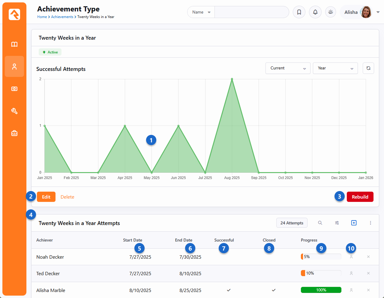 4. Attempts - Each person’s attempts at the achievement type are listed here. This block provides several important details for each attempt, covered in the points below. We’ll take a deeper dive into viewing and managing attempts in the Achievement Attempts section below.