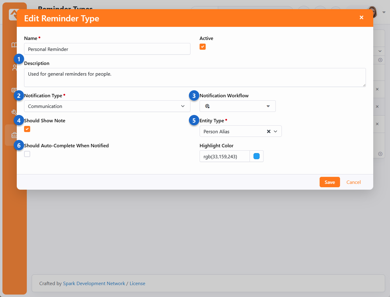 1. Name and Description - It's helpful to give your reminder types a meaningful name and clarifying description, especially as your list of reminder types grows.