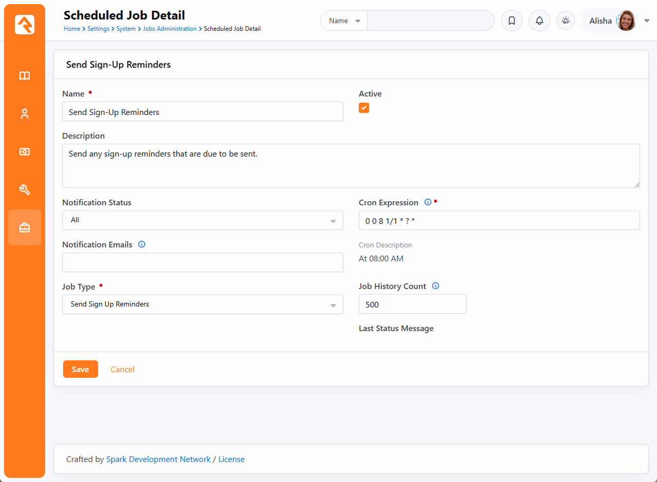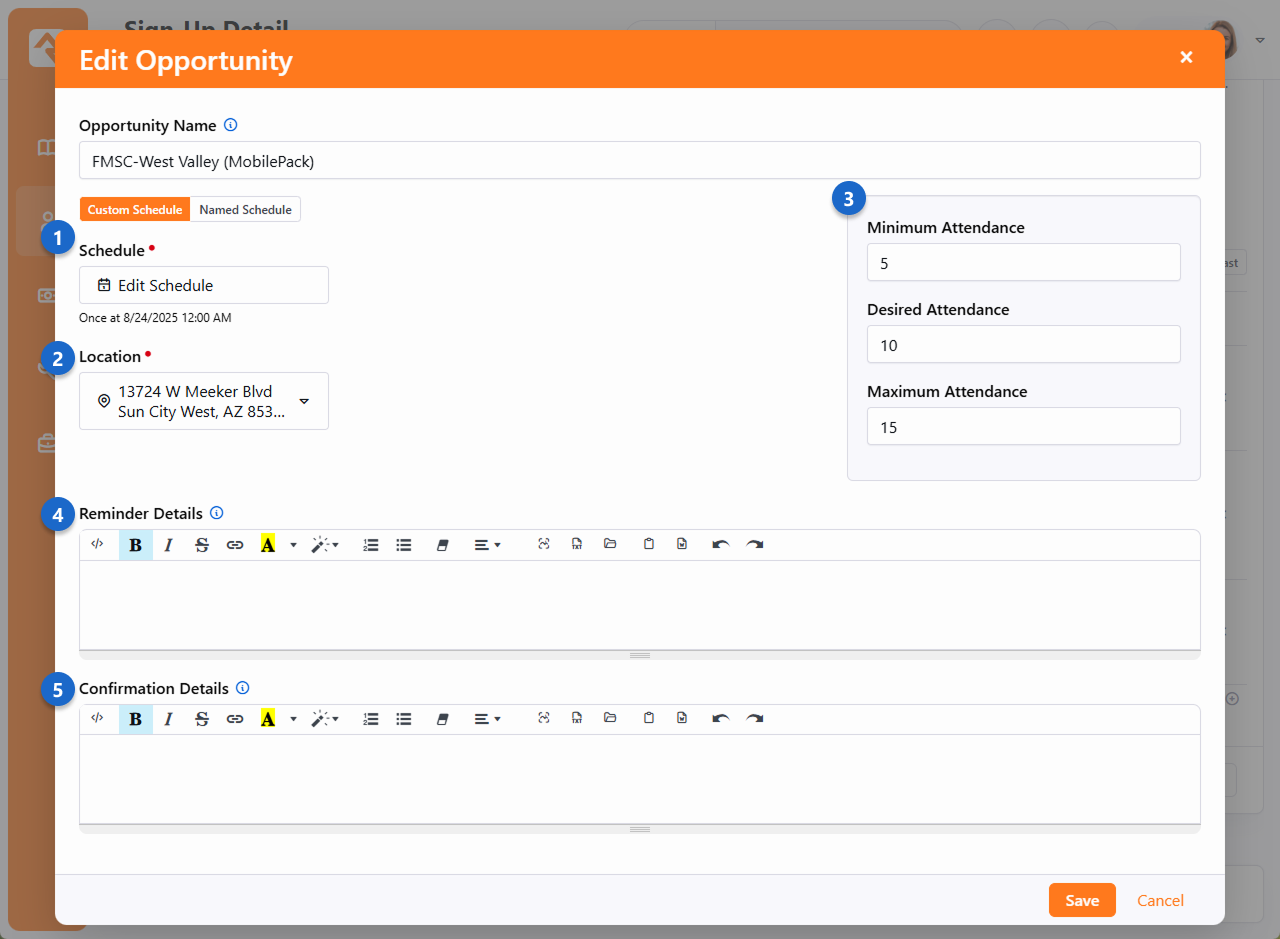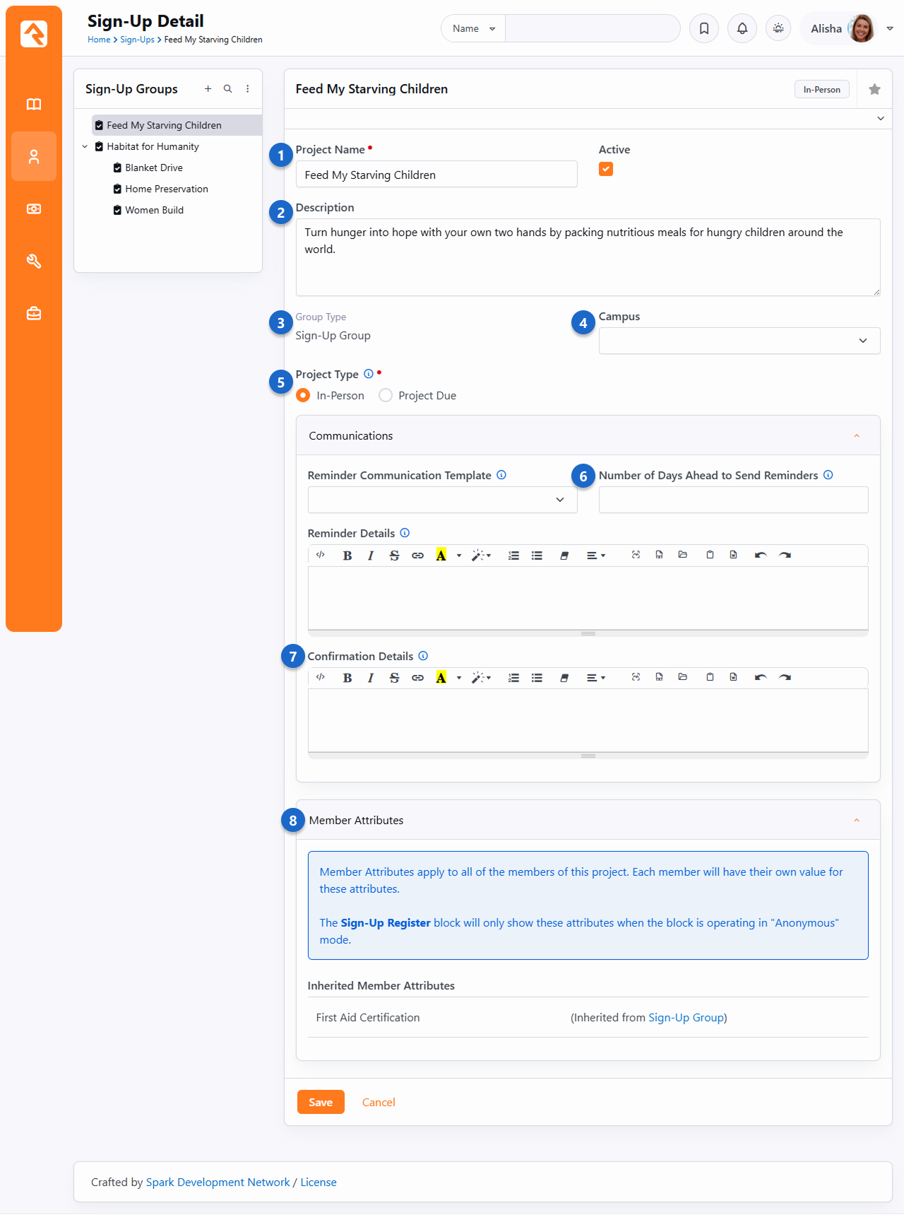 Now we’ll look at the setup that’s used to configure Sign-Ups. Group Types The first thing you’ll need is a group type, and we’ve got one ready for you. The Sign-Up Group group type is used by Rock, so editing is limited, but many features are available. There are too many group type configuration options to cover here (check out the Rock Your Groups manual) but you might edit this group type to add group requirements or attributes. If you're using group requirements, individuals will need to be logged in so Rock can determine if they meet those requirements. You could also work with more than one group type in Sign-Ups. This way you can leverage different features depending on the Sign-Up scenario. However, there are a couple special steps you'll need to take: Your new sign-up group type needs to have its Inherited Group Type value set to "Sign-Up Group" before proceeding. Then you'll need to add your new group type to Allowed Child Group Types in the configuration for the original "Sign-Up Group" group type. Your new group type needs to have Group Schedule Options selected (e.g., Custom, Named). Also, ensure at least one Location Selection Mode is chosen (e.g., Named, Address). By default, the public Sign-Up Finder block is only configured to show Opportunities for the original "Sign-Up Group" that ships with Rock. You'll have to edit the block's settings to show other Project [Group] Types. Project Configuration Projects are created and managed from People > Sign-Ups. Click a project from the tree menu on the left, then click the Edit button. Project Name - This will be the name of the project/group and will be seen by people visiting your site.Description - You’ll want to put some thought into a good description. The description is displayed publicly and will influence whether someone signs up.Group Type - For a new project, select which group type to use. Only Sign-Up Group, or group types inherited from Sign-Up Group, will be listed.Campus - Like other types of groups, you can assign the project to a campus. People can filter opportunities by campus using the Sign-Ups Finder.Project Type - In-Person project types occur at a specific time and place, so people can be reminded about it as the date approaches. Project Due project types typically span time, so they have a deadline for completion rather than a single upcoming event. Reminder Settings - If the project type is In-Person then you can choose which communication template to use for the reminders, and how many days in advance the reminders should be sent. You can also provide details that will be added to the reminder communication.Confirmation Details - A communication is sent to the person when they register. The content you add here will be added to that communication.Group Member Attributes - Any Group Member Attributes that have been configured at the Group Type level (e.g., Sign-Up Group) will appear as shown here. As noted on the screen, people will be able to set values for these attributes via the Sign-Up Register block if the block is in Anonymous mode and if the attribute is marked as Public. Setting up Opportunities With your projects in place, you’re ready to start adding opportunities to them. Remember, an opportunity is what the person registers for, so this is where you’ll set the schedule, location and attendance goals. Schedule - You can choose either a custom schedule or a named schedule. People can filter on named schedules in the Sign-Ups Finder. What the date and time represent depends on the project type for this opportunity.Location - Provide a named location or an address. This is required and is seen publicly.Attendance - Here is where you’ll set the minimum, desired and maximum people needed for the opportunity. You can use one, two or all of these options.Reminder Details - This won’t be available if the opportunity has a project type of Project Due. The content you add here will be appended to the reminder email for the opportunity.Confirmation Details - A communication is sent to the person when they register, and the content you provide here will be added to that communication. Send Reminders System Job Rock ships with a job called Send Sign Up Reminders that runs daily at 8am. There isn’t anything you need to configure with this job but be aware that reminders won’t be sent until it runs. Sign-Ups Finder Block Settings The public-facing block that’s used to search opportunities has several settings you’ll want to know about. Adjust these settings to change how the person interacts with the Sign-Ups Finder, and what filtering options are available to them. Hide Overcapacity Projects - If an opportunity is full, you might not want to show it on your website.Load Results on Initial Page Load - When you first come to the page should opportunities be shown or do people need to search first?Display Project Filters As - Certain filters can be displayed as either checkboxes or a drop-down menu.Filter Columns - You can change the look of the Sign-Up Finder by changing how many columns the filters should be divided into.Project Types - Here you can choose which sign-up group types to show. This is useful if you have multiple sign-up group types.Display Attribute Filters - If you have group attributes configured, then you can use them as filters.Project Type Filter Label - If you’re filtering on project types (group types) you can change the label of that filter.Display Campus Filter - Simply choose whether the person can filter by campus.Hide Campuses with no Sign-Up Opportunities - Assuming you're showing campuses, this allows you to prevent the person from seeing or selecting a campus that has no opportunities.Enable Campus Context - The opportunities can be filtered automatically based on a campus selection if the page has campus context. You can read more about context in our Designing and Building Websites manual. Campus Types/Statuses - You can restrict which campuses are