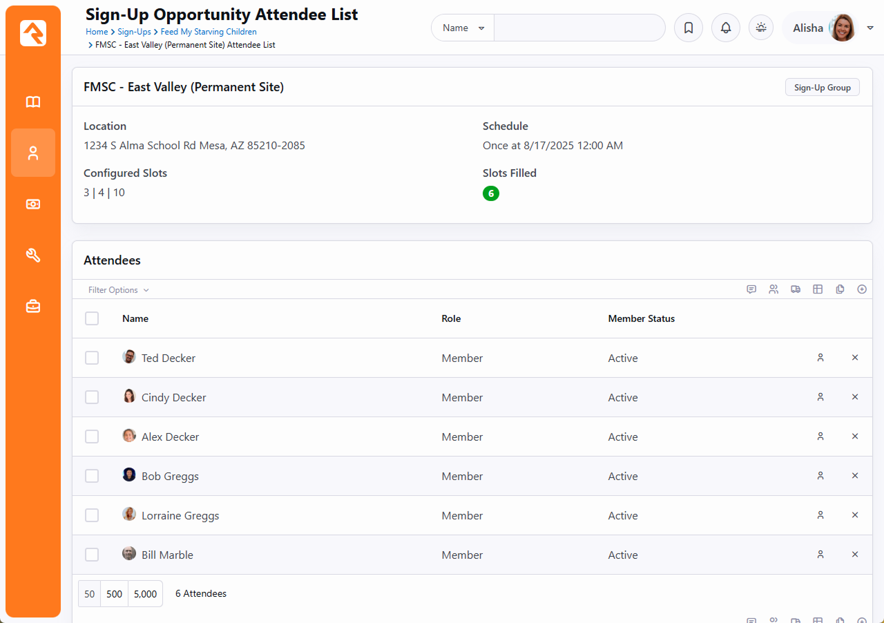 It does feel like you’re managing members of a group. The screens and features used to manage the attendee list are generally the same as with members of groups. But do keep in mind that the project is the group, and the opportunities are what people sign up for. So, if you have multiple opportunities under one project, everyone who signs up for any of the opportunities will all be added to the same group.