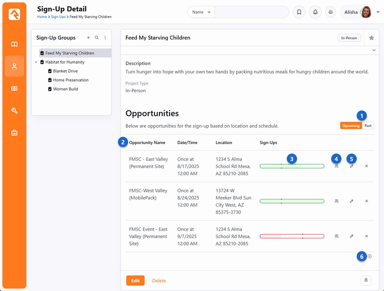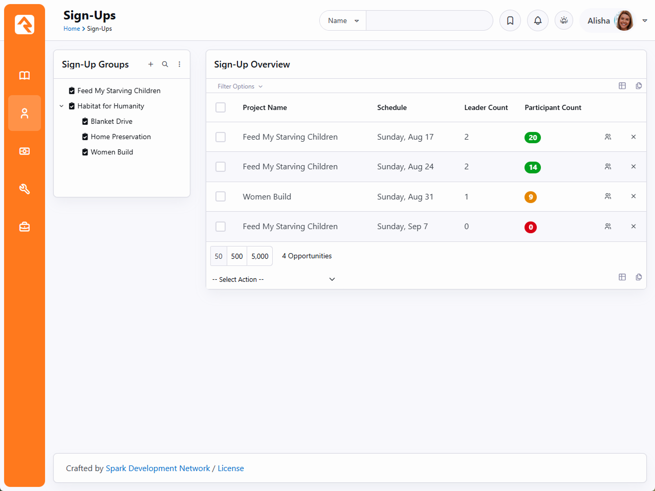 To access your projects, navigate to People > Sign-Ups. On the left are projects, which are organized into a hierarchical tree view. In the below example, Habitat for Humanity doesn’t have any opportunities, but is used to group other projects. To the right is a Sign-Up Overview. Here you’ll find the schedule and the participant count for each opportunity. The Sign-Up Overview only appears when you first access the page before a project is selected on the left.