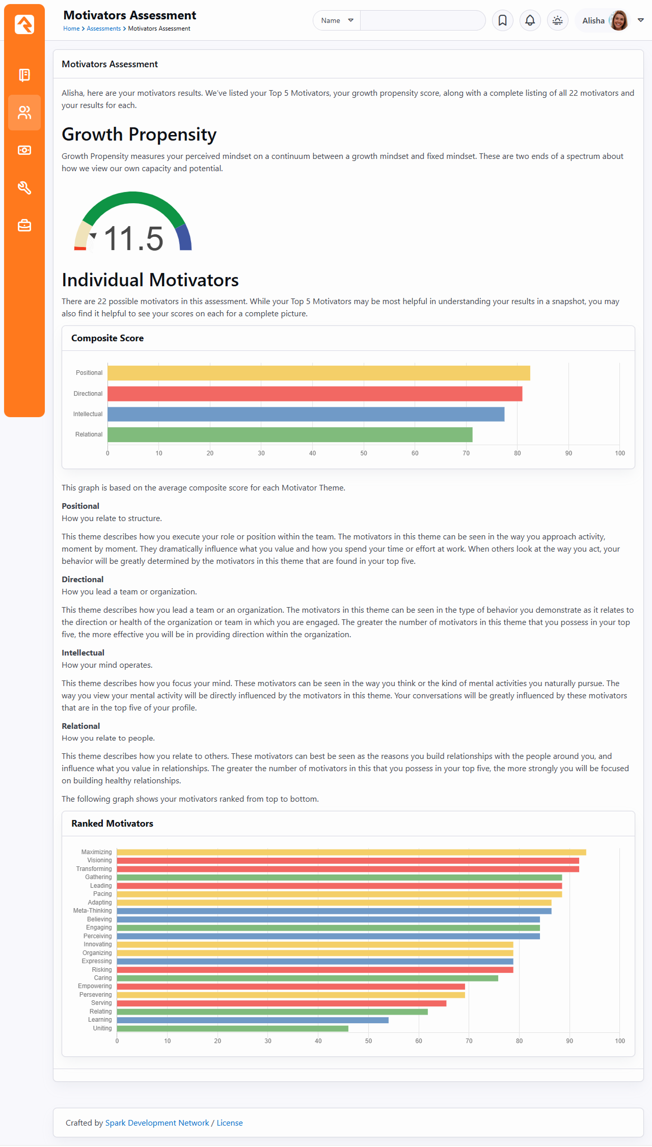 The Motivators Assessment identifies what a person truly values, which drives their perspective and goals. Because there are so many possible combinations of motivators, this assessment will demonstrate the unique set of strengths and challenges a person will face. It would be advisable to look for opportunities that require the strengths associated with a person’s top five to seven motivators, and to provide upwardly mobile opportunities for those who have a high propensity for growth. It is also helpful to evaluate the bottom five to seven motivators as venues that they should stay away from in serving if possible. This assessment will identify the top theme or themes of motivators, along with the propensity for growth and the top five individual motivators. Taking Motivators The motivators assessment has seven possible responses to a statement. Depending on the question you may have two sets of responses. The results show a growth propensity scale. The numbers range and are based on a fixed to growth mindset. They also show the composite score and ranked motivators. The results focus on your top scores to avoid clutter of showing descriptions on all the possible motivators. Growth Propensity Growth Propensity measures your perceived mindset on a continuum between a growth mindset and a fixed mindset. These are two ends of a spectrum about how we view our capacity and potential. This number is a measurement of the current propensity for growth, but that can change for an individual over time through applied effort and awareness. Also, their growth propensity scale may be different from one area in their life to another. Motivators Themes Relational This theme describes how you relate to others. These motivators can best be seen as the reasons you build relationships with the people around you, and influence what you value in relationships. The greater the number of the motivators from this cluster you possess in your top five, the more strongly you will be focused on building healthy relationships. Here are the influential motivators: CaringEngagingGatheringRelatingUniting Directional This theme describes how you desire to give direction to a team or an organization. The motivators in this theme can be seen in the type of behavior you demonstrate in your preferred position as it relates to the direction or health of the organization or team in which you are engaged. The greater the number of the motivators from this cluster you possess in your top five, the more effective you will be providing direction within the organization. Here are the organizational motivators: EmpoweringLeadingServingTransformingRiskingEnvisioning Intellectual This theme describes how you focus your mind. These motivators can be seen in the way you think or the kind of mental activities you naturally pursue. The way you view your mental activity will be directly influenced by the motivators in this theme. Your conversations will be greatly influenced by these motivators that are in the top five of your profile. Here are the organizational motivators: BelievingExpressingLearningPerceivingMeta-Thinking Positional This theme describes how you execute your role or position within the team. The motivators in this theme can be seen in the way you approach activity, moment by moment. They dramatically influence what you value and how you spend your time or effort at work. When others look at the way you act, your behavior will be greatly determined by the motivators from this cluster that are found in your top five. Here are the operational motivators: AdaptingInnovatingMaximizingOrganizingPacingPersevering Individual Motivators There are 22 possible motivators in this assessment. While your Top 5 Motivators may be most helpful in understanding your results in a snapshot, you may also find it helpful to see your scores on each for a complete picture. Adapting Description: You change quickly when circumstances require it. You have the capacity to be adaptable in diverse situations. You understand when the need for transformation is necessary before others do. You enjoy change. You have a desire to be on the front edge of any movement. Influence: You influence others by incorporating change so that you are better prepared to handle challenges. Challenge: You are so quick to adjust and adapt that you may miss the positive results of perseverance. Believing Description: You pursue the principles in which you believe with dogged determination. You have a tremendous capacity to be tenacious in pursuing principles in which you trust. You clearly know what you believe and are able to articulate this to others. You have expectations for yourself and others according to these standards. You are confident that you have formed your beliefs through wise experience, counsel and judgment. Influence: You influence others through your convictions. Challenge: Some may see you as inflexible. Caring Description: You are motivated to meet the needs of others. You genuinely care for other people, especially when they are hurting. You have a large capacity for supporting others and are seen as empathetic, especially for those in difficult situations. You may find it easy to identify with the pain that others experience. Influence: You influence others with your care and compassion. Challenge: You may become so consumed with meeting immediate needs that you miss long term solutions. Empowering Description: You equip others to do what they are gifted to do. You have the capacity to equip and release individuals. You enjoy developing mentoring relationships and modeling leadership. You find it easy to see the strengths of others and are also aware of the areas they need to develop. Influence: You influence others by investing in them to do so much more than they could do without your intentional effort. Challenge: You may not always address negative issues in the lives of those you are developing. Engaging Description: This motivator influenc
