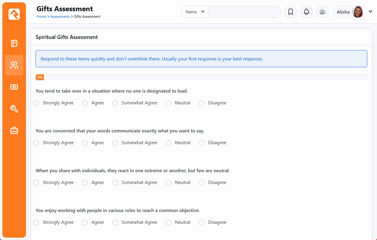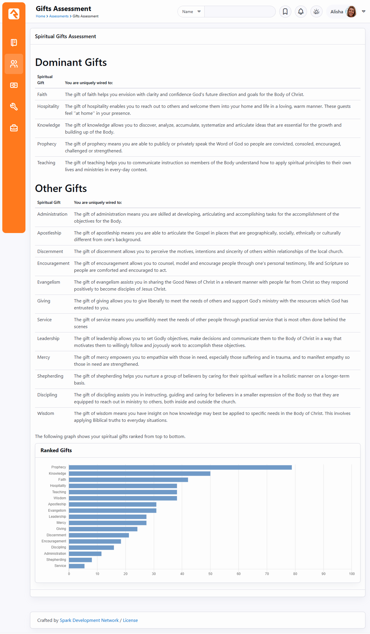 The Spiritual Gifts Assessment identifies the spiritual gifts an individual possesses. While this is not a comprehensive list of spiritual gifts, it does include those that are most commonly seen in action for most people. Empowering the members of your organization to make an impact starts with identifying their spiritual gifts. From there, they are positioned to learn what these gifts are and how they fit into the functioning of your mission. This assessment will identify clusters of dominant, supportive and other gifts for each person. This is searchable through Data Views. If, for instance, you want to search for people to host new small groups in their homes, you could create a person Data View and select the attribute ‘Dominant Gifts’ that includes ‘Hospitality’. Each of the 17 spiritual gifts that are assessed are broken down with descriptions below. Taking the Assessment The spiritual gifts assessment has one statement and five responses on whether you Strongly Agree, Agree, Somewhat Agree, Neutral, or Disagree. The results are then broken up into three categories of Dominant Gifts, Supportive Gifts, and Other Gifts. Result Details At the end of the assessments, you will get a page that breaks down the three areas where you scored in. Dominant GiftSupportive GiftsOther Gifts Each gift will be in order and have a description provided like the ones below: Spiritual GiftDefinition AdministrationThe gift of administration means you are skilled at developing, articulating and accomplishing tasks for the accomplishment of the objectives for the Body. ApostleshipThe gift of apostleship means you are able to articulate the Gospel in places that are geographically, socially, ethnically or culturally different from one's background. DiscernmentThe gift of discernment allows you to perceive the motives, intentions and sincerity of others within relationships of the local church. DisciplingThe gift of discipling assists you in instructing, guiding and caring for believers in a smaller expression of the Body so that they are equipped to reach out in ministry to others, both inside and outside the church. EncouragementThe gift of encouragement allows you to counsel, model and encourage people through one's personal testimony, life and Scripture so people are comforted and encouraged to act. EvangelismThe gift of evangelism assists you in sharing the Good News of Christ in a relevant manner with people far from Christ, so they respond positively to become disciples of Jesus Christ. FaithThe gift of faith helps you envision with clarity and confidence God's future direction and goals for the Body of Christ. GivingThe gift of giving allows you to give liberally to meet the needs of others and support God's ministry with the resources which God has entrusted to you. HospitalityThe gift of hospitality enables you to reach out to others and welcome them into your home and life in a loving, warm manner. These guests feel "at home" in your presence. KnowledgeThe gift of knowledge allows you to discover, analyze, accumulate, systematize and articulate ideas that are essential for the growth and building up of the Body. LeadershipThe gift of leadership allows you to set Godly objectives, make decisions and communicate them to the Body of Christ in a way that motivates them to willingly follow and joyously work to accomplish these objectives. MentoringThe gift of combining shepherding and teaching assists you in instructing, guiding and caring for believers in a smaller expression of the Body so that they are equipped to reach out in ministry to others, both inside and outside the church. MercyThe gift of mercy empowers you to empathize with those in need, especially those suffering and in trauma, and to manifest empathy so those in need are strengthened. ProphecyThe gift of prophecy means you are able to publicly or privately speak the Word of God, so people are convicted, consoled, encouraged, challenged or strengthened. ServiceThe gift of service means you unselfishly meet the needs of other people through practical service that is most often done behind the scenes. ShepherdingThe gift of shepherding helps you nurture a group of believers by caring for their spiritual welfare in a holistic manner on a longer-term basis. TeachingThe gift of teaching helps you to communicate instruction, so members of the Body understand how to apply spiritual principles to their own lives and ministries in every-day context. WisdomThe gift of wisdom means you have insight on how knowledge may best be applied to specific needs in the Body of Christ. This involves applying Biblical truths to everyday situations.