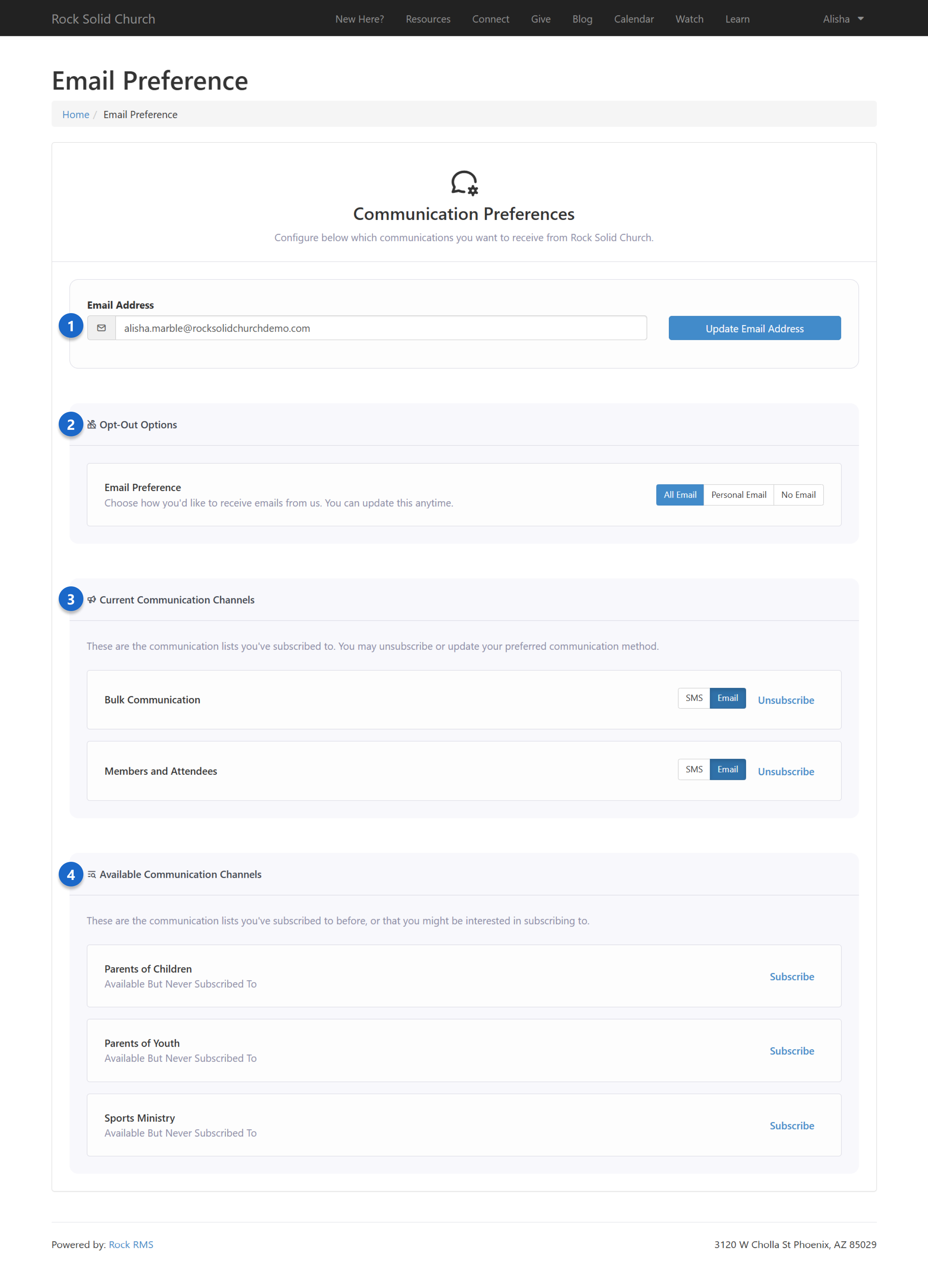 Communication Preferences When someone is taken to the Unsubscribe page on the external site, they’ll see the Unsubscribe page, pictured below. Upon arriving at the page, they can proceed to set their email preference.There are two different modes. Communication Preferences Mode - Often a static page on your site, allowing communication recipients to change their preferences.Unsubscribe Mode - Navigated to using a link, generally from an email. Communication Preferences Mode Email Address - Shows current Email Address. You can enter a new address then select Update Email Address. Global Opt-Out Options - All Email - Receive all emails, including personal emails and mass emails.Personal Email - When clicked, this person is removed from all Communication Lists or Campaigns, but may receive individual emails. This will mark the person's “Email Preference” to “No Mass Emails” on their profile. No Email - No emails will be sent to this email. Current Communication Channels - Lists a person’s currently subscribed lists. Shows their Medium Preference if enabled. Select Unsubscribe to leave a list. Available Communication Channels - Communication Lists a person can join. People can select Subscribe to join a new list. If the person didn’t unsubscribe from a communication list, their Person Profile email settings in Rock will be updated to “No Mass Emails.” If it’s already set to “No Mass Emails” then it will be updated to “Do Not Email.” Changes to a person’s Email Preferences are logged in the Person History area under the History tab in the Person Profile. To have more control over Communication Preferences, configure the block settings. Communication Configuration Options - Select which actions the page offers: Update Email Address Manage Channel Subscriptions Remove Involvement (Unsubscribe Mode only). Show Header Icon - Show a default icon beside the header title. Exclude Communication Flows - Hide flows from the Current and Available sections. Filter Communication Lists by Campus Context - Filter lists by the page’s campus context. Lists with no campus always show. Always Include Subscribed Communication Lists - When campus filtering is on, still show lists the person already receives. Category filters still apply. Message Count Window (In Days) - Set lookback days for message counts. Set to 0 to disable. Manage My Account Page - Choose the page opened by the Manage My Account button. Shows if the person is deactivated or in Unsubscribe Mode. Leave blank to hide. Unsubscribe from Communication List Workflow - Launch a workflow when someone unsubscribes from one or more lists. Rock passes the person as Entity and comma-delimited IDs in CommunicationListIds when present. Available Communication Channels - Choose what to show in the Available section: Show Only Previously Subscribed Channels or Show All Channels Available.Communication List Categories - Limit lists by category for Communication Preference Mode. If none, show all lists the person is authorized to view. Category permissions override list permissions.Communication Flow Categories - Limit flows shown in Current Communication Channels for Communication Preference Mode. If none, show all flows the person is in.Show Medium Preference On Current Channels - Show and allow changes to the person’s preferred medium per list, like SMS or Email. Communication List Categories - Limit lists shown in Unsubscribe Mode. If none, show all lists the person is authorized to view. Category permissions override list permissions.Communication Flow Categories - Limit flows shown in Unsubscribe Mode. If none, show all flows.Allow Deactivating Family - When selecting Deactivate on Remove Me From All Church Involvement, show option to deactivate the whole family when allowed. Hidden if the person is in multiple families or not an adult.Inactive Reasons to Exclude - Choose Inactive Reasons to hide when someone removes involvement using Deactivate. Examples: No Longer Attending, No Activity, Moved, Deceased, Does not attend with family. In addition to controlling what’s shown on the block, you can customize the text for each section of the Communication Preferences block using the Customize Text tab. This lets you align the messaging with your brand, personalize the experience or clarify what action was just taken.Leaving any text box blank will remove the text from the Communication Preference block altogether. TipLava-Enabled All memo fields on this tab accept Lava. Account Deactivation Header - Text for removal and deactivation messages. Remove Involvement Confirmation Title - Header text when requesting removal. Remove Involvement Confirmation Description - Description shown before confirming removal. Person Removed Involvement Success Title - Header text after a person is removed. Person Removed Involvement Success Description - Description shown after a person is removed. Family Removed Involvement Success Title - Header text after a family is removed. Family Removed Involvement Success Description - Description shown after a family is removed. Opt-Out Options - Text for global opt-out choices. Email Preference Title - Header text for general email preference. Email Preference Description - Description for general email preference. Remove Involvement Title - Header text for removal choice. Remove Involvement Description - Description for removal choice. Preference Mode Header - Title and description for site visits. Preference Mode Header Title - Header text when loaded from the website. Preference Mode Header Description - Description text under the header, supports Lava. Section Descriptions - Text above each section. Opt-Out Options Description - Text above global opt-outs. Current Communication Channels Description - Text above subscribed lists. Available Communication Channels Description - Text above available lists. Unsubscribe Mode Header - Titles and descriptions for unsubscribe context. Unsubscribed From 