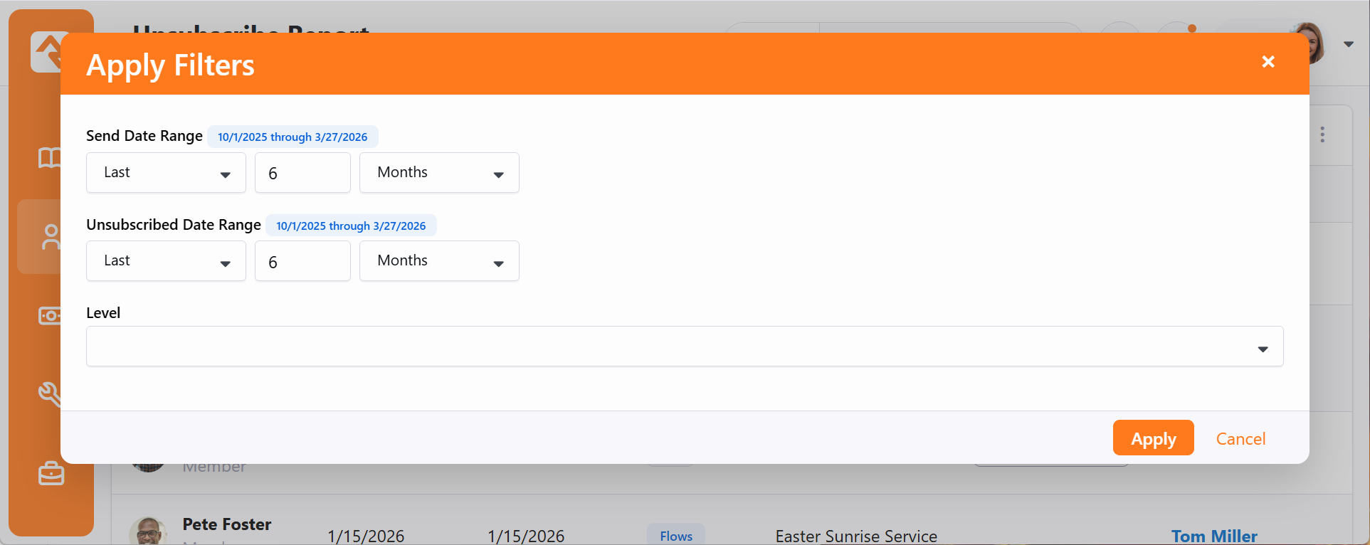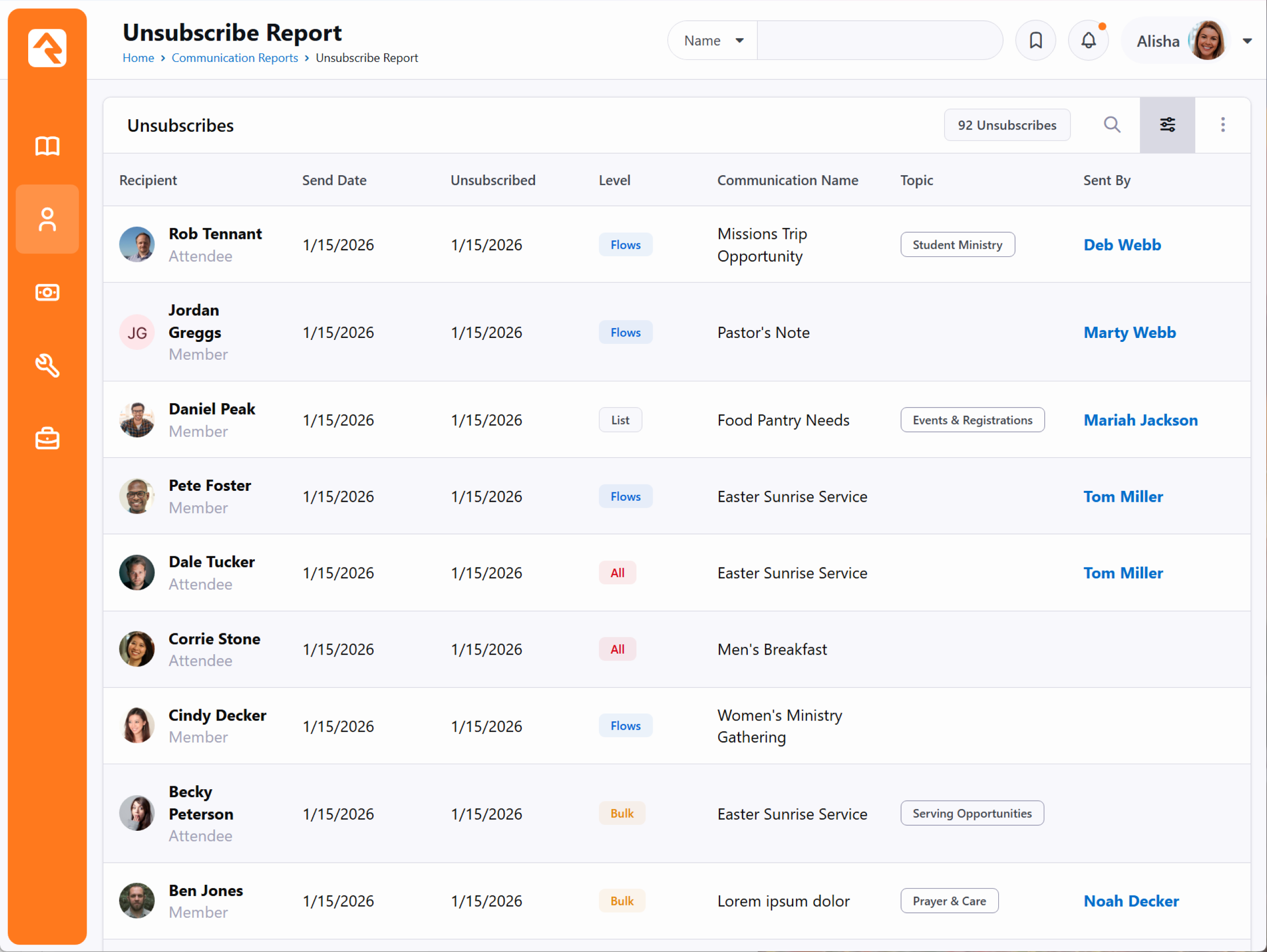 The Unsubscribe Report gives you a clear picture of individuals who have opted out of communications, helping your organization maintain a healthy, respectful relationship with every person you serve (and communicate with). Think of this report as a listening post. When someone unsubscribes, they're giving you honest feedback about your communication frequency or content. This report also helps you identify staff members who serve as communicators and may benefit from additional coaching. The sins of one communicator can stain the whole organization (sorry for the dramatic phrasing). This report provides clear visibility into those results so you can help them improve. To proactively manage this frequency before an unsubscribe happens, you can use the Communication Saturation Report to identify individuals who may be receiving too many messages. To view the report, navigate to People > Communication Reports > Unsubscribe Report. The report shows a list of recent unsubscribes with the following details: Recipient – The person who opted out, including their current engagement status (e.g., Invested or Disengaged).Unsubscribed – The date the person chose to stop receiving messages.Level – The scope of the unsubscribe, such as Bulk (all mass communications) or a specific List.Communication Name – The specific message that prompted the person to click the unsubscribe link. To cut down on the unsubscribes you're seeing, and find the ones most relevant to you, click the ti ti-adjustments-horizontal button to filter your results.