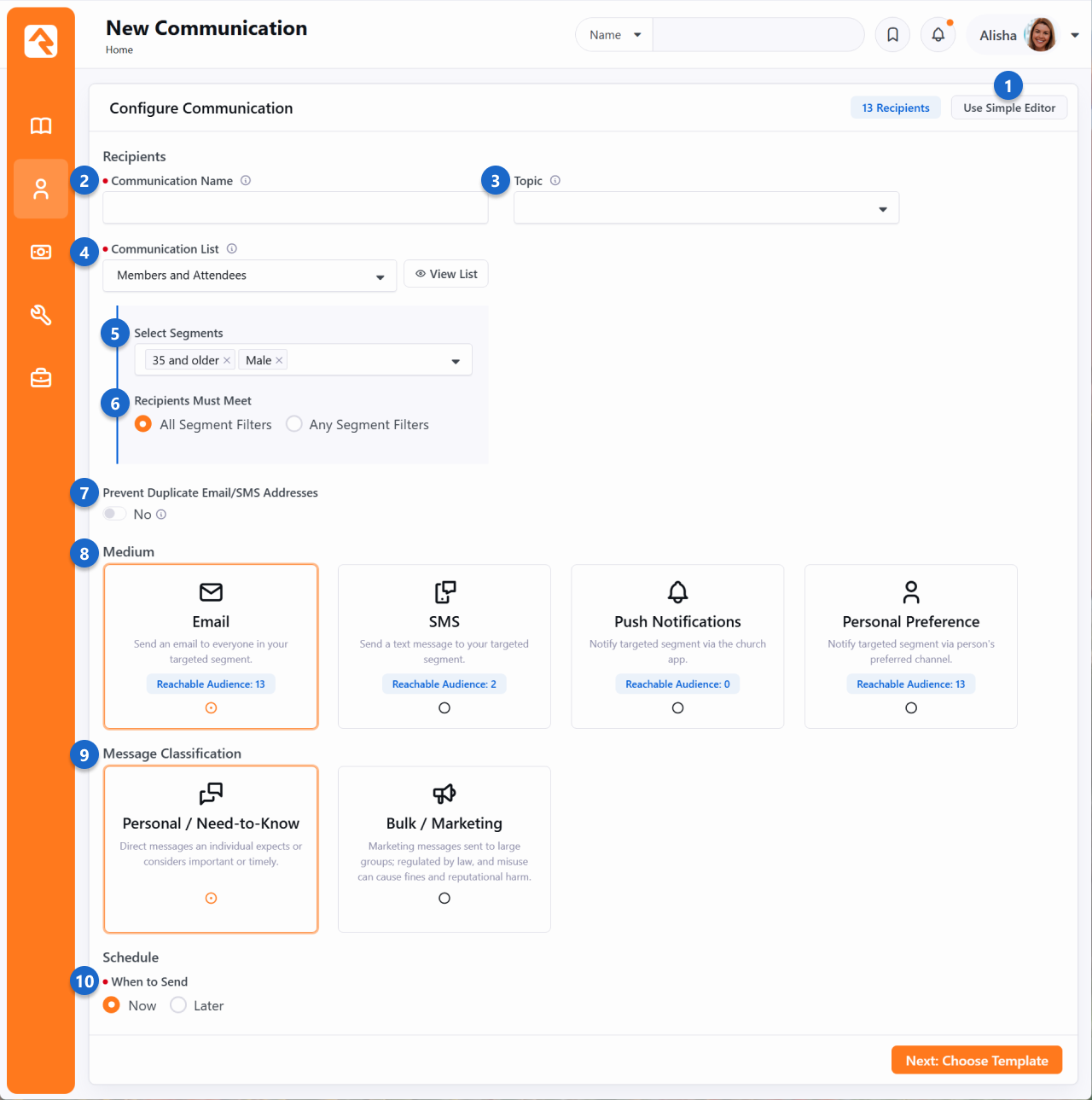 When you think of a robust, efficient, all-in-one communication platform... your mind may have drifted towards your daily drivers like Brevo, Mailchimp and Beefree. You may like their features: a drag-and-drop email builder, templates, customization, personalization, analytics, etc. You may have even jumped between services to get the feature list you desire. Are you tired of jumping? Are your legs wearing out? No more jumping. Rock has you covered on all communication fronts. Why choose Rock for communication? You have access to all your data to empower personalizationAll interactions with comunications are stored in your databaseNo integration needed NoteCommunication Wizard v2 Our new Communication Wizard comes packed with more spells than ever: an easy-to-use interface and a beautifully simple, yet powerful, drag-and-drop email editor. The SMS and Push Notification editors have also been refreshed—now with emojis! The wizard works just like you'd expect, guiding you step-by-step with forward and back buttons. Let’s walk through how to send a communication using the wizard. Build a Communication To begin a new communication, go to People > New Communication. The first screen you'll see, pictured below, is where you'll pick who you want to send the communication to. There are many ways to arrive at the Communication Wizard, Select ti ti-message-circle comment from a gridNavigate to the page yourself then you can:Add individuals manually with a Manual Recipient ListUse a Communication List Use Simple Editor - Click this button to launch the Simple Editor.Communication Name - This is the name of the communication you’re sending, for internal use only, to help you identify which communications were sent as you look through your history of communications. The name you provide here will not be included in the communication you send. Topic - Specify which campaign or communication topic this falls under (e.g.: Missions Update). This is used to group communications, making them easier to find in the future. You can update topics in Admin Tools > Settings > Defined Types > Communication Topic. Communication List - If you want to select individual recipients manually, you can do that here. This lets you create a list of people without using a configured Communication List. If there are more than 1,000 recipients you'll only see a summary of those who may not receive the communication because, for instance, they don't have an email address or SMS phone number.Segments - The Segments feature lets you filter people in the Communication List according to your selections. For instance, you could apply the '35 and older' segment to only communicate with people from the 'Members and Attendees' list who are 35 and older. Only segments under the 'Communications' category are shown. This category can be adjusted in the block settings. To learn more, see Segments.Recipients Must Meet - If you’ve chosen more than one Segment then this lets you decide if the people who receive the communication should meet all of the segment requirements, or any one of them.Prevent Duplicates - This setting is only visible if enabled in the block's settings. People within a family will often share an email address or SMS phone number. Selecting this option will cause only one communication to be sent per email address or phone number. For instance, if spouses share an email address, then only one of them will receive the communication, personalized to that person. In most cases you don't want this set as the communication will be personalized to only one of the recipients.Medium - The options you see here may vary depending on your Rock configuration/data. In this case we can choose to send an email, an SMS text message or a push notification. Or we can send it using different mediums based on each recipient’s communication preference.Bulk Communication - Here you choose if your message is personal or bulk/marketing communication. Whether you’re sending a quick update to a friend or a monthly newsletter to your entire community, this is where you let the system know. You can even customize the text on these cards in the block settings to make them feel more like your organization.Personal/Need-to-know - Use this for one-off messages to people who are expecting to hear from you or for time-sensitive updates they can't miss.Bulk/Marketing - This is the best choice for newsletters or general updates. When you select this, the system automatically includes an unsubscribe link so people can manage their preferences. If your recipient list is larger than the limit set in your the Communication Mediums settings, Rock will handle this for you by selecting this option automatically. See the Configuring Email article for more information. Schedule Send - Select when a communication sends, even down to the minute. By default, the communication will be sent immediately after it has been created (and approved, if applicable). Click Next to advance to the Choose Template screen. This is where you’ll select the email template you want to use to create your communication. You can imagine how, after you’ve created a number of templates, having a Template Image Preview (i.e., thumbnail) will help you easily locate the template you want. Use the category filter dropdown to help you locate your template. If you don’t see a template listed, you may not have permission to use it, or it might not be set up for use with the wizard. Rock ships with these three templates out of the box, but the list will expand as you create your own. Remember, these templates are a starting point for your communications, later, you can customize them to your heart's content. Once you have a well-crafted email, SMS message or push notification, you can use it as a template. To learn more, see the Templates section below. NoteStarter TemplatesTo save your template under Starter Templates, find your desired template in the Communication Templates set