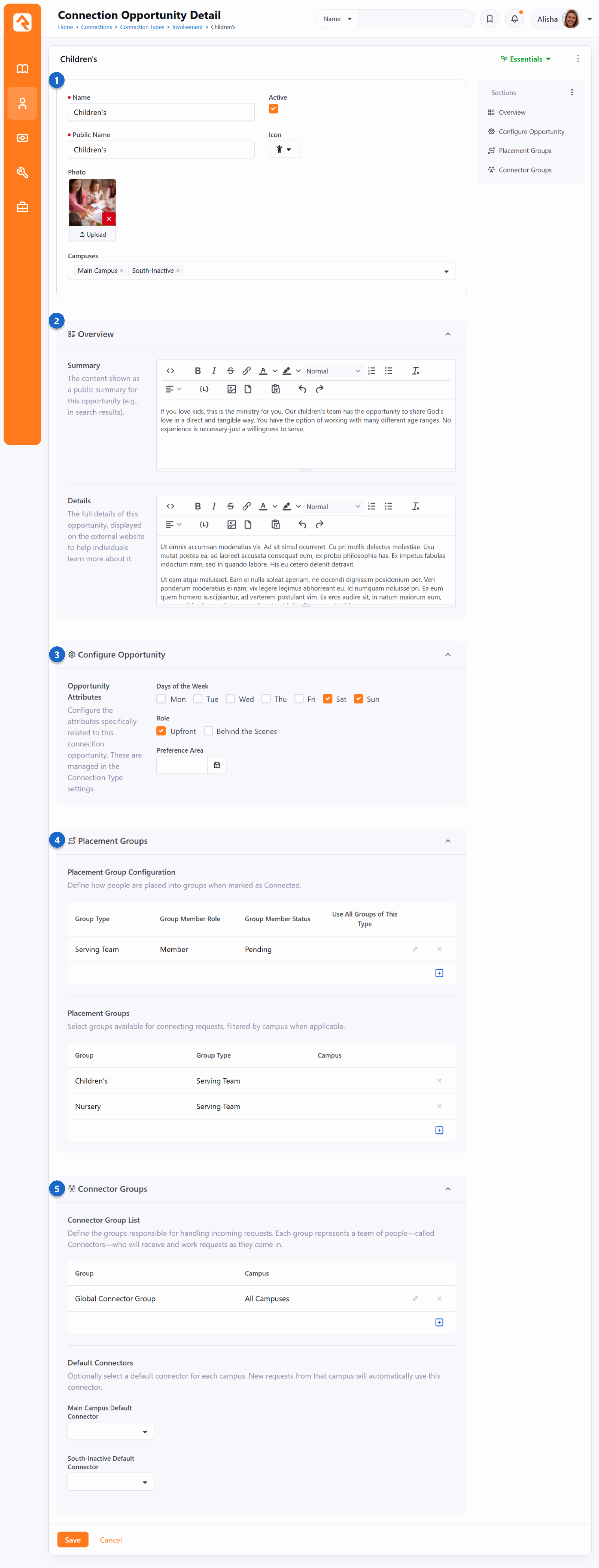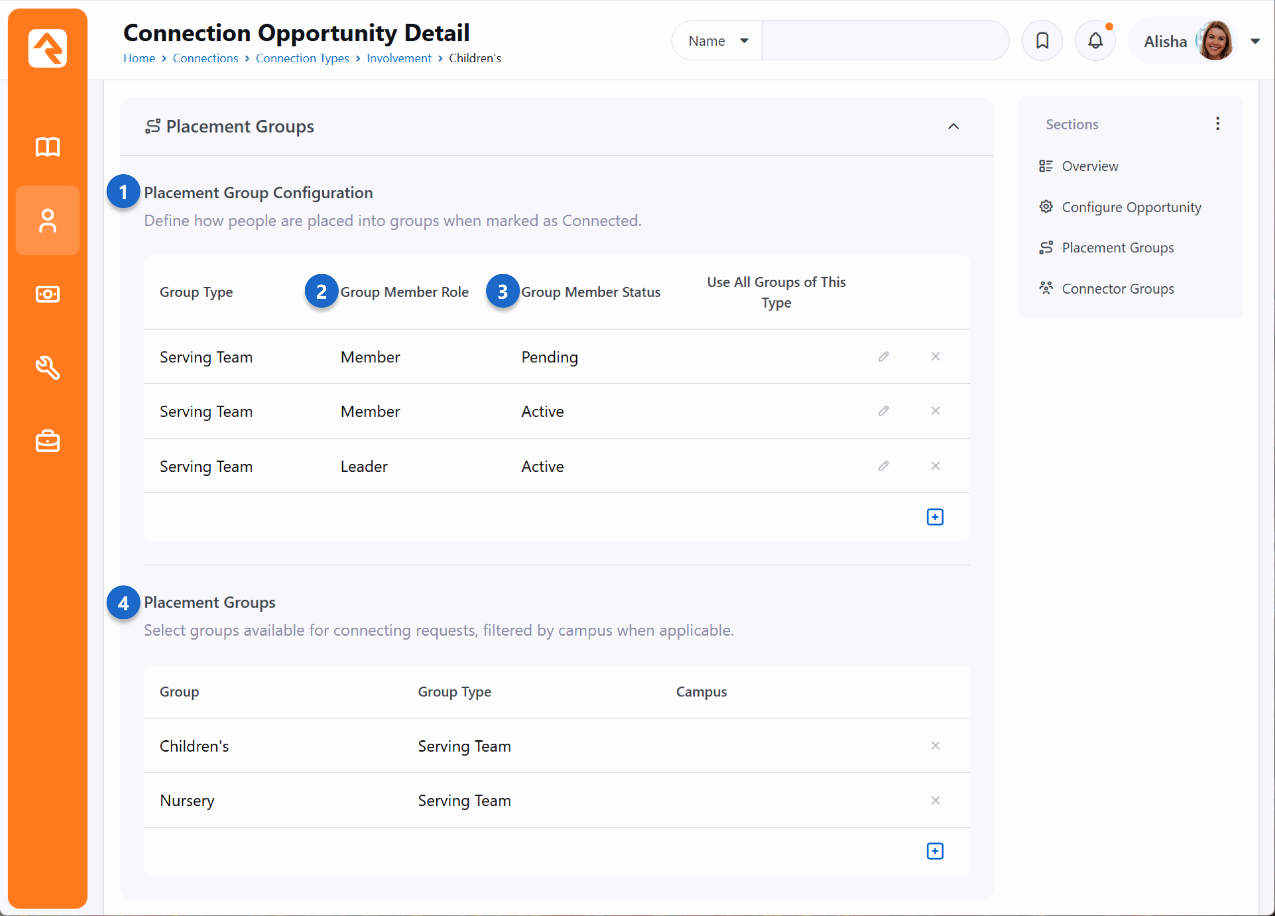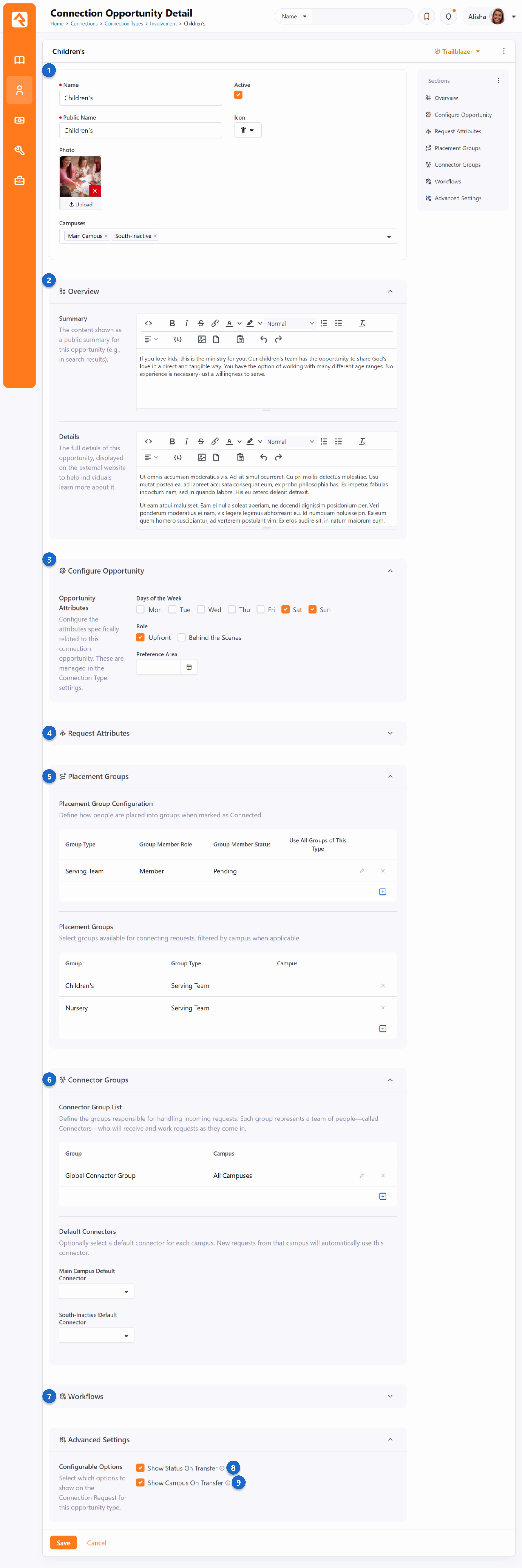 When viewing a Connection Type, you can select an existing opportunity or click the ti ti-plus icon to add a new one. Either way you'll be brought to a screen like the one pictured below. Trailblazer Basic Information - This section is where you set the identity of your opportunity by giving it a name, toggling its active status and choosing an icon or photo to make it more inviting. Opportunity OverviewSummary - This brief description appears in search results to give people a quick idea of what the opportunity is about.Details - Use this area to provide a full description. Think of this as your canvas to explain the heart of the role and any specific tasks a person might perform. Opportunity Attributes - Remember setting up the opportunity attributes for the Connection Type? This is where you'll provide their values.tb: Request Attributes - Here you can see connection requests attributes that apply to requests in this opportunity. Attributes inherited from the Connection Type will also be shown here for reference. Placement Group Configuration - The next few settings help to configure how the request will process adding people to groups when the person's request is marked Connected. Let's review each setting:Group Type: This defines which group type the available groups will be. We need to know this so we can personalize some of the other settings like role and status.Group Member Role: The role the person will be assigned when they are connected, or added, to the group.Group Member Status: The configured status the person will receive when they are added to the group.Use All Groups of This Type: Each opportunity will have a selected list of groups that a person can be connected to. This setting says instead of having to select every group of a certain type (and keep it current) just use all of them. We'll talk more about these settings in the Placement Group Configuration section. Connector Groups - Next, we'll define the various groups that contain the people who will work the requests as they come in. The members of these groups are your Connectors.Default Connector - You can optionally define a default connector for each campus. Any new requests originating at a campus will then default to the specific campus' connector. The drop down will show a list of active members from the connector group listed. This is disabled if you have only one campus. tb: Workflows - We saw that we could define workflows when configuring the connection type. Configuring it there would apply the workflows to all opportunities of that type. You can also configure workflows for a specific opportunity here. We’ll talk more about connection request workflows in another article.tb: Show Status On Transfer - When this is enabled, staff members can manually change the status during a transfer.tb: Show Campus On Transfer - This adds a campus dropdown to the transfer window, allowing you to move a request to a different opportunity and campus at the same time. Placement Groups An important part of the connection process is the selection of a group to place the person in when they are connected. The definition of these 'selectable' groups is highly configurable. Knowing all of your options will increase the power of your connections processes. Let's say for instance that we’d like our Children's connection opportunity to allow placement into three different serving teams. We'd also like the connector to be able to place them into groups as either a Leader or a Member. Finally, if they are a Member of the group, we'd like for the connector to be able to place them with the member status of Active or Pending. That's quite a list of requirements... let’s see how we can configure the Children's opportunity to do just that. You can set up placement groups in the Connection Opportunity configuration screen. Here you'll find a panel for setting placement group options. The screen below shows the configuration for the example given above. WarningIf you don't have placement groups enabled as a feature for this Connection Type, you won't see these settings. Placement Group Configuration - The first things we configure are the group types, roles and statuses that will be options for our placement groups.Group Member Role - Next, we configure the one option for the Leader role and the two options for the Member role. Group Member Status - Note that we configured two different options for the role of Member for the group type of Serving Team. One option allows for the Group Member Status of Active the other for Pending. Placement Groups - With our roles and statuses configured we can now select the specific placement groups for the opportunity. In this example, you'll notice that we've selected three different serving teams. In our example above we specifically picked each placement group that is an option for the connection opportunity. This will work in most cases. But if you wanted the list to show every group of a specific group type, you could configure that as well by enabling the Use All Groups of This Type option. This eliminates the need to configure new groups when they are added. Results With our configuration in place, let's see the fruits of our labor. The screen below shows the editing of a connection request for Helen Evans who is interested in helping in the Children's area (this will look different depending on the Connections view you are using (e.g., List, Board, Grid)). Let's walk through how the placement group settings drive the process of selecting a group. Placement Group - Once you select a placement group, options will appear below allowing you to select roles and statuses. The screen will only show these settings if more than one option exists. So, for instance, since the role of Member is selected, the option of Group Member Status is displayed since we can choose to add them as Active or Pending. If, on the other hand, we selected the role of Leader, the Group Member Status option would disap