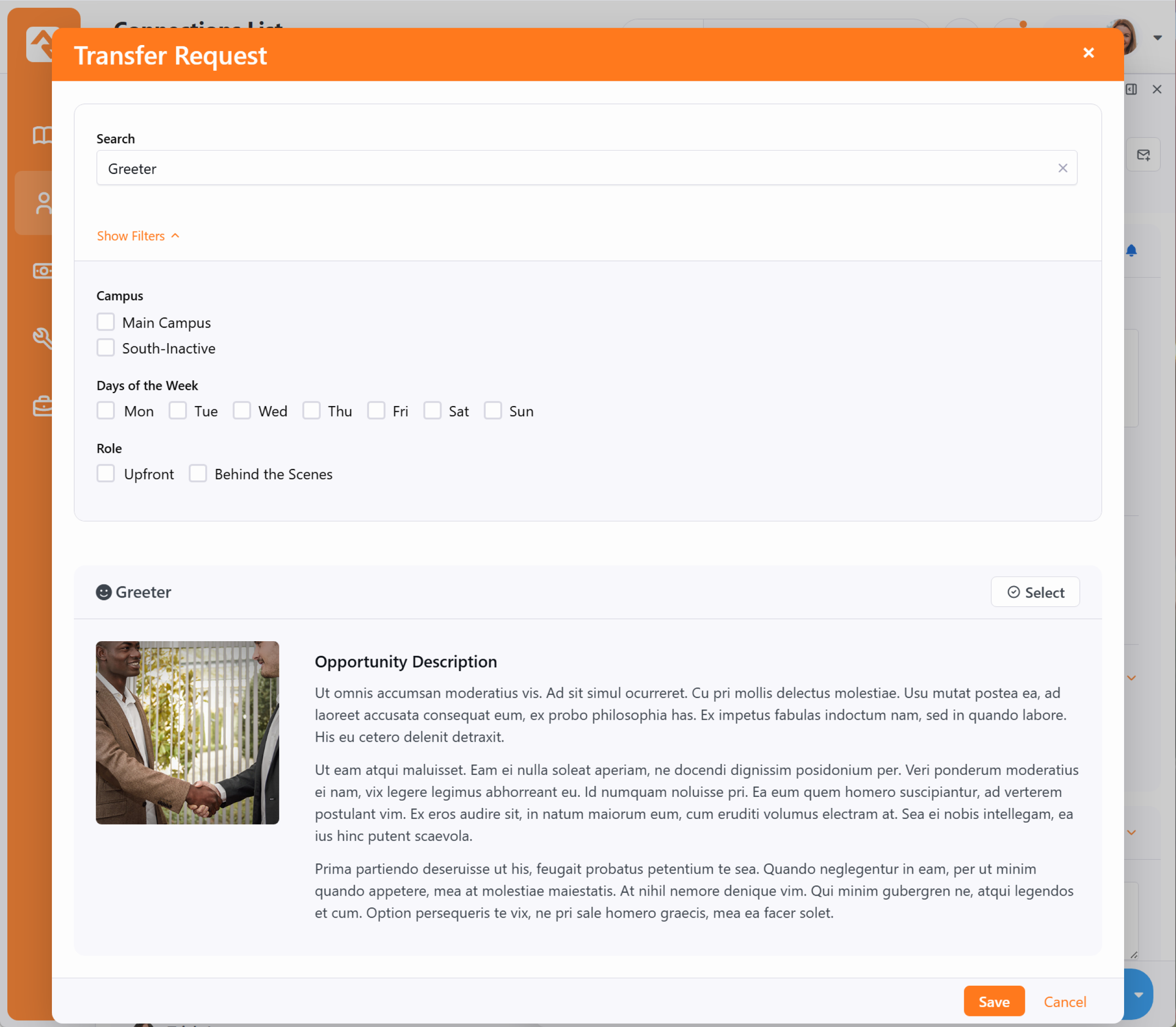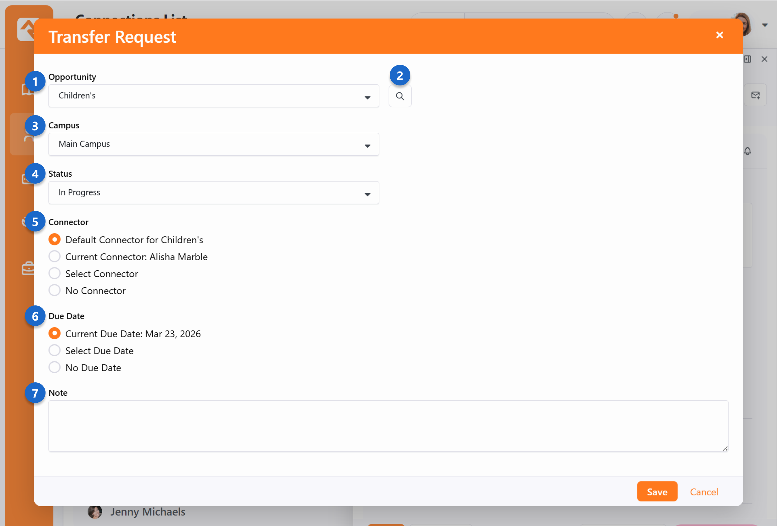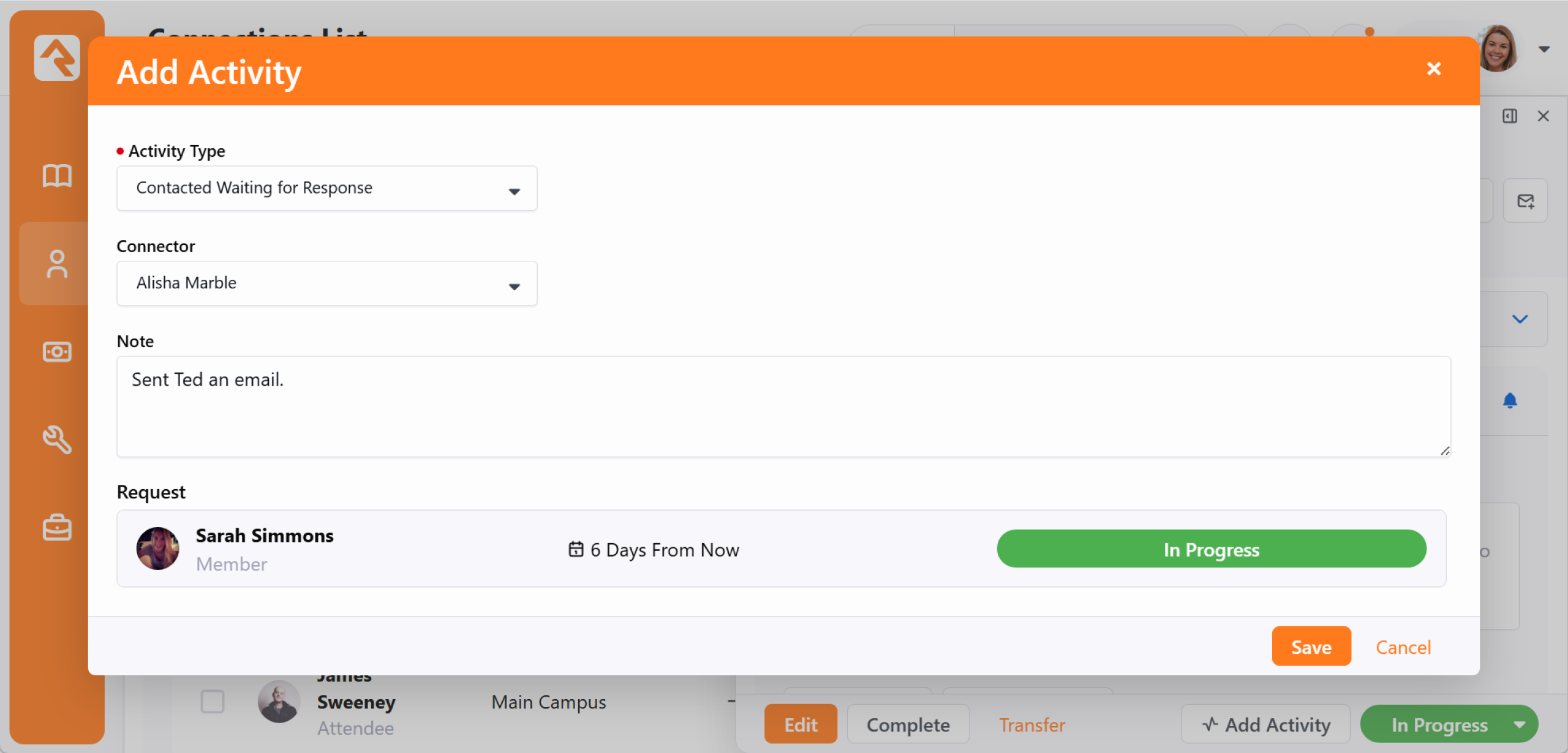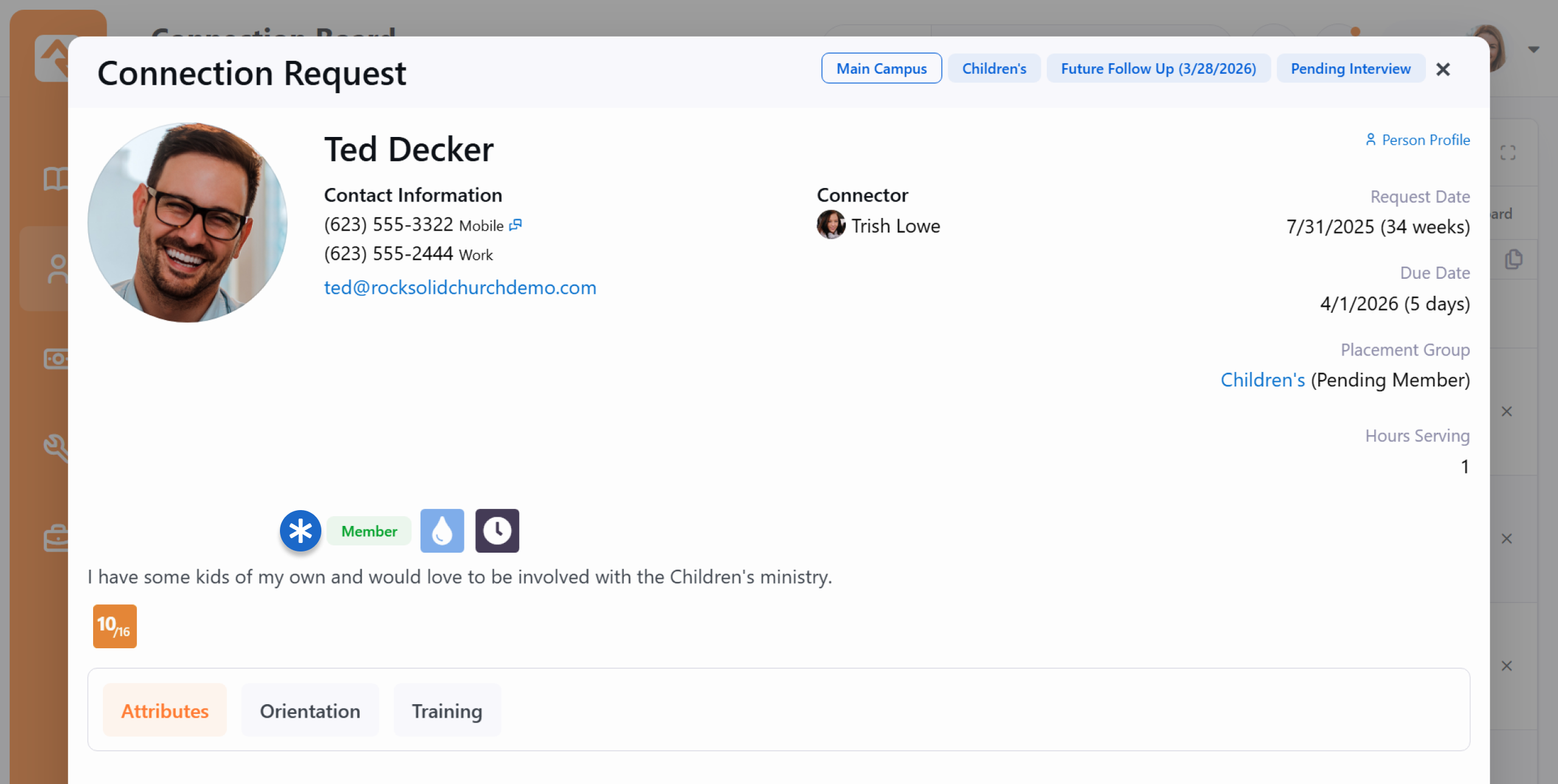 Every Connection Request can be customized to track the data most vital to your organization. In this section, we’ll explore how to configure key request components—including Activities, Badges, and Transfers. When a new request is created, Rock uses the surrounding context to intelligently auto-fill fields like the Connection Opportunity, streamlining the entry process. Once a request is live, you have a robust set of tools available to manage and alter its details as the relationship progresses. Adding Activities You can add new activities by selecting the ti ti-circle-plus button. This brings up the Add Activity window. You can use entity attributes to enter additional details related to the activity. Those attributes will be added to the window above according to your setup. Transferring a Request During the connection process it's common that the requestor (or connector) decided that this opportunity isn't a great fit. The transfer feature is a quick and powerful way to ensure the requestor can find a new opportunity that works for them. Click the Transfer button to bring up the transfer screen below. While it looks pretty simple, it has some powerful capabilities. (You will notice it looks a little different depending on which View you are using) Opportunity Selector - This is where you can select a different opportunity for the individual, if needed. By default, the opportunity being viewed is selected.Search - This allows you to find the best next opportunity. We'll dive deeper into this next.Campus - If enabled in the opportunity's configuration, and if you have more than one campus, you can transfer the request to a different campus using this drop-down. Status - This allows you to select the new status when the request is dropped into the new opportunity. This can be shown or hidden based on the opportunity's configuration.Connector - Most of the time you'll want to clear the current connector when you transfer the request. Sometimes you'll just want to select a new connector without changing the opportunity. Either way, the options provided here allow you to select:The default connector for the opportunityThe current connector (whose name, if available, will be displayed here)A new connector (which you can choose from the dropdown that displays when the option is selected)No connector Due Date - Assign a new deadline for the request at its destination, or select No Due Date if a specific timeframe isn't required. Note - This allows you to send a note to the new connection team. Through the transfer process you want to make sure you find each individual the right next opportunity. Otherwise, they might feel like a hot potato. The Search button allows you to look at all the new opportunities to help coach them on what might be best for their personality and situation. Below is the search screen where we've searched for "Greeter". There are also many ways to filter on the listed opportunities. Displaying Badges Badges are a great way to see a lot of information about a person at a glance. Displaying badges on your connection requests can save staff from having to look elsewhere for the information they need to get the right people connected to the right opportunities. In the example pictured above we’re displaying the Connection Status, Baptism and In Serving Team badges. You can choose which badges to display by editing the Connection Request Board block settings as shown below. NoteThe screenshot below shows the badge setup from the Board View, but don't fret, the setup is just about the same from the List View. Select which badges you want to display and click the Save button. Those badges will now be displayed for anyone with those connections. Super easy! Also within the block settings you can use the Lava Heading Template and Lava Badge Bar to further customize the page. The Lava Heading Template will appear above the person's name, while the Lava Badge Bar will appear below the person's details and above the attributes section.