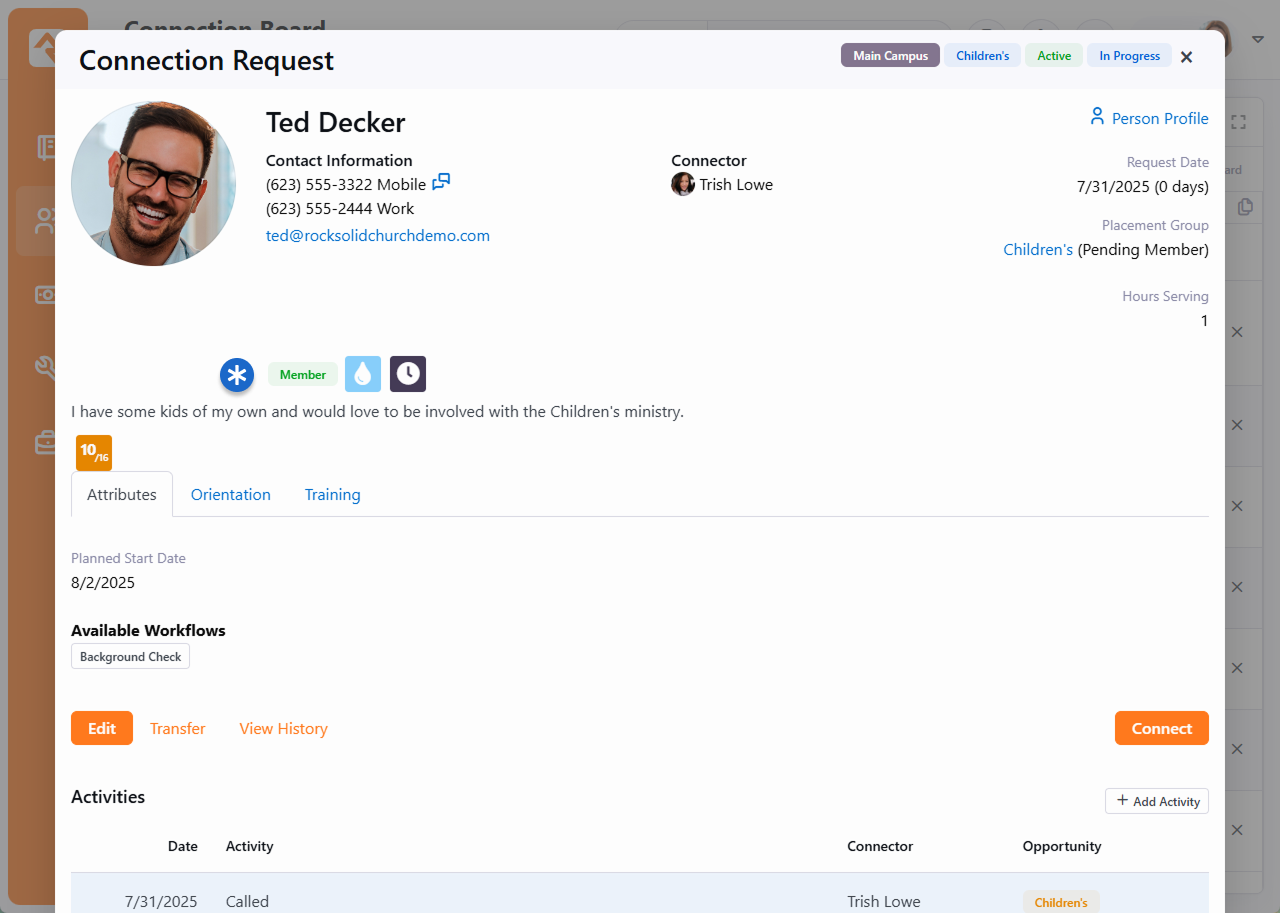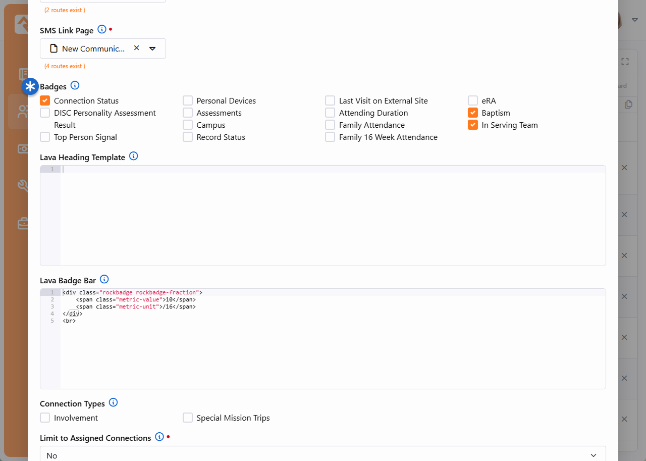 In the example pictured above we’re displaying the Connection Status, Baptism and In Serving Team badges. You can choose which badges to display by editing the Connection Request Board block settings as shown below.