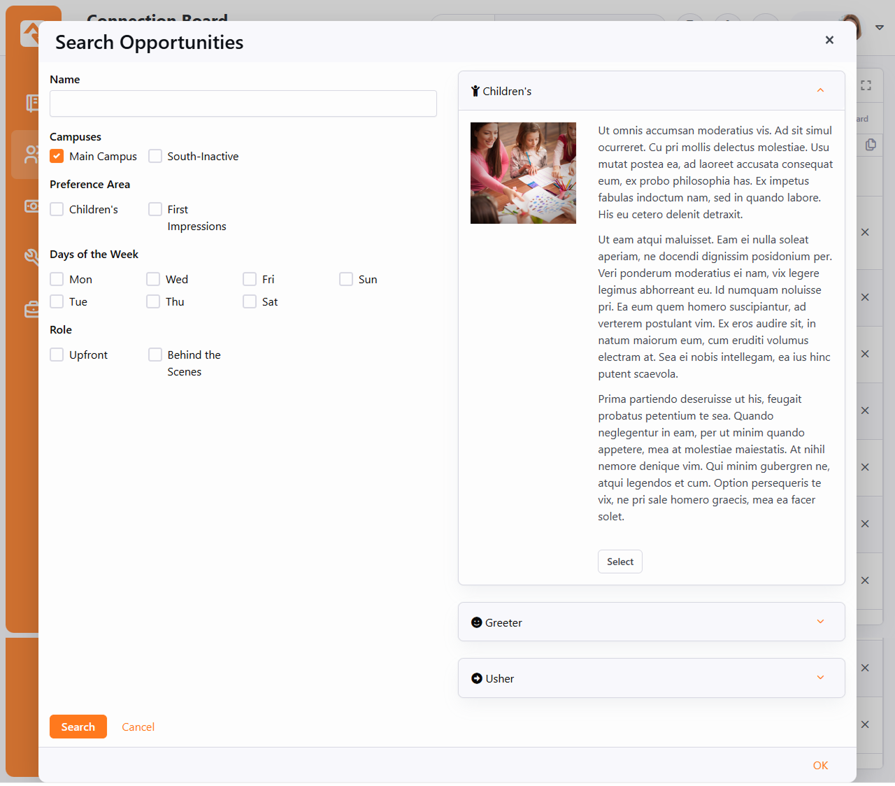 Through the transfer process you want to make sure you find each individual the right next opportunity. Otherwise, they might feel like a hot potato. The Search button allows you to look at all the new opportunities to help coach them on what might be best for their personality and situation. Below is the search screen for the Involvement connection type.