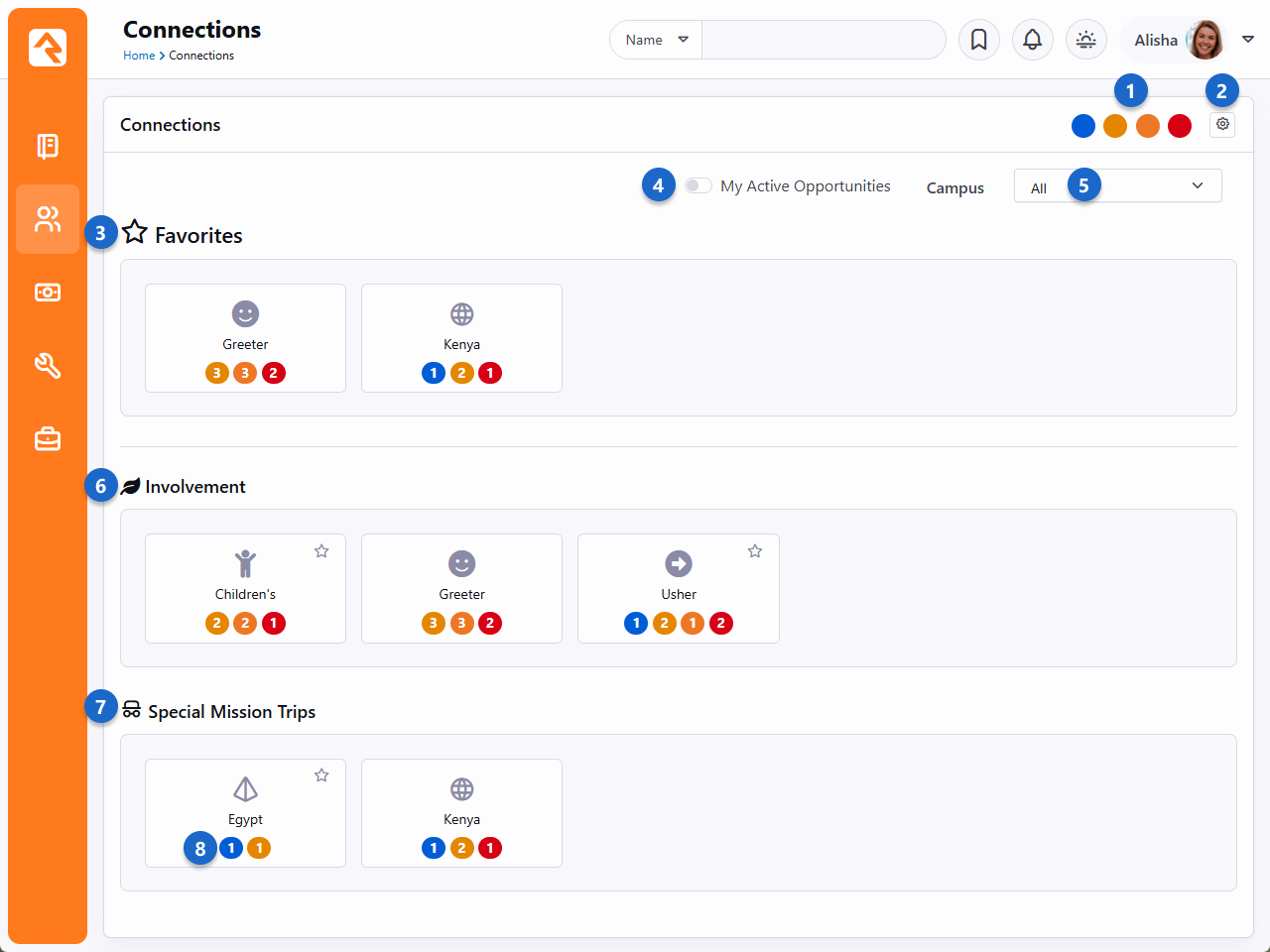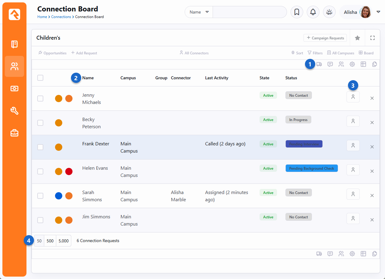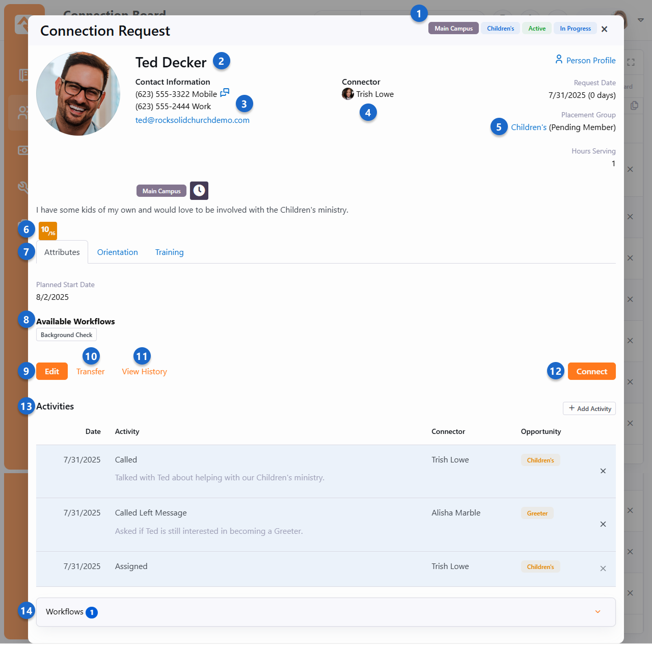 The connections tools can be found under People > Connections. This page gives you an overview of your organization’s Connection Requests, grouped and summarized by each Connection Opportunity and Connection Type. This is typically how you’ll access individual Connection Requests for specific people, which you can view as either cards or in a list format, but we’ll get to that in a bit. First, let’s take a look at the Connections page to see what we have to work with. Color Key - Each Connection Opportunity card has colored circles with numbers in them, and this key tells you what those colors mean. Hover your mouse over the circles in the key to see their description.Blue – Assigned to YouYellow – Unassigned Item (not assigned to anyone)Orange – Critical Status (e.g., person has not been contacted)Red - Idle (no activity in a configurable number of days) Connection Type Configuration - Click the ti ti-settings icon to manage your Connection Types. Rock admins and those in the RSR – Connection Administration security role will have access to this. We’ll talk more about configuring connection types below. Favorites - You can “favorite” individual connection opportunities by clicking the star in the top right corner of the opportunity’s card. Favorited opportunities will automatically appear at the top of the page under the Favorites heading, so you don’t have to go hunting for the ones you work with most often. My Active Opportunities - If you turn this on, the rest of the page below will be updated to show only opportunities with active requests that are assigned to you.Campus - Selecting a campus here will filter requests to show only those from that campus. When you click on a connection opportunity, the campus you select will automatically be applied as a filter when viewing the list (or board) of requests.Connection Types - Below your Favorites (if you have any set) you’ll see headers for each Connection Type. Connection Opportunities are displayed as cards below the name of the Connection Type to which they belong. In this example we have two Connection Types displayed, one for Involvement and one for Special Mission Trips. Connection Opportunity Cards - Each Connection Opportunity is displayed as a card. You can click on these cards to access details about the opportunity. We’ll show you what that looks like below.Opportunity Badges - At the bottom of each card, if applicable, you’ll see colored badges with a number that shows the total count of requests in a particular state/status (see #1 above). If there are no requests, or if all the requests have been closed out, you won’t see any badges for that opportunity. TipSee More with LavaIf you’re feeling creative (and a little ambitious), this block’s settings let you customize the opportunity cards using Lava. For instance, you can deploy the OpportunitySummary.StatusCounts array to display counts by Status. Just keep in mind that with very large volumes of connection requests, certain changes may have performance impacts. Clicking on any of the Connection Opportunity cards will bring you to the Connection Board, pictured below. The Connection Board gives you an overview of all the requests for the selected opportunity. Not only can you see each individual request, but you can also manage the Status of those requests without having to access each one individually. Campaign Requests - See the Connection Campaigns chapter below for the details on what this button does. In short, clicking this button allows a person to create more requests from the campaign list. Favorite - You can add or remove the Connection Opportunity from your Favorites by clicking the star icon. This is the same as the favorites we talked about above on the Connections page. Opportunities - In the screenshot above we’re looking at the Children’s opportunity. You can quickly and easily switch between opportunities by clicking Opportunities and selecting an option from the list that appears. Opportunities that you’ve favorited will be listed first. Add Request - Click here to add a new request for this opportunity. People can submit Connection Requests from your public website, which we cover below, but staff/volunteers can use this button to add requests themselves if needed. Connectors - This filter lets you view cards for all connectors, your connections or for specific connectors other than yourself.View Options - Use these to change how the cards are sorted, to apply filters or to view connections only for certain campuses. Each of these has different options, so feel free to experiment until you find the view that works best for you. There’s also a ti ti-list icon you can use to switch between the List and Board views, which we’ll talk about in detail below. Request Status Columns - You’ll notice that each connection request card is grouped into a vertical column. This represents the Status of the request, making it easy to quickly see which people are in what status. Even better, you can change the status of a request by clicking and dragging the card from one column to another. Or, see the Automating Status Changes section for details on automatically moving requests from one status to another. There is a maximum number of cards that can be viewed at once in each column, which is set to 100 by default but can be changed in the block’s settings. Connection Request Cards - Each card represents a connection request for an individual. Aside from the person’s name and photo, there’s a lot of useful information packed into these little cards. For instance, you can see the same color-coded badges that are visible from the Connections page as discussed above. You can also see a count of how many Activities have been added to the request, and how long it’s been since the most recent Activity. Clicking on the card itself will open up the details of the request, which we’ll cover below. List View As we mentio