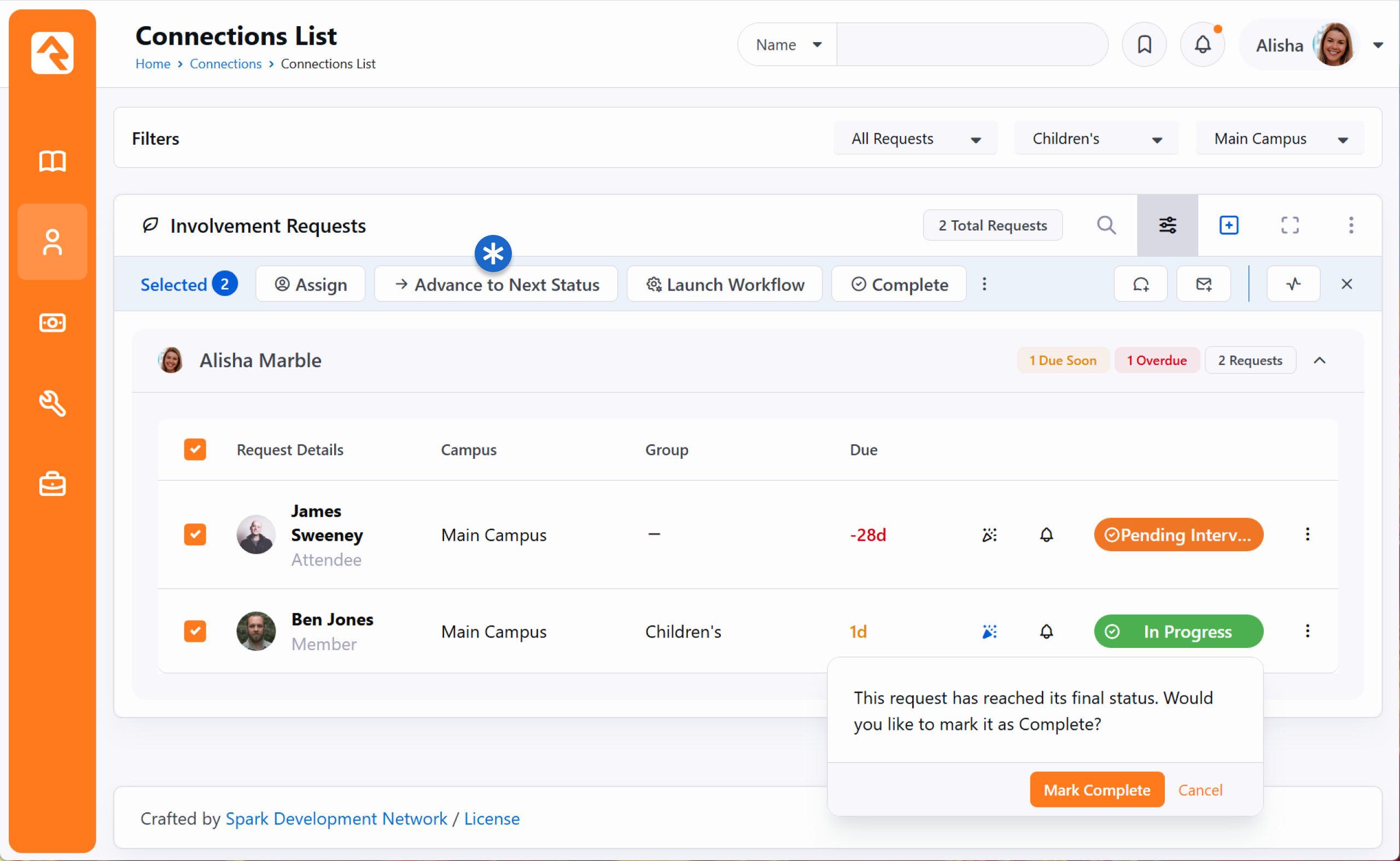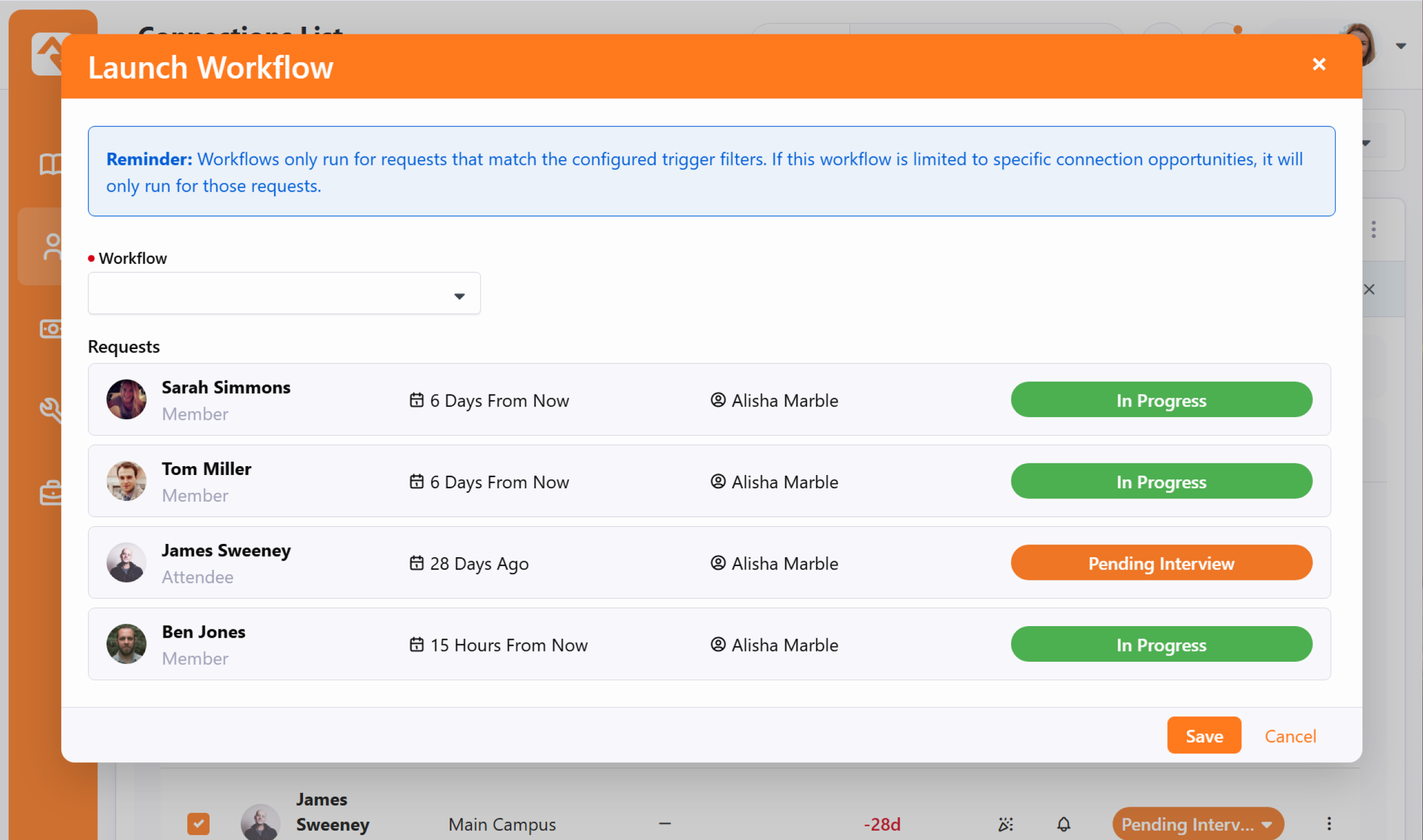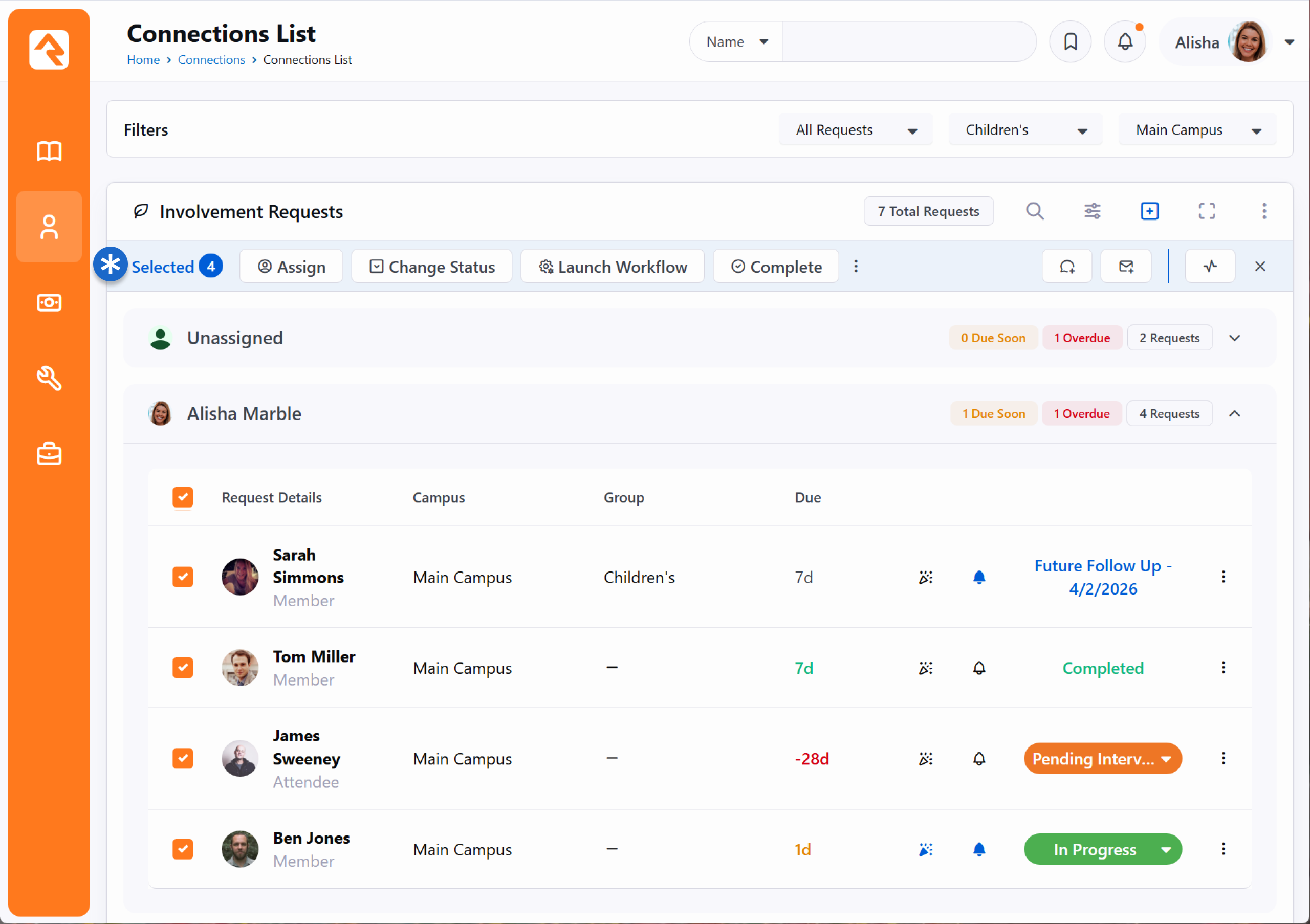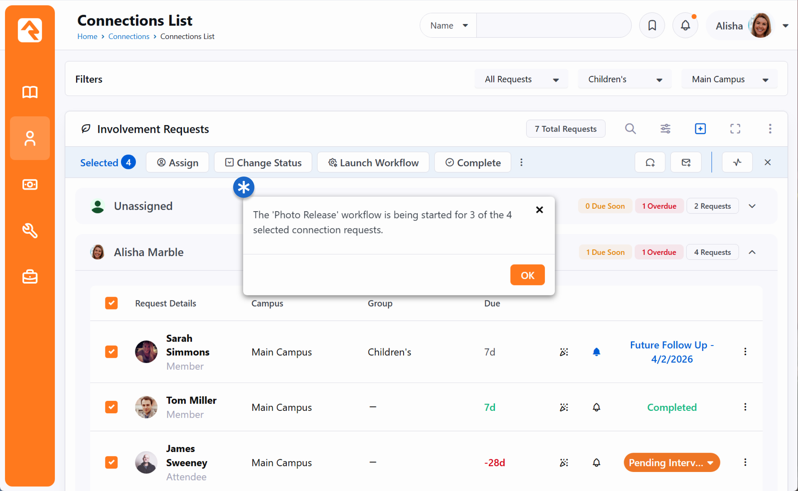 You’re likely familiar with the Bulk Update (ti ti-truck) icon found on many grids throughout Rock. However, when you’re viewing a Connection Type—found at People > Connections > "Connection Type"—this tool gains some specialized superpowers. Instead of standard data changes, these options are tailor-made for managing connection requests at scale. Let’s explore how these specific tools can streamline your workflow. Campus Filter - If you have multiple campuses, bulk updates to connection requests can only be performed one campus at a time. This is where you select which campus’s requests you want to update.Optional Updates - Here you can choose to change the opportunity, status or state for the connection requests. Just like other bulk update screens, you need to click in the small circle next to Status and State to update these fields. Connector - Select whether to keep the current connector, keep the default connector, select a connector from the configured list of connectors or assign no connector.Launch Workflow - If a workflow type is selected, then one workflow will launch for each connection request. The connection request itself will be passed to the workflow using a key of Request. Add Activity - You can optionally choose to add an activity to the selected connection requests. Clicking the Add Activity checkbox will cause the other activity fields to appear. List View Bulk Updates From the Connections List View, Bulk Updates are built in. If you select any checkbox on the grid, an action bar will pop up. From the action bar, there are many things you can do: ti ti-user-circle Assign - Use this to quickly hand off selected requests to a specific connector. It's the best way to balance the workload across your team or ensure a person is matched with the right leader.ti ti-select Change Status - This allows you to update where several people are in the process at once. If your organization uses Sequential Mode, the system will smartly guide you by only showing the next logical steps available.ti ti-circle-check Complete - When a person has successfully reached the end of their connection journey, use this to mark their request as finished and celebrate the win. ti ti-dots-vertical More - Click this to see additional actions.ti ti-user Set as Active - If a request was previously set to follow-up or even set as Inactive, this button brings it back into the immediate queue so connectors know it's time to re-engage.ti ti-user-off Set as Inactive - Sometimes a connection doesn't move forward right away. Marking it inactive keeps your workspace clean without losing the history of that person's story.ti ti-calendar Set as Future Follow-Up - Think of this as a snooze button. It "freezes" the request and hides it from view until a specific date you choose, ensuring you reach back out exactly when the time is right.ti ti-trash Delete - While we rarely want to remove a person's history, this option is there if a request was created by mistake, or is truly irrelevant. Just remember that this action is permanent. ti ti-message-circle-plus Send SMS - This opens up a quick message sender for everyone you've selected. It’s the fastest way to send a personal text or a quick update to a group of people simultaneously.ti ti-mail-plus Send Email - When you have more to say, use this to draft a bulk email. You can use system templates to keep things consistent or write a fresh message to guide your people toward their next steps.ti ti-activity Add Activity - This is your way of keeping the history book updated. Use it to log a specific interaction—like a phone call or a coffee meeting—for several requests at once. It ensures that anyone who looks at these records later knows exactly where the relationship stands. Trailblazer ti ti-settings-cog Launch Workflow - This is a powerful tool for automation. You can trigger specific processes—like background checks or automated welcome emails—for everyone you've selected simultaneously. You can only run Workflows that have a Trigger Type of Manual. Trailblazer Handling Exceptions Trailblazer When you are taking action on a bunch of requests at once, some are bound to have exceptions. Below we have an example where we've bulk selected individuals from different opportunities. Trailblazer Each opportunity has different Workflows available, meaning when we try to run a Workflow that is limited to one opportunity on requesters who are in multiple, it won't work on every one of them. No need to sweat it since Rock handles it elegantly. Trailblazer Above you can see that when we ran this bulk Launch Workflow action it says "The 'Photo Release' workflow is being started for 2 of the 3 selected connection requests". Rock will make it clear whether the bulk action you ran worked as expected, so you aren't left guessing. NoteBulk Status Updates in Sequential ModeWhen sequential mode is enabled on the connection type, the bulk‑update UI changes to a linear flow. Users must process statuses in order and cannot skip ahead.