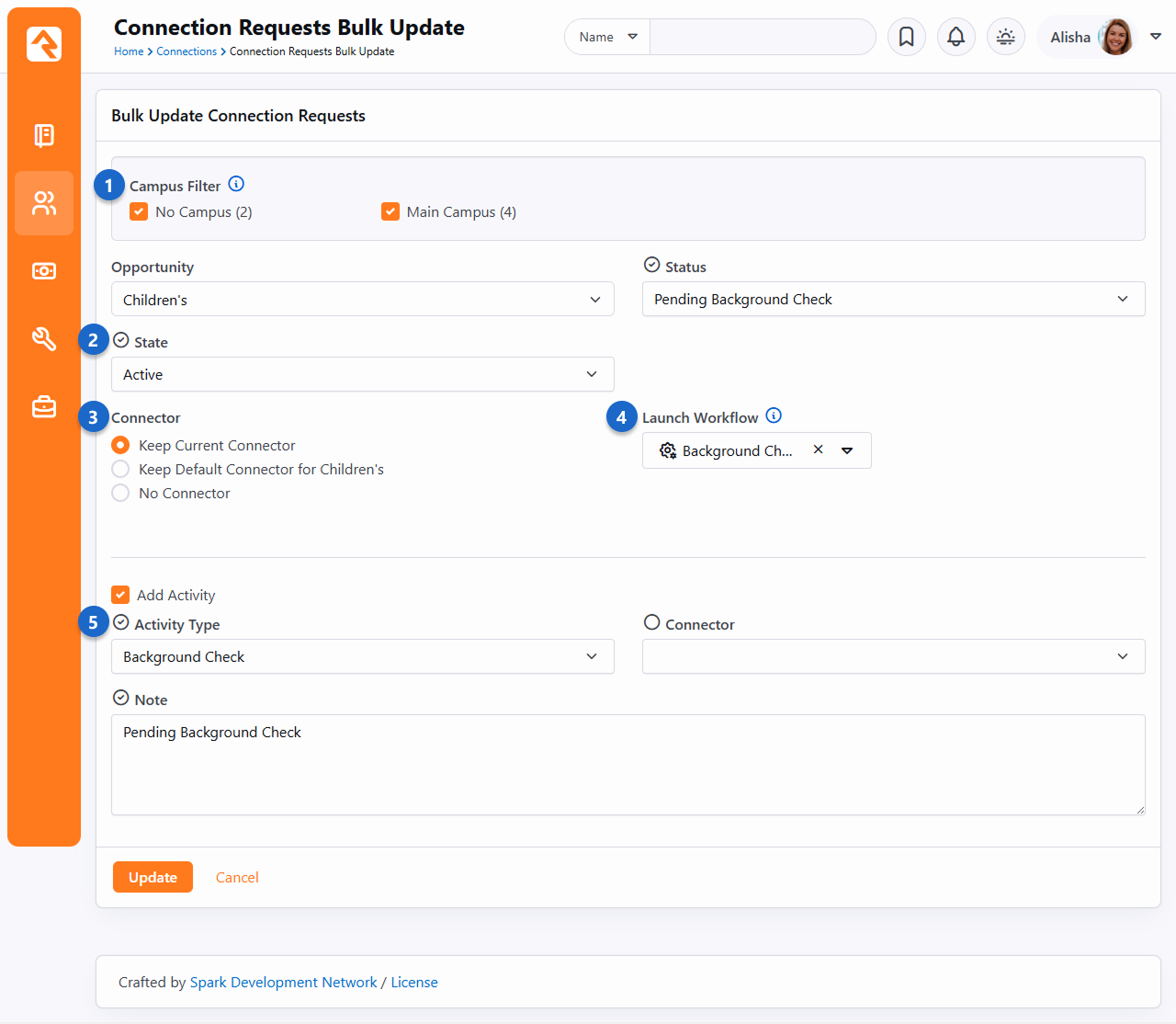 You might have noticed the ti ti-truck icon pictured on the Connections page at People > Connections > "Connection Type" and you have selected a Connection Type, looking at the List View. While you may be used to seeing this icon on other grids, it has a special function for connection requests. Instead of the traditional bulk updates that are normally performed, here you can make updates that are specific to connection requests. Let's take a look at the options. Campus Filter - If you have multiple campuses, bulk updates to connection requests can only be performed one campus at a time. This is where you select which campus’s requests you want to update.Optional Updates - Here you can choose to change the opportunity, status or state for the connection requests. Just like other bulk update screens, you need to click in the small circle next to Status and State to update these fields. Connector - Select whether to keep the current connector, keep the default connector, select a connector from the configured list of connectors or assign no connector.Launch Workflow - If a workflow type is selected, then one workflow will launch for each connection request. The connection request itself will be passed to the workflow using a key of Request. Add Activity - You can optionally choose to add an activity to the selected connection requests. Clicking the Add Activity checkbox will cause the other activity fields to appear.