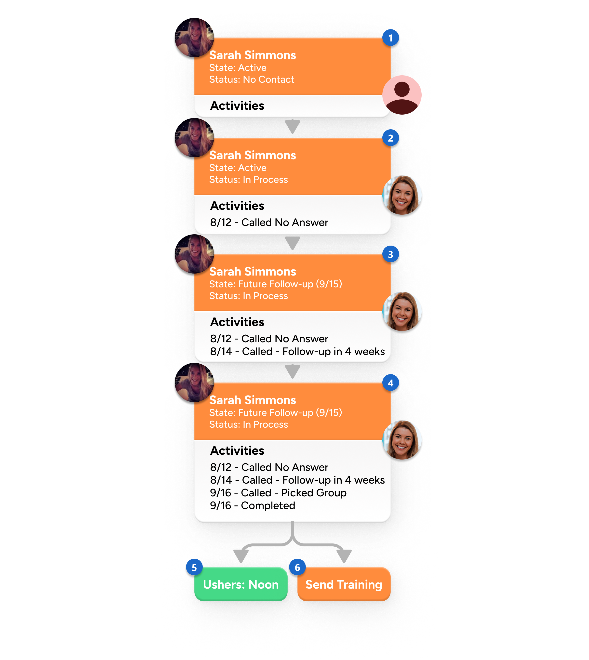 Many of your organization's strategies are about helping people move from one state to another. Often this movement isn't a straight line, but more of a meandering path. When the path takes an extended period of time it's possible for people to fall through the cracks. This is where the Connections tool comes to our rescue. While workflows can be a great help by connecting people through automated processes, they can quickly become complicated and unwieldy in complex situations. The Connections tools provide a backbone that allows you to build advanced processes. As you'll soon see, workflows still play an important role in Connections but more so as an extension of the foundation instead of the foundation itself. But enough talk... let's see for ourselves what the Connections feature can do. 10,000 Foot View of Connections When we started to work on the Connections features, we were trying to solve a specific problem: connecting people who want to serve. As we progressed through the ideation process, we started to see that this specific problem was really a reoccurring pattern inside of an organization. What we mean is, these features could be used in lots of different ways. With that realization we made the tool to be configurable for many different types of connection processes. Out of the box it's configured for a single Involvement (fancy term for serving) process, but we encourage you to build your own connection processes. You're not on your own, though; we'll show you how later. In most connection processes the goal will be to take a person who wishes to be connected to a high-level Opportunity and walk them through a series of steps or activities until they can be connected to a specific group. This will make more sense if we look at an example. Let's consider the Involvement connection type. Connection Type - Remember that you can create as many connection types as you want. Each type should represent a specific organizational process.Connection Opportunities - Each connection type can have numerous opportunities. In the involvement type these opportunities would be the high-level ministry areas where someone might be interested in serving (Ushers, Greeters, Parking Lot, Children's, etc.).Connection Requests - As people enter the connection process a Connection Request is created. This request could be generated by the individuals themselves through the website or entered manually by staff or volunteers.Opportunity Connectors - Each opportunity will have a group of connectors (staff members, team leaders, etc.) that work with the individual request through the connection process. As you'll see, next they can generate multiple activities and change the status of the request as they move the individual through the process.Placement Groups - The goal in many connection processes is to ultimately get the person to a specific group. For the involvement process this may be a serving team, but other connection types could place someone in a specific small group. Okay, now that we've seen all the components of a connection process, let's learn a bit more about the lifecycle of a request. Requests have a couple of different properties that allow us to describe their current state and see a history of previous activities. Each of these properties is discussed below. State The state of a request describes the standing of the request. There are only four options for state: Active: The request is currently being worked.Inactive: The request has either been completed or canceled.Future Follow-up: Often requestors will need more time before they are ready to be fully connected. The future follow-up state allows us to freeze the request until a specific date. This is helpful as it allows the connector to remove it from view until the specified follow-up date. The state will be changed back to Active by the Connection Request Workflow Triggers job based on the follow-up date. Completed: The request has completed the full connection process. Status You can define as many different statuses as you'd like for a request. These statuses are defined for each connection type. The statuses that have been configured for the Involvement connection type include: No Contact: This is the initial status of a request. It basically means nothing has been done with the request.In Progress: Once a connector has been assigned and communication has been attempted, then the status should be changed to In Progress. Remember you can customize these statuses and add your own. For instance, you could have a status for In Training or Complete. You can automate the process of moving individuals from one status to another. See Automating Status Changes for details. Activities Activities are a listing of events that have occurred during the process of connecting the requestor. You can customize what these activities are. The involvement connection type is pre-configured with the following activities: Called: A phone call was made, and the requestor answered.Called Left Message: Pretty much says it all.Called No Answer: You can probably figure this one out too.Contacted Waiting for Response: Some type of contact was made, and the request is waiting for a reply. While each request will only have one value for state and status, they can have as many activities as needed. Now that we understand the properties of requests, let's see them in action. New Connection - Sara Simmons makes a request from the website to get connected into the ushers opportunity. From this, a new connection request is created with the State of Active and the Status of No Contact. Also note that at this point no Connector is assigned. In Progress - After seeing it, Alisha Marble assigns herself to the new request and makes a first attempt at contact with the requestor. Unfortunately, Sara was at her daily spin class and missed the call. At this point, Alisha changes the status of the request to In Progress and adds an activity of Called No Answer.Future