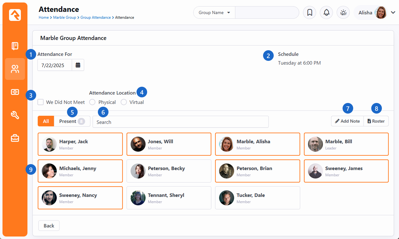 9. Members - Attendance is tracked by clicking the cards of those who attended. You can see here that nine people were in attendance on that day.