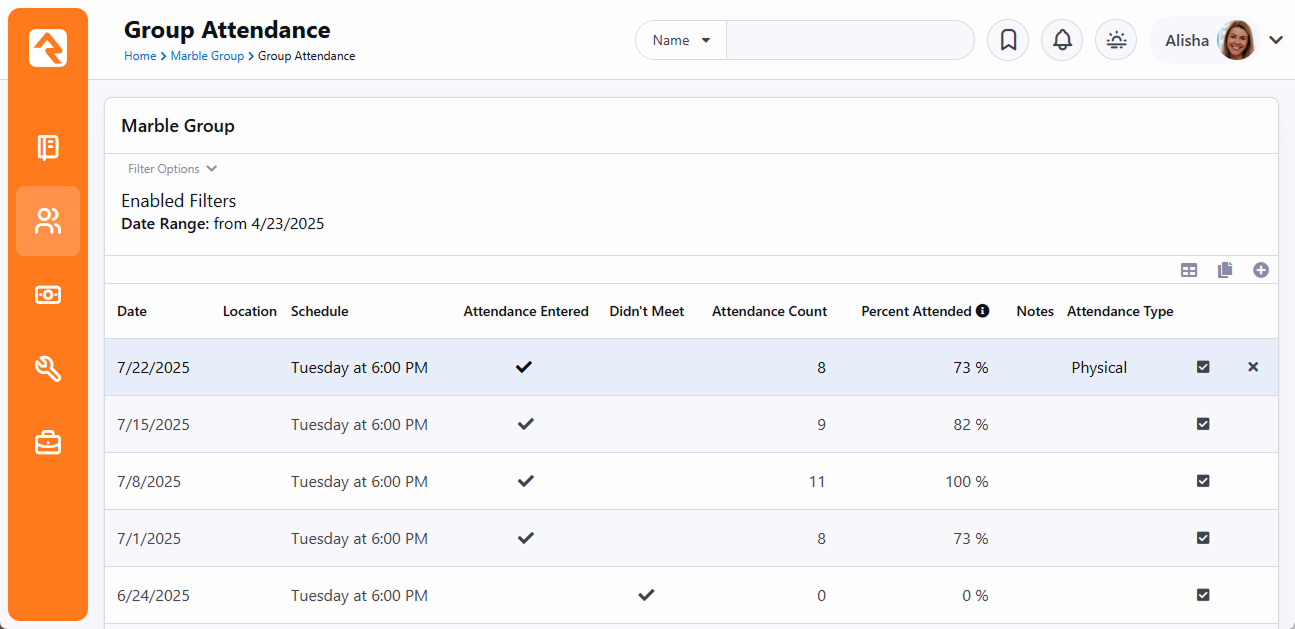 The Rapid Attendance Entry method of recording attendance may come in handy for your groups. To learn more, see the Rapid Attendance Entry chapter of the Checking-out Check-in manual.