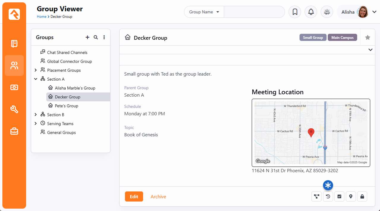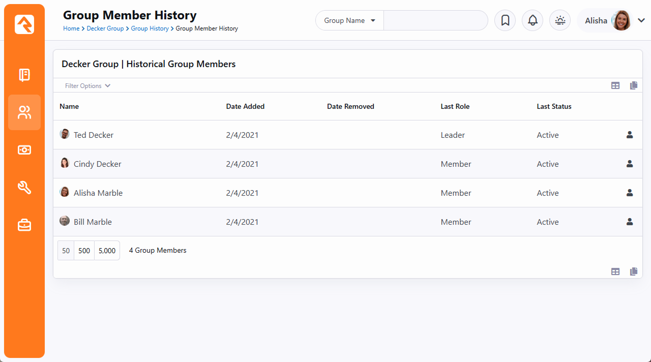 Now that you have Group History enabled, you can jump to that 40,000ft view. Locate the group in the Group Viewer and click the ti ti-history button. NoteArchived GroupsYou can Archive a group instead of deleting it. Archiving removes the group from the Group Viewer and other places where groups can be seen but allows you to restore it later. When a group has been marked as Archived and you want to bring it back go to: Admin Tools > Settings > General > Archived Groups Click on the ti ti-arrow-back-up icon to unarchive the group. Note: If a group type has 'Enable Group History' checked, once the 'Process Group History' job runs the 'Archive' button will be enabled on a group. This brings up the group's timeline view, shown earlier, including both member and group history information. The Group History screen shows the history of the group by day for the lifetime of that group. Each event on the timeline has an icon that corresponds to a type of action. ti ti-user-plus - Member addedti ti-user-x - Member removedti ti-pencil - Group editedti ti-users - Other/general group action If there is more information than space available for an event on the timeline, you can view the entire contents by hovering your mouse over the text. For multiple occurrences on the same day, Rock will display a link to expand the area to display all of the actions for that day. To hide member history and view only actions made on the group level, click the ti ti-settings button. You can also zoom in from that 40,000ft view and get a closer look at the history of the members of a group. Click Member History to display a group's members and the history/dates of their involvement in the group. Click on a specific person to view a timeline of their involvement with the group.
