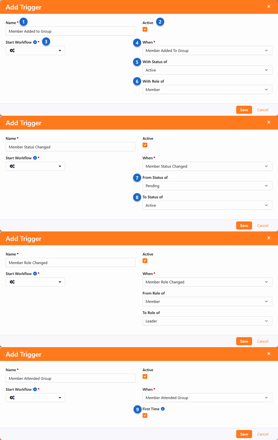 By now you realize that groups are the backbone of Rock. So, it makes sense that we'd invest in making them as powerful as possible. Group Member Workflows are one of these investments. So, what do they do? Group Member Workflows are an easy way to trigger workflows to launch when the state of a group member changes for a specific group. These events include: Being added to a groupBeing removed from a groupMember status changes (e.g., status changed from Member role changes (e.g., role changed from Member attendanceMember alternate placements (discussed in detail in the next chapter) The workflows you define for these triggers can be configured for all groups of a specific type under:Admin Tools > Settings > General > Group Types or for a specific group under People > Group Viewer > Group. Below is the screen you'll see in either case. Note that workflows for a specific group can only be added if Allow Specific Group Member Workflows is enabled for the Group Type. NoteRequired AccessYou must have Administrate access to a group to be able to configure Group Member Workflows. Name - This is the name you want to use to describe the trigger.Active - Indicates whether this trigger is currently active.Start Workflow - The workflow type you'd like to start when the trigger conditions are met.When - This determines when the trigger should be considered.With Status Of - This allows you to filter when the trigger is applied for members with a specific status.With Role Of - This allows you to filter when the trigger is applied for members with a specific role.From Status/Role Of - Determines what the original status/role was to use as a trigger filter.To Status/Role Of - Determines what the new status/role must be for the trigger to fire.First Time - Determines if this trigger should only be activated the first time a person attends this group, or every time. See our Blasting Off With Workflows guide for more information on working with workflows.