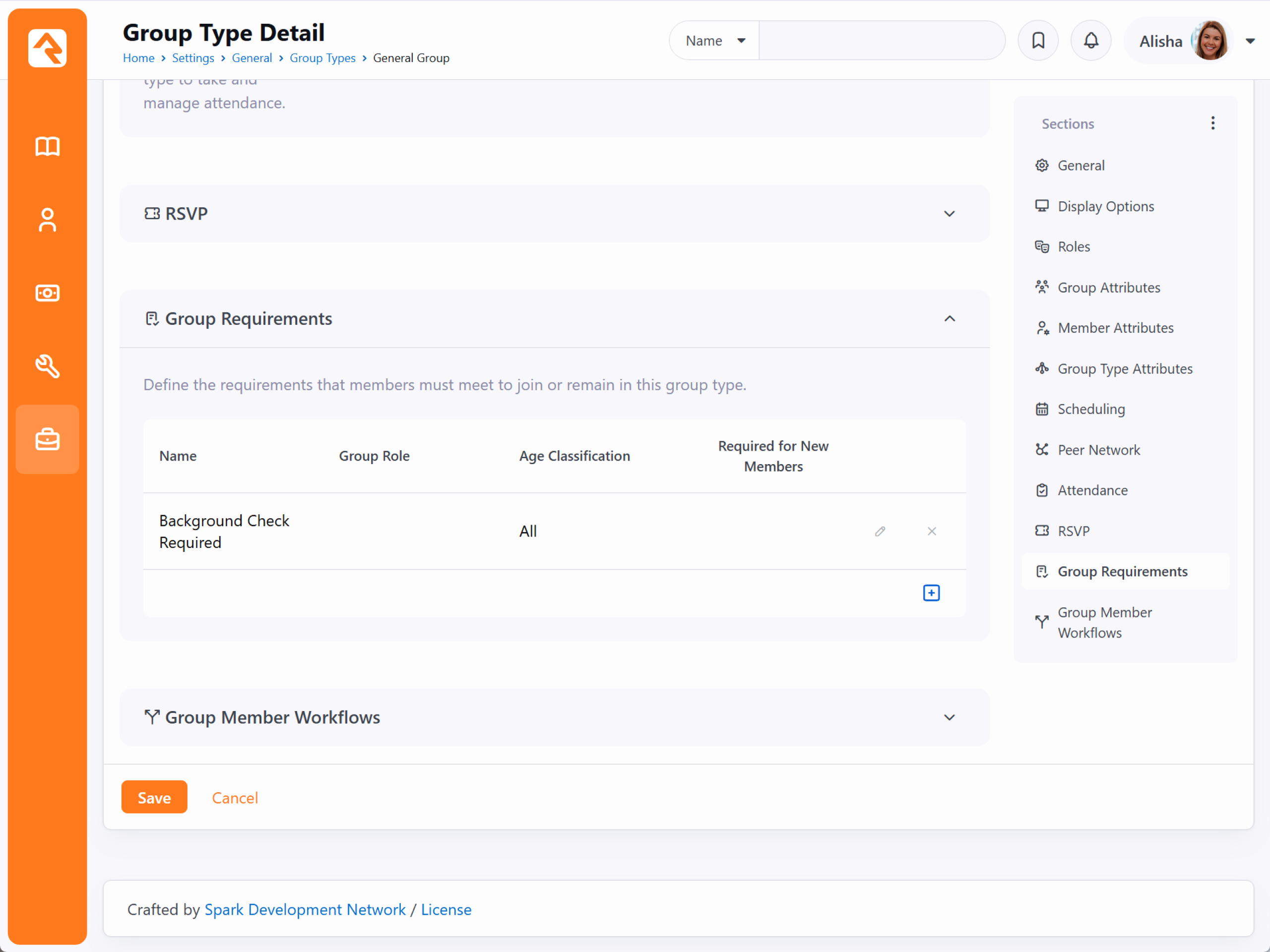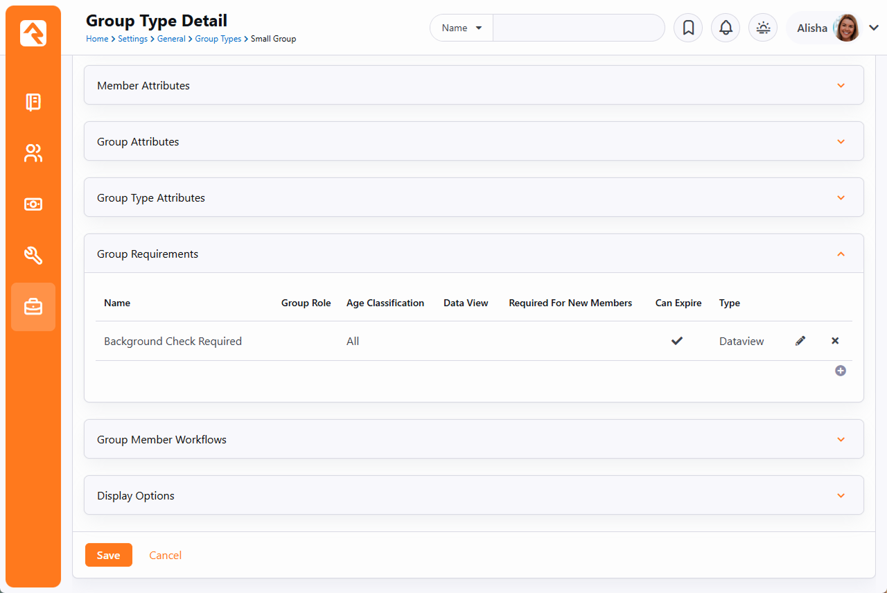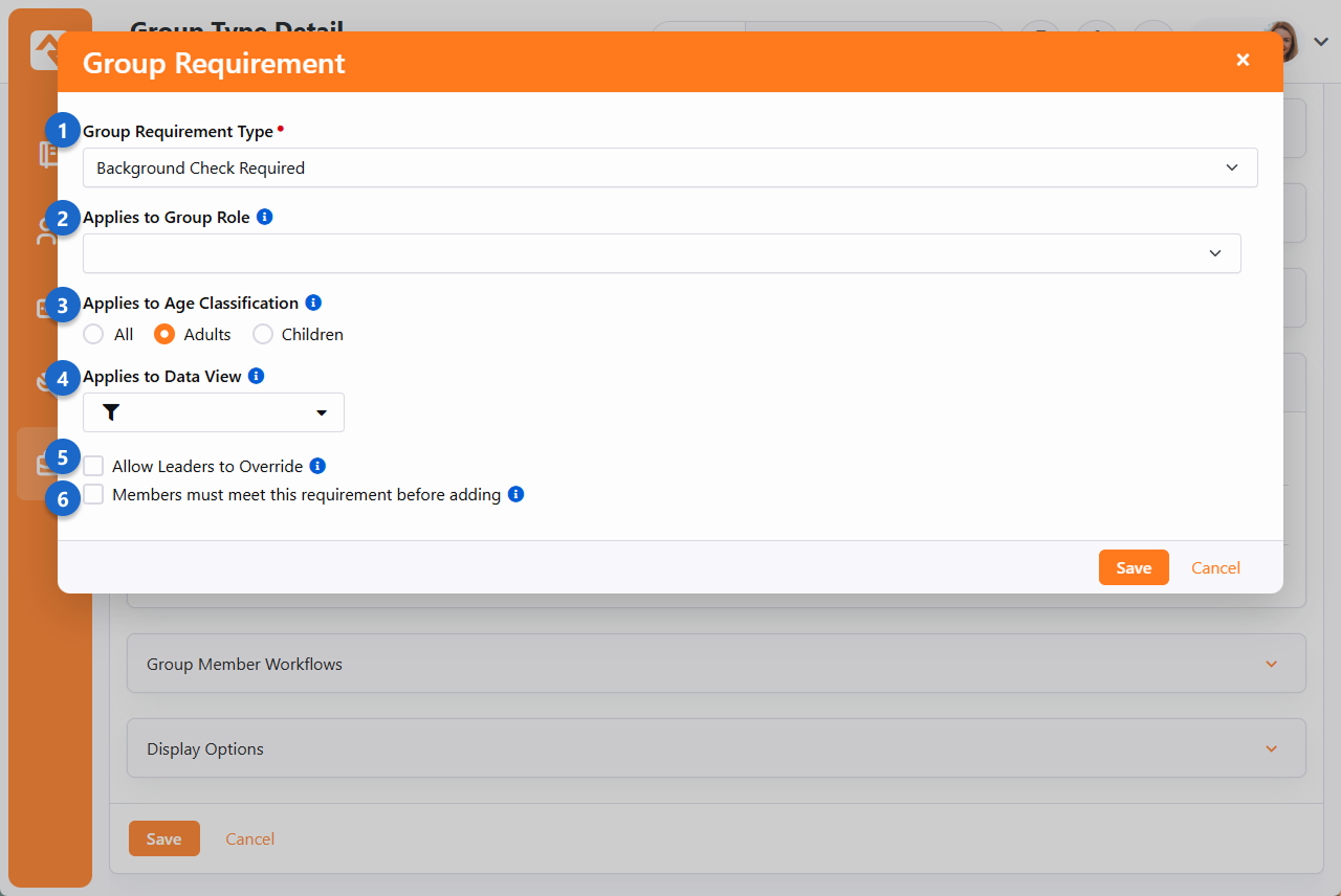 You can also set group member requirements at the Group Type level. This allows you to apply member requirements to all groups of a certain type rather than to each individual group. To access your group types, go to Admin Tools > Settings > General > Group Types. Select the group type you want to add requirements to from the Group Type list. In the Group Type Detail screen, expand the Group Requirements section. From here you can either select an existing group requirement to edit or click the ti ti-circle-plus button to add a new requirement. Group Requirement Type - This is simply where you pick the requirement you want to apply. This is where having a descriptive name pays off.Applies to Group Role - You might have some requirements that only apply to Leaders or that only apply to Members. Whatever roles you have, this is where you indicate which role the requirement applies to. If this is left blank, then the requirement applies to all roles.Applies to Age Classification - Sometimes requirements like background checks only apply to adults, whereas a waiver for minors would only apply to children. Here you can choose which age classification the requirement applies to or apply it to all age classifications.Applies to Data View - This is an advanced setting that lets you provide a data view to indicate who the requirement should apply to. This is only needed if the above settings aren't targeting the desired population.Allow Leaders to Override - For some types of requirements, it makes sense to allow group leaders to provide an override.Members must meet this requirement before adding - You might set up some serving teams this way, to ensure new members have passed a background check before they get added to the group.
