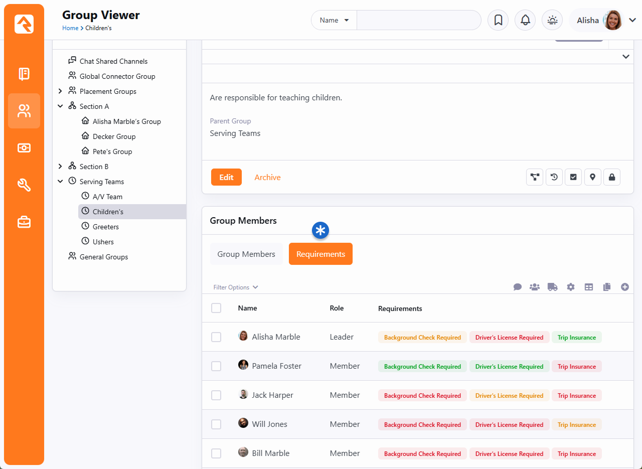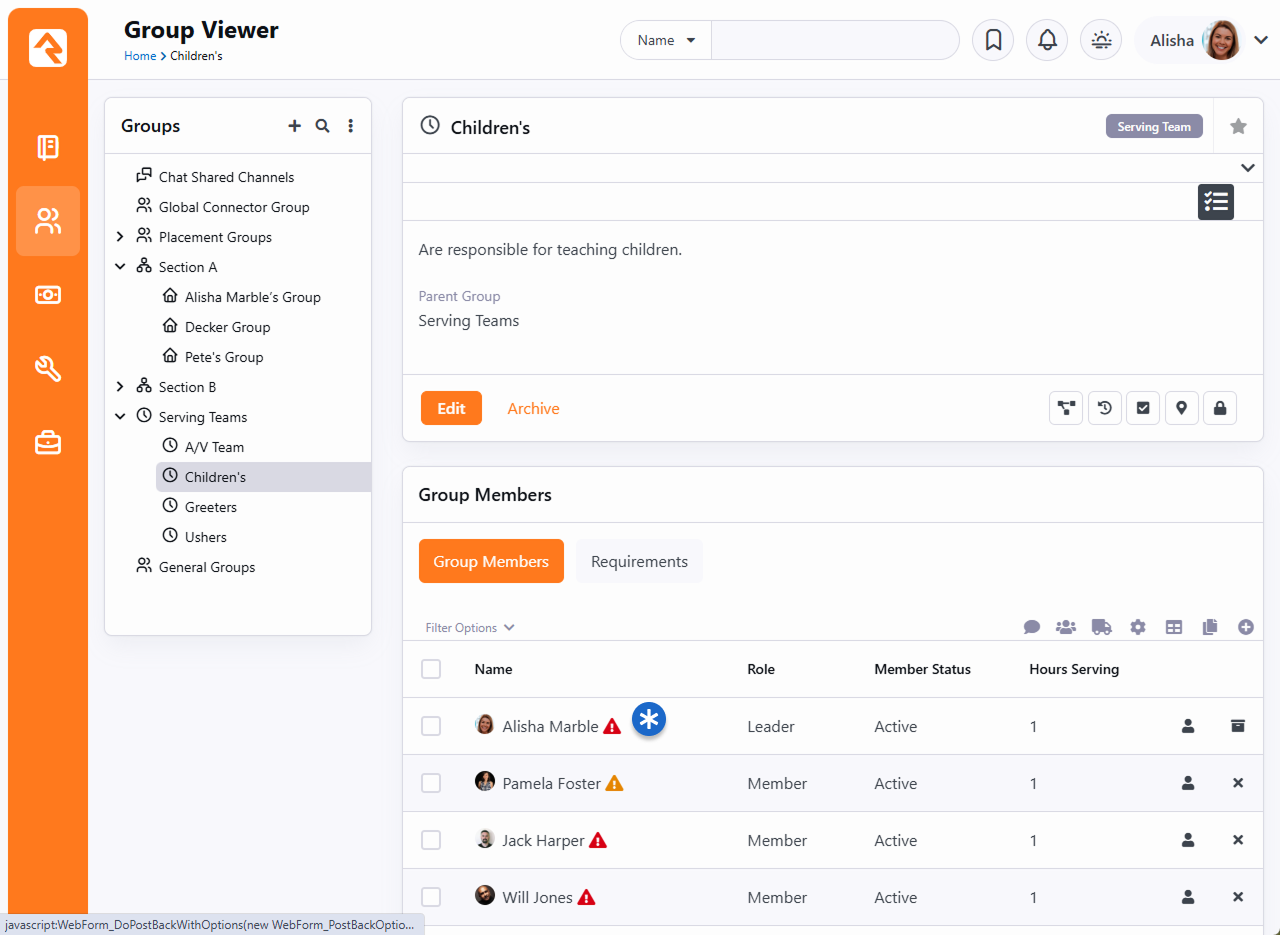 Once you enable group requirements, you'll notice in the Group Viewer that certain group members may have warning icons next to their names. The yellow icon denotes that the group member is in a warning state, while the red icon indicates that the group requirements are not met.