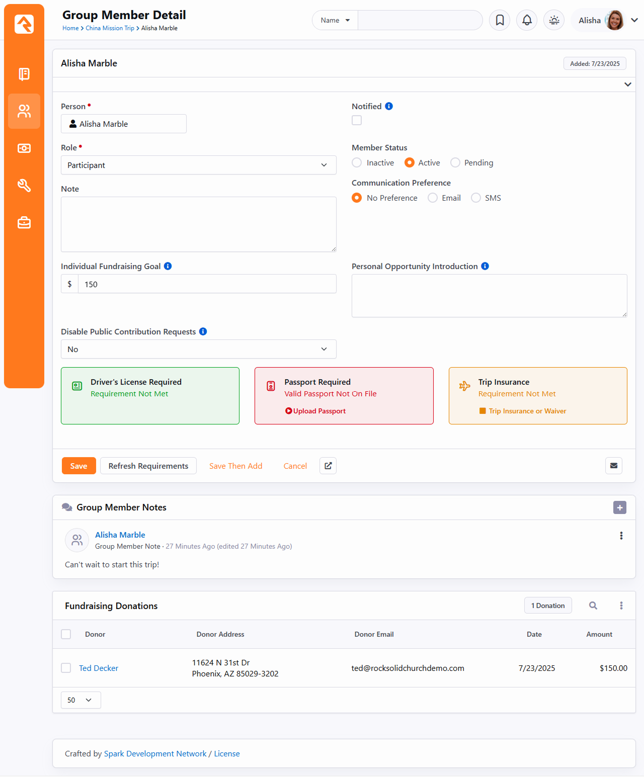 Clicking on a group member will show you details about the group member and the group's requirements. In the group requirements note that you can Upload Passport for Ted or mark his Trip Insurance requirement as met.