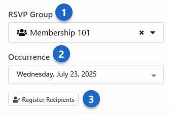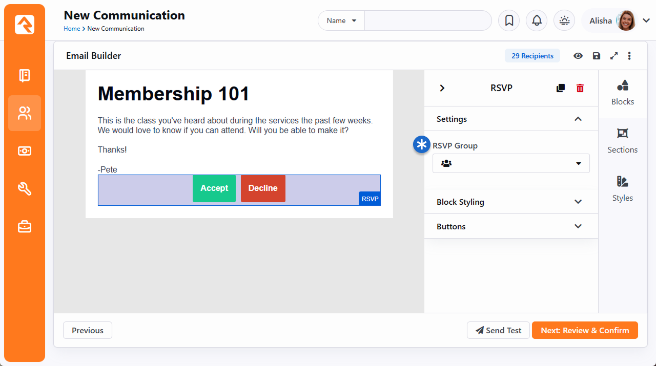 Now that we have an occurrence set up, we’re ready to send out some invitations. Adding an RSVP request to an e-mail is as simple as clicking and dragging the RSVP tool button (look for the ti ti-user-check icon) into your email. If you’re not sure how to get to this point, check out the Communication Wizard section in the Communicating With Rock guide. After the RSVP buttons have been added to the body of your email, use the panel on the right to select the group and occurrence. Select Group - Choose the group associated with the occurrence. Only group types with RSVP enabled will be in the list of options.Select Occurrence - Pick the occurrence for which you want to send an email. The RSVP responses you receive will be for this occurrence.Register Recipients - Click the Register Recipients button to keep track of RSVP data for all the recipients of your email. If this button isn’t used, only people who have responded to your RSVP request will appear in the RSVP List or RSVP Detail pages.Show Advanced Settings - You can use the advanced settings to customize how the RSVP buttons are shown to invitees.