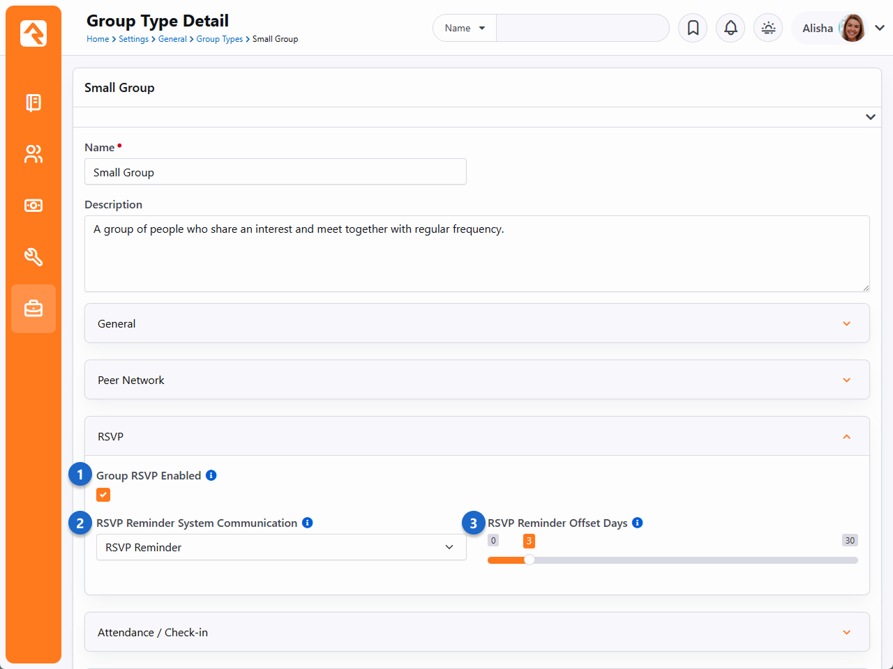 The RSVP function is enabled in group type settings, making RSVP features available to any groups within that type. All RSVP features are tied directly to a group. That means you must have a group created before you can use RSVP. The group doesn't need to have any members, but it needs to exist so individuals who accept your RSVP can be added to it. To enable RSVP for a group type, navigate to Admin Tools > General Settings > Group Types and open the RSVP settings for the group type. Group RSVP Enabled - This checkbox must be selected to access RSVP features for any group of this type. Once enabled, the other two fields related to RSVP will appear.RSVP Reminder System Communication - Select the System Communication that should be used to send reminders to invitees who have Accepted. Only communications in the “RSVP Confirmation” category will be available for selection. The selected communication will automatically be used with all groups of this type. Leave this blank to set the System Communication on each group individually.RSVP Reminder Offset Days - Indicate how many days before the event the reminder should be sent. Like the communication selection, you won’t be able to change the offset days for individual groups if you set a value here. All groups of this type will inherit the offset days set at the group type level. Set this to '0' days if you instead want to manage the reminder offset days on each group individually.