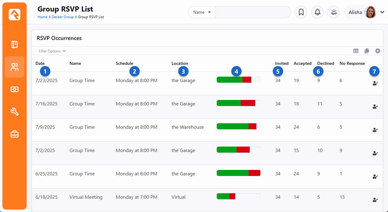 Clicking the ti ti-user-check icon takes you to the Group RSVP List page. It will be empty when you first start, but after you add a few occurrences to the list (see RSVP Occurrences) you’ll quickly see how useful this page is. Let's take a look. Date - The date of the occurrence is shown in the first column. You can use the Schedule - The check-in schedule associated with the occurrence, if applicable, is shown here.Location - If a location has been assigned to the occurrence you can see it here.Response Progress Bar - This column gives you a graph of RSVP response data:Green = AcceptedRed = DeclinedBlank/Gray = No Response Invited - You can view the count of all invitees for the occurrence, so you know how many people were invited.Response Statistics - In this part of the block, you can see how many people have replied to the RSVP with either an Accept or Decline, and a count of how many haven’t responded.RSVP Detail Icon - Click the ti ti-user-check icon to access the RSVP Detail page (see RSVP Detail).