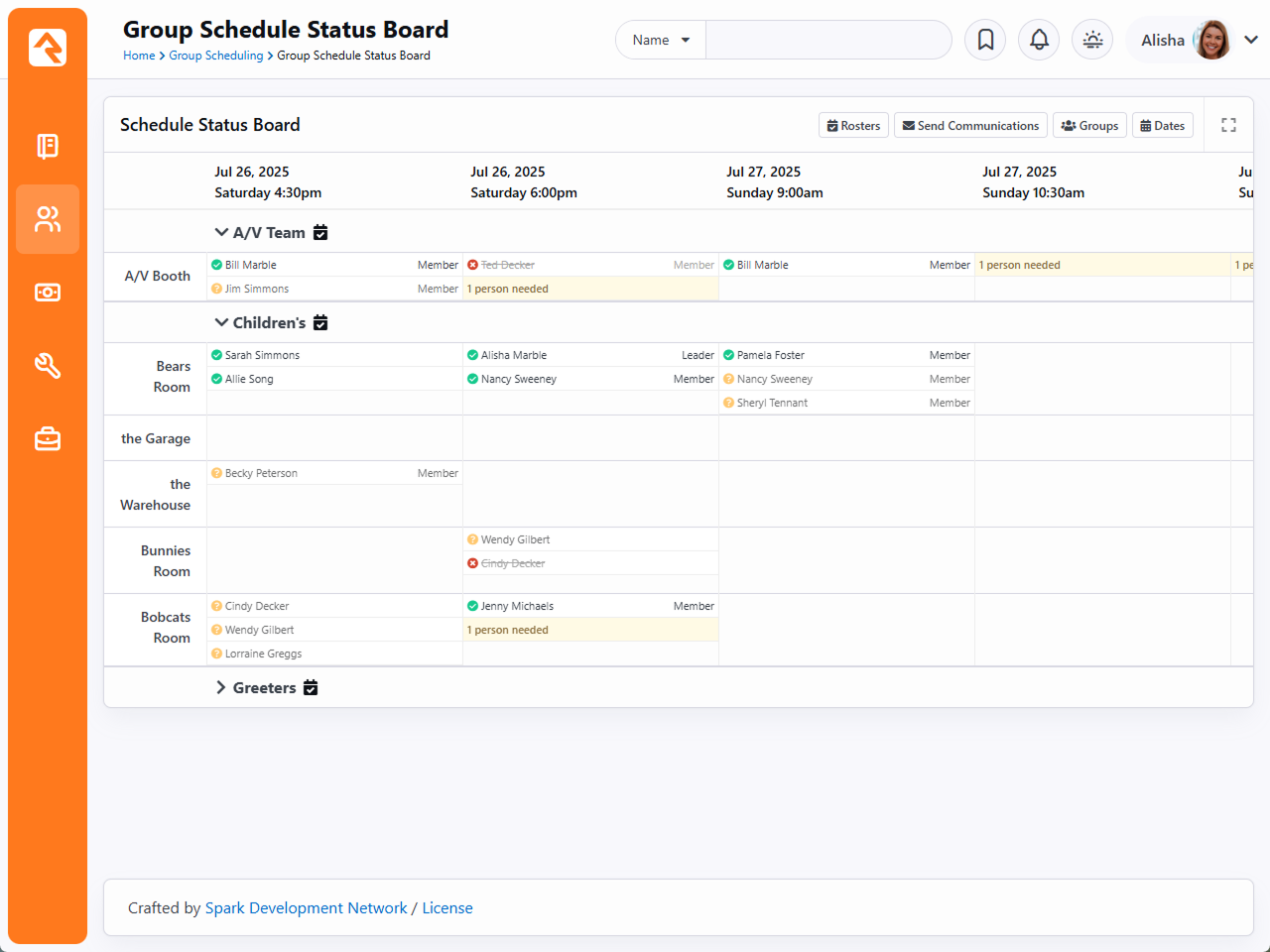 The status board gives you a bird’s-eye view of rooms and times, showing what's covered and what is still needed. You can access the status board by navigating to People > Group Scheduling > Group Schedule Status Board. The block settings allow you to choose a parent group to filter out any unnecessary groups showing in the select groups list. The Dates button opens a slider bar to choose how many weeks to show at a time. You can also access the Group Schedule Roster and Group Schedule Communications pages directly by clicking their links near the top of the page.