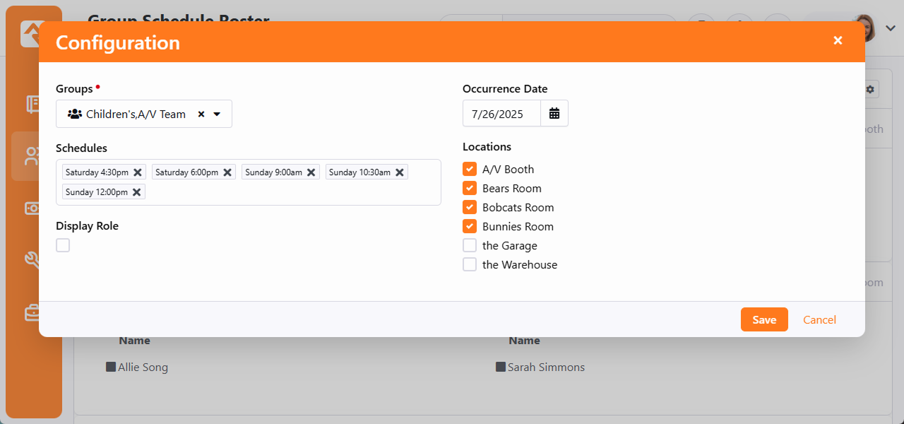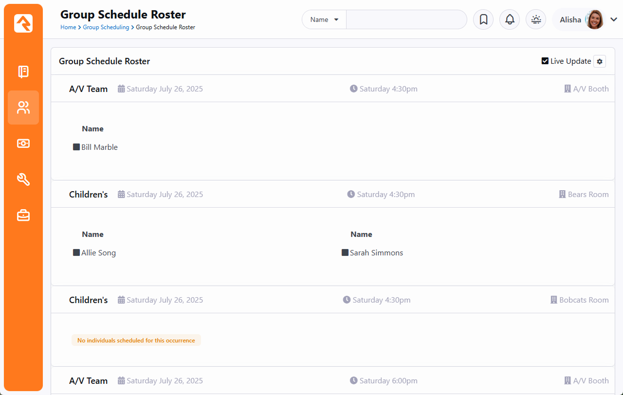 The Group Schedule Roster shows you who’s serving, plain and simple. Of course, you can see this information from other group scheduling tools, but the roster provides a clean, simplified view of volunteers and where they’re scheduled. This layout is great for printing, to give your staff a paper copy they can use to track volunteers. It even comes pre-populated with checkboxes next to each person’s name, so individuals can be marked off the printed list. To access the roster, navigate to People > Group Scheduling > Group Schedule Roster. You can click the ti ti-settings icon to access the configuration for the roster. These settings let you add or remove the groups, locations and schedules shown on the roster. This way you can rapidly print several different rosters for the day. This is also where you change the date of the roster, to view assignments on different dates. By default, the roster is updated automatically every 10 seconds, to pick up scheduling changes as they occur. After all, you don’t want to print outdated rosters, and last-minute changes are always a risk. This “Live Update” feature can be disabled, or set to a different refresh frequency, by accessing the block’s settings. Just keep in mind that a very frequent refresh rate may negatively impact performance.