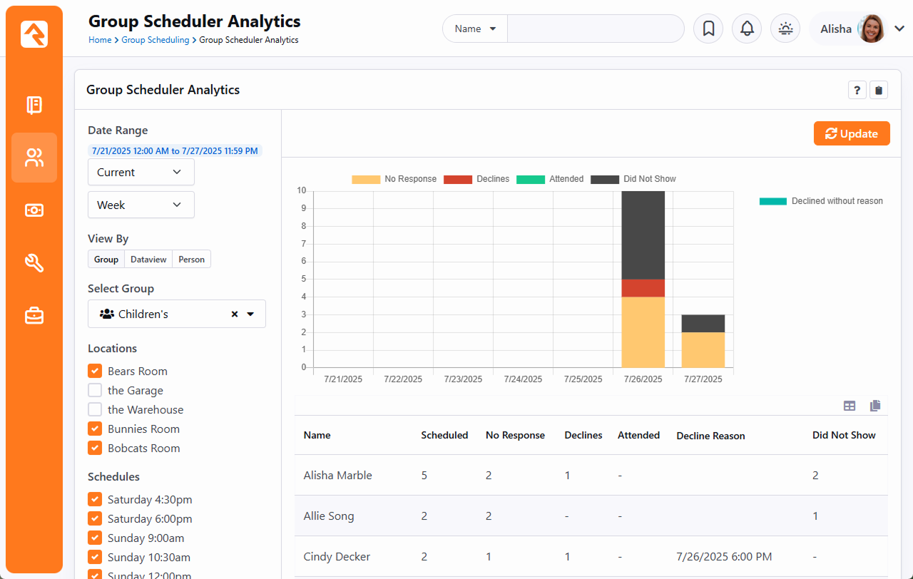 The analytics board acts similarly to the scheduler page. You can choose the group, location and schedule then hit Update to show records of the response, or lack thereof, in one place.