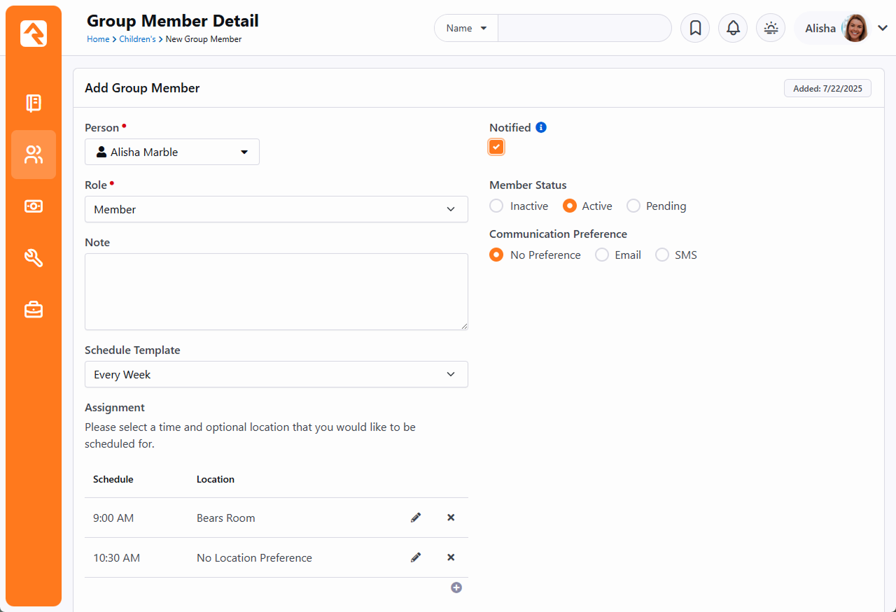Schedule Unavailability Next, we'll look at how to set the dates for when you’re unavailable to serve. The below screen can be accessed by clicking on the Schedule Unavailability button from the main Schedule Toolbox page. Date Range - This is where volunteers can select dates indicating when they can’t serve. This will prevent the person from being scheduled to serve on those dates.Unavailability Notes - The person can optionally provide a description, indicating why they are unavailable for the selected dates.Group - A volunteer can be unavailable for serving in a single group, or across all groups.Individual - If a person is unavailable, it's often the case that others in their family are also unavailable. Here the person has the option to indicate which family member(s) are not available to serve on the selected dates. Whoever is selected on the main Schedule Toolbox window will be at the top of the Individual list and will be automatically selected. The list of available groups from the Group drop-down is based on this person. Update Schedule Preferences The screen displayed below is accessible by clicking the "Update Schedule Preferences" button on the main Schedule Toolbox page. You can switch between groups by clicking on the headers at the top of the block. In block settings, you can choose to display the group's campus in these headers. If no abbreviated name is configured, the full campus name is used. Send Reminders - Each volunteer can select how long before a scheduled serving time they want to receive a reminder that they're scheduled to serve. They can also choose to not be sent a reminder at all.Current Schedule - This is where volunteers can set the frequency of their serving. Options include:Assignment Preferences - This is where volunteers can set their preferences for when they would like to serve and where. Or, a person can choose not to select a location, indicating they don't have a location preference. Only named schedules marked as The person's assignment preferences can also be viewed and maintained from the Group Member Detail page. Sign Up for Additional Times The last stop on our tour of the Schedule Toolbox is the Sign-Up screen. Volunteers come here to sign up for serving opportunities that aren’t currently on their schedule. This page is easy to use; all you need to do is check the box next to the serving opportunity. You may also see an option to pick a preferred location if there are multiple locations from which to choose. Immediate Needs Let's take a moment to spotlight a feature called Immediate Needs. Here, you'll discover serving opportunities requiring volunteers immediately. How immediate? You decide by setting the time frame. With Immediate Needs enabled, urgent serving opportunities are prioritized at the top of the list, highlighted in blue. Sign up by checking the box next to the time and selecting a location if applicable. Immediate Needs are disabled by default but can be enabled in the block settings. There you’ll also find other related settings. Cutoff Time (Hours) - This setting affects the entire page, including Immediate Needs. It determines which serving opportunities are displayed. Those starting before the cutoff time are excluded. For instance, with a setting of "1," opportunities starting within the next hour won't appear.Enable Immediate Needs - The settings below only apply if Immediate Needs is enabled. If it’s not enabled, you won’t see the Immediate Needs area on the page regardless of these settings.Immediate Need Title - If you’d prefer to call it something besides “Immediate Needs” then you can change it here.Immediate Need Introduction - You can stick with the provided wording or craft your own if you wish.Immediate Need Window (Hours) - This is the other end of the Cutoff Time setting above. Anything that starts after this window will not be shown as an Immediate Need but will show up on the page in general as long as it’s within the Date Range set above.