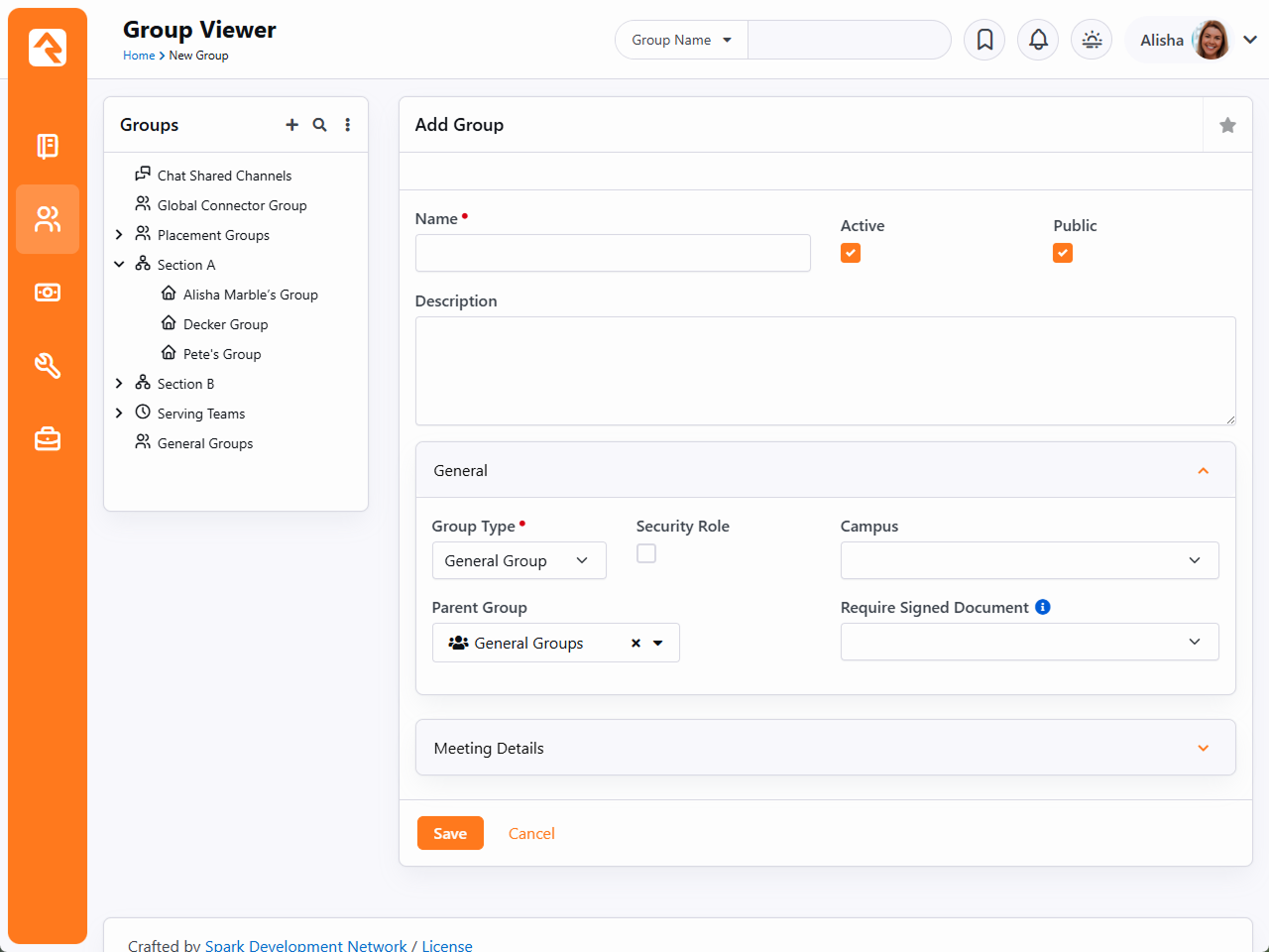 The group details section displays all of the information about the group. The group type and campus (if configured) will be shown as labels in the banner at the top. A map of the group’s location will also be shown, if configured.